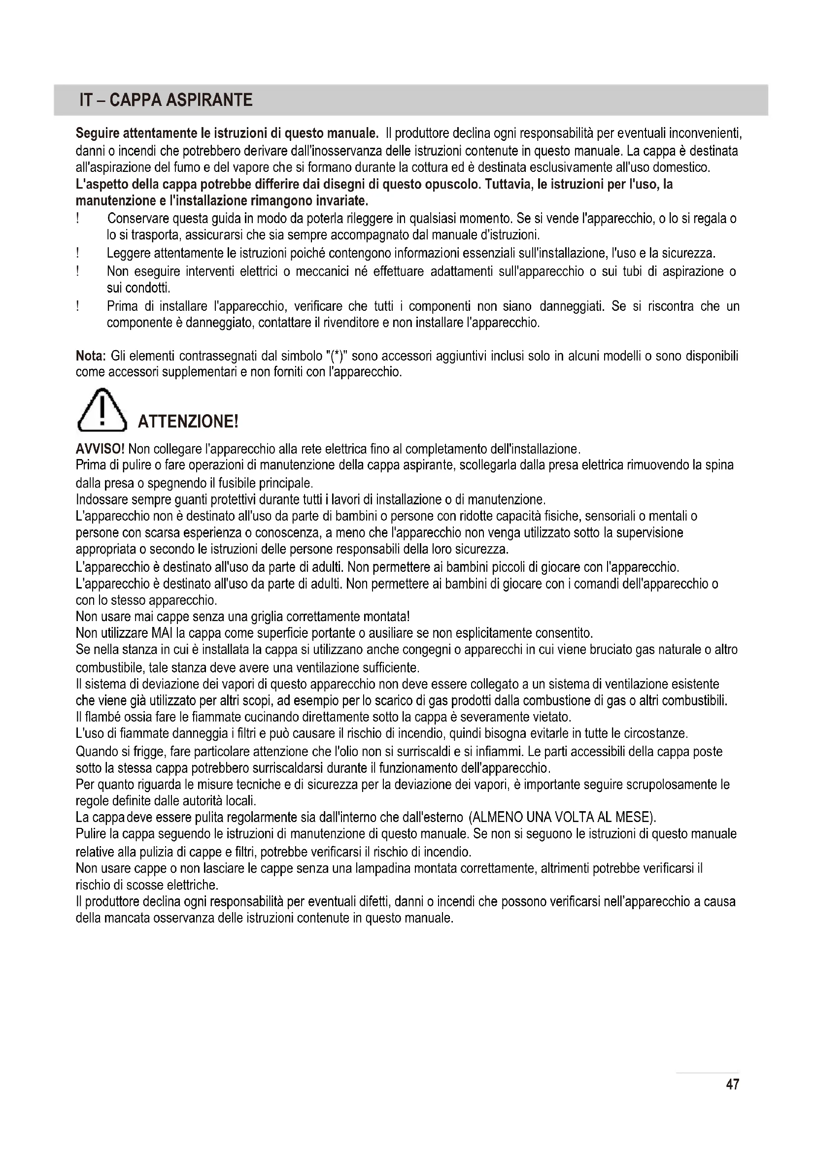 Conservare questa guida in modo da poterla rileggere in qualsiasi momento. Se si vende l'apparecchio, o lo si regala o lo si trasporta, assicur arsi che sia sempre accompagnato dal manuale d'istruzioni. Leggere attentamente le istruzioni poiché contengono informazioni essenziali sull'installazione, l'uso e la sicurezza. Non eseguire interventi elettrici o meccanici né effettuare adattamenti sull'apparecchio o sui tubi di aspirazione o sui condotti. Prima di installare l'apparecchio, verificare che tutti i componenti non siano danneggiati. Se si riscontra che un componente è danneggiato, contattare il rivenditore e non installare l'apparecchio. Nota: Gli elementi contrassegnati dal simbolo "(*)" sono accessori aggiuntivi inclusi solo in alcuni modelli o sono disponibili come accessori supplementari e non forniti con l'apparecchio. ATTENZIONE! AVVISO! Non collegare l'apparecchio alla rete elettrica fino al completamento dell'installazione.