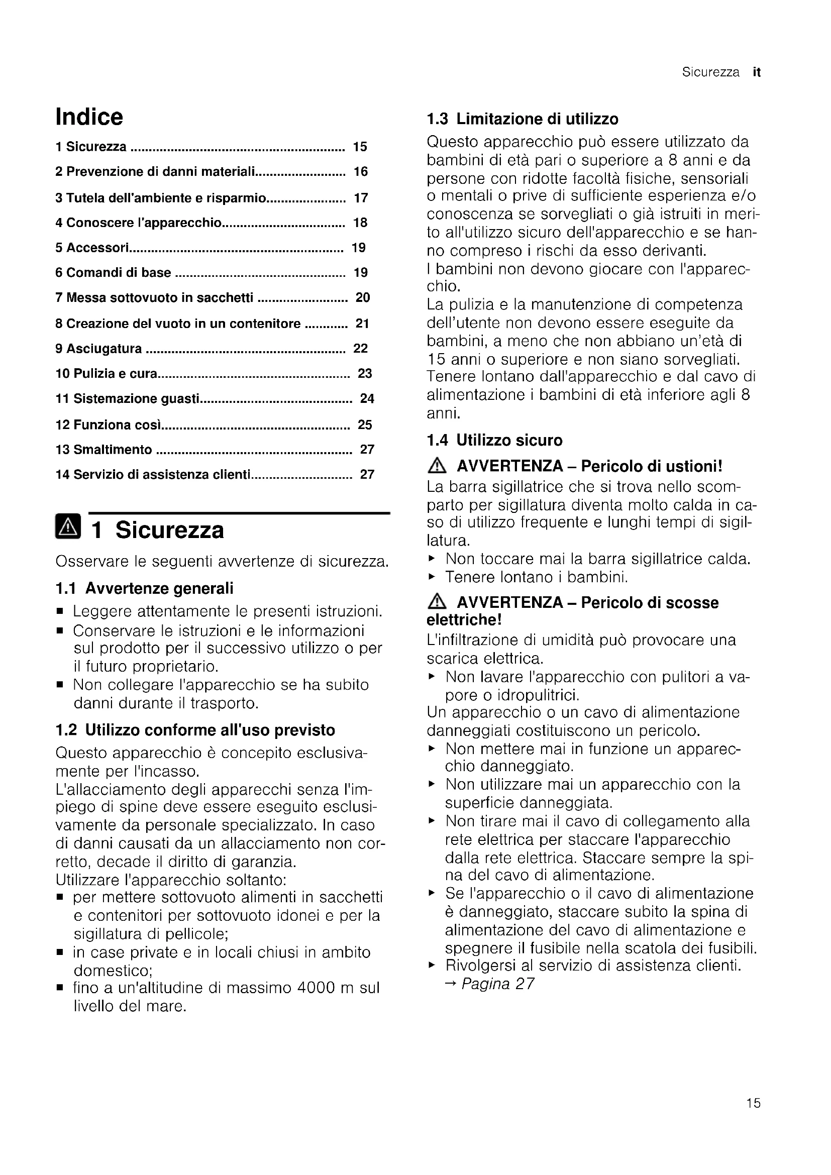 - 14 Servizio di assistenza clienti 1 Sicurezza Osservare le seguenti avvertenze di sicurezza. 1.1 Avvertenze generali ¡ Leggere attentamente le presenti istruzioni. ¡ Conservare le istruzioni e le informazioni sul prodotto per il successivo utilizzo o per il futuro proprietario. ¡ Non collegare l'apparecchio se ha subito danni durante il trasporto. 1.2 Utilizzo conforme all'uso previsto Questo apparecchio è concepito esclusiva- mente per l'incasso. L'allacciamento degli apparecchi senza l'im- piego di spine deve essere eseguito esclusi- vamente da personale specializzato. In caso di danni causati da un allacciamento non cor- retto, decade il diritto di garanzia. Utilizzare l'apparecchio soltanto: ¡ per mettere sottovuoto alimenti in sacchetti e contenitori per sottovuoto idonei e per la sigillatura di pellicole; ¡ in case private e in locali chiusi in ambito domestico; ¡ fino a un'altitudine di massimo 4000m sul livello del mare. 1.3 Limitazione di utilizzo Questo apparecchio può essere utilizzato da bambini di età pari o superiore a 8 anni e da persone con ridotte facoltà fisiche, sensoriali o mentali o prive di sufficiente esperienza e/o conoscenza se sorvegliati o già istruiti in meri- to all'utilizzo sicuro dell'apparecchio e se han- no compreso i rischi da esso derivanti. I bambini non devono giocare con l'apparec- chio. La pulizia e la manutenzione di competenza dell’utente non devono essere eseguite da bambini, a meno che non abbiano un’età di 15 anni o superiore e non siano sorvegliati. Tenere lontano dall'apparecchio e dal cavo di alimentazione i bambini di età inferiore agli 8 anni. 1.4 Utilizzo sicuro AVVERTENZA‒Pericolo di ustioni! La barra sigillatrice che si trova nello scom- parto per sigillatura diventa molto calda in ca- so di utilizzo frequente e lunghi tempi di sigil- latura. ▶ Non toccare mai la barra sigillatrice calda. ▶ Tenere lontano i bambini. AVVERTENZA‒Pericolo di scosse elettriche! L'infiltrazione di umidità può provocare una scarica elettrica. ▶ Non lavare l'apparecchio con pulitori a va- pore o idropulitrici. Un apparecchio o un cavo di alimentazione danneggiati costituiscono un pericolo. ▶ Non mettere mai in funzione un apparec- chio danneggiato. ▶ Non utilizzare mai un apparecchio con la superficie danneggiata. ▶ Non tirare mai il cavo di collegamento alla rete elettrica per staccare l'apparecchio dalla rete elettrica. Staccare sempre la spi- na del cavo di alimentazione. ▶ Se l'apparecchio o il cavo di alimentazione è danneggiato, staccare subito la spina di alimentazione del cavo di alimentazione e spegnere il fusibile nella scatola dei fusibili. ▶ Rivolgersi al servizio di assistenza clienti. p. 27
