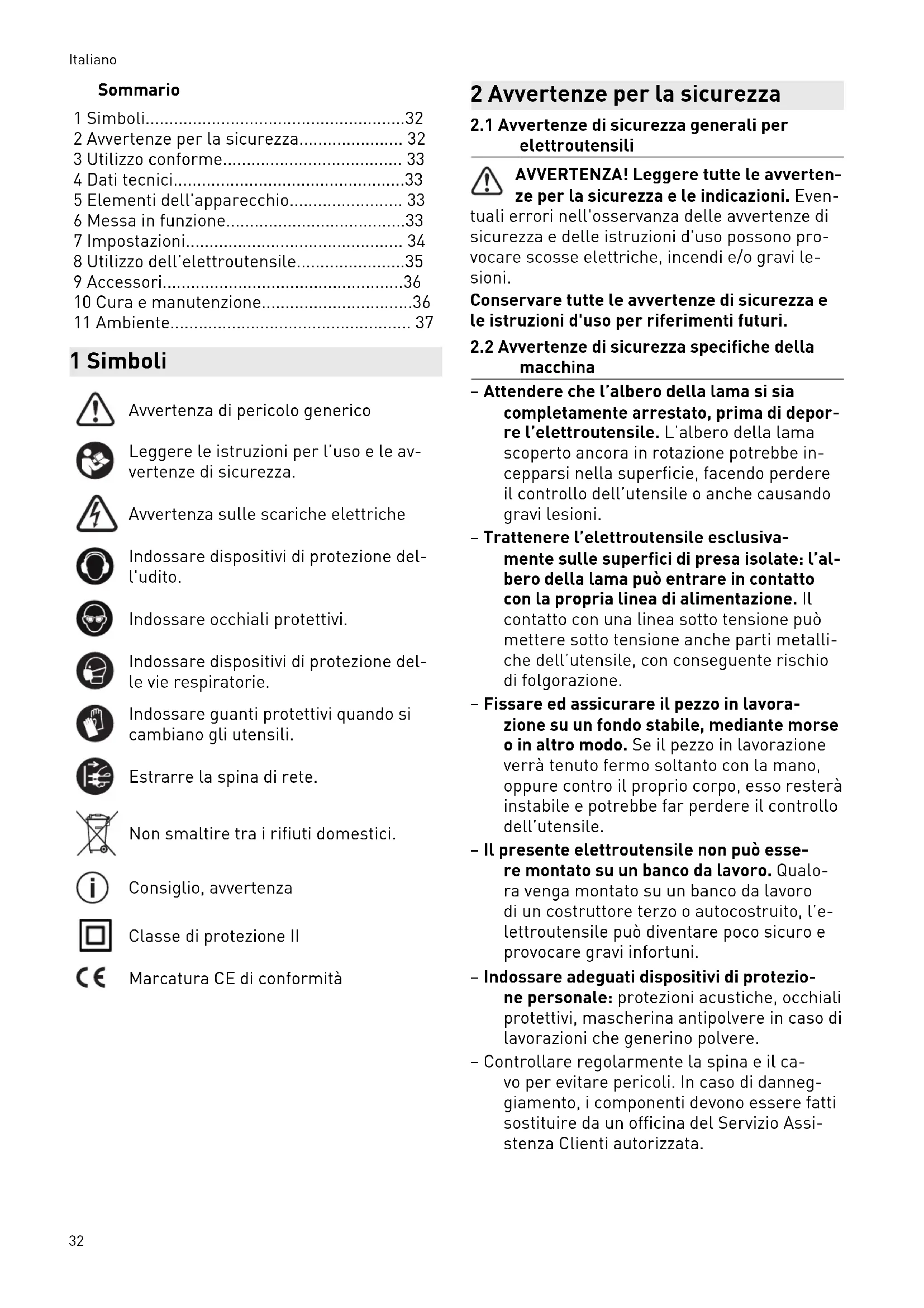 macchina – Attendere che l’albero della lama si sia completamente arrestato, prima di depor re l’elettroutensile. L’albero della lama scoperto ancora in rotazione potrebbe in cepparsi nella superficie, facendo perdere il controllo dell’utensile o anche causando gravi lesioni. – Trattenere l’elettroutensile esclusiva mente sulle superfici di presa isolate: l’al bero della lama può entrare in contatto con la propria linea di alimentazione. Il contatto con una linea sotto tensione può mettere sotto tensione anche parti metalli che dell’utensile, con conseguente rischio di folgorazione. – Fissare ed assicurare il pezzo in lavora zione su un fondo stabile, mediante morse o in altro modo. Se il pezzo in lavorazione verrà tenuto fermo soltanto con la mano, oppure contro il proprio corpo, esso resterà instabile e potrebbe far perdere il controllo dell’utensile. – Il presente elettroutensile non può esse re montato su un banco da lavoro. Qualo ra venga montato su un banco da lavoro di un costruttore terzo o autocostruito, l’e lettroutensile può diventare poco sicuro e provocare gravi infortuni. – Indossare adeguati dispositivi di protezio ne personale: protezioni acustiche, occhiali protettivi, mascherina antipolvere in caso di lavorazioni che generino polvere. – Controllare regolarmente la spina e il ca vo per evitare pericoli. In caso di danneg giamento, i componenti devono essere fatti sostituire da un officina del Servizio Assi stenza Clienti autorizzata. Italiano