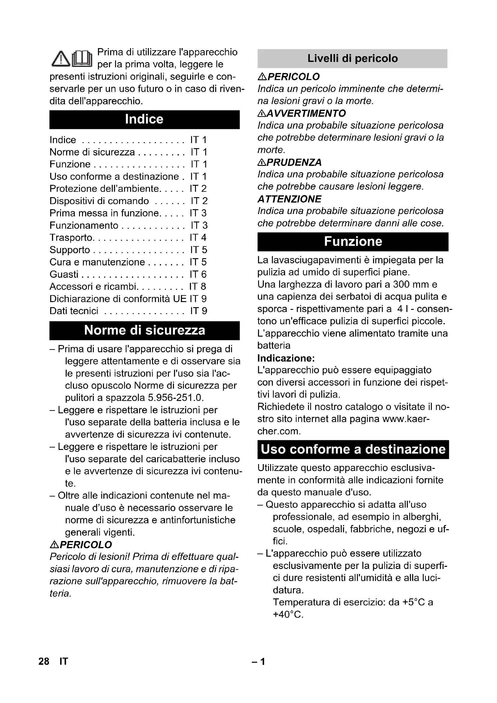 dB(A) 1 27FR– 1 Prima di utilizzare l'apparecchio per la prima volta, leggere le presenti istruzioni originali, seguirle e con- servarle per un uso futuro o in caso di riven- dita dell'apparecchio. – Prima di usare l'apparecchio si prega di leggere attentamente e di osservare sia le presenti istruzioni per l'uso sia l'ac- cluso opuscolo Norme di sicurezza per pulitori a spazzola 5.956-251.0. – Leggere e rispettare le istruzioni per l'uso separate della batteria inclusa e le avvertenze di sicurezza ivi contenute. – Leggere e rispettare le istruzioni per l'uso separate del caricabatterie incluso e le avvertenze di sicurezza ivi contenu- te. – Oltre alle indicazioni contenute nel ma- nuale d’uso è necessario osservare le norme di sicurezza e antinfortunistiche generali vigenti. PERICOLO Pericolo di lesioni! Prima di effettuare qual- siasi lavoro di cura, manutenzione e di ripa- razione sull'apparecchio, rimuovere la bat- teria. PERICOLO Indica un pericolo imminente che determi- na lesioni gravi o la morte. 몇 AVVERTIMENTO Indica una probabile situazione pericolosa che potrebbe determinare lesioni gravi o la morte. 몇 PRUDENZA Indica una probabile situazione pericolosa che potrebbe causare lesioni leggere. ATTENZIONE Indica una probabile situazione pericolosa che potrebbe determinare danni alle cose. La lavasciugapavimenti è impiegata per la pulizia ad umido di superfici piane. Una larghezza di lavoro pari a 300 mm e una capienza dei serbatoi di acqua pulita e sporca - rispettivamente pari a 4 l - consen- tono un'efficace pulizia di superfici piccole. L’apparecchio viene alimentato tramite una batteria Indicazione: L'apparecchio può essere equipaggiato con diversi accessori in funzione dei rispet- tivi lavori di pulizia. Richiedete il nostro catalogo o visitate il no- stro sito internet alla pagina www.kaer- cher.com. Utilizzate questo apparecchio esclusiva- mente in conformità alle indicazioni fornite da questo manuale d'uso. – Questo apparecchio si adatta all'uso professionale, ad esempio in alberghi, scuole, ospedali, fabbriche, negozi e uf- fici. – L'apparecchio può essere utilizzato esclusivamente per la pulizia di superfi- ci dure resistenti all'umidità e alla luci- datura. Temperatura di esercizio: da +5°C a +40°C. Indice Indice ... IT 1 Norme di sicurezza ... IT 1 Funzione ... IT 1 Uso conforme a destinazione . IT 1 Protezione dell’ambiente... IT 2 Dispositivi di comando ... IT 2 Prima messa in funzione... IT 3 Funzionamento ... IT 3 Trasporto... IT 4 Supporto ... IT 5 Cura e manutenzione ... IT 5 Guasti ... IT 6 Accessori e ricambi... IT 8 Dichiarazione di conformità UE IT 9 Dati tecnici ... IT 9 Norme di sicurezza Livelli di pericolo Funzione Uso conforme a destinazione 28 IT– 2 – L'apparecchio non si adatta alla pulizia di pavimenti gelati (per es. in magazzini frigoriferi). – L'apparecchio dev'essere equipaggiato solo da accessori e pezzi di ricambio originali. – L'apparecchio è stato concepito per la pulizia di pavimenti in ambienti interni ri- sp. di superfici coperte. – L'apparecchio non è previsto per la pu- lizia di percorsi pubblici di maggior uti- lizzo. – L'apparecchio non si adatta all'impiego in ambienti a rischio d'esplosione. Avvertenze sui contenuti (REACH) Informazioni aggiornate sui contenuti sono disponibili all'indirizzo: www.kaercher.com/REACH Figure riportate sulla copertina Figura 1 Maniglia 2 Interruttore pompa dell'acqua 3 Tasto modo spazzola/aspirazione 4 Maniglia trasporto 5 Maniglia di trasporto serbatoio acqua sporca 6 Serbatoio acqua sporca 7 Serbatoio acqua pulita 8 Chiusura serbatoio acqua pulita (aper- tura di riempimento) 9 Accumulatore 10 Alloggiamento della batteria 11 Testa di pulizia 12 Pedale sollevatore barra di aspirazione 13 Sblocco posizione d'arresto 14 Indicatore batteria Vedere le istruzioni per l'uso della batte- ria 15 Sbloccaggio accumulatore 16 Tasto di sbloccaggio, spazzola inter- cambiabile 17 Rullo della spazzola 18 Barra di aspirazione 19 Coperchio serbatoio acqua sporca 20 Chiusura coperchio serbatoio per l'ac- qua sporca 21 Indicatore di livello 22 Indicatore di carica della batteria 3 LED accesi: Capacità residua 100- 76% 2 LED accesi: Capacità residua 75-51% 1 LED acceso: Capacità residua 50- 26% 1 LED lampeggia: Meno del 26% di ca- pacità residua, caricare la batteria 23 Raccordo tubo / tubo flessibile di aspi- razione 24 Tubo rigido di aspirazione 25 Tubo flessibile di aspirazione Protezione dell’ambiente Tutti gli imballaggi sono riciclabili. Gli imballaggi non vanno gettati nei rifiuti domestici, ma conse- gnati ai relativi centri di raccolta. Gli apparecchi dismessi conten- gono materiali riciclabili preziosi e vanno consegnati ai relativi centri di raccolta. Sia le batterie che gli accumulatori contengono sostan- ze che non devono essere di- sperse nell’ambiente. Si prega quindi di smaltire gli apparecchi dismessi, le batterie e gli accu- mulatori mediante i sistemi di rac- colta differenziata. Gli apparecchi elettrici ed elettro- nici contengono spesso compo- nenti che, con un utilizzo o smal- timento non corretti, possono co- stituire un potenziale pericolo per la salute umana e per l'ambiente. Questi componenti sono tuttavia necessari per un corretto funzio- namento dell'apparecchio. Gli ap- parecchi contrassegnati con que- sto simbolo non devono essere smaltiti con i rifiuti domestici. Dispositivi di comando 29IT– 3 Figura Inserire il tubo all'estremità del manico nell'apertura presente sull'apparecchio. Premere Arresto e inserire il manico fino allo scatto all'interno dell'apparec- chio. Orientare il cavo nell'apparecchio ed applicare il coperchio come illustrato nel pieghevole. Caricare l'accumulatore. La relativa descrizione si trova nelle istruzioni per l'uso separate della batte- ria e del caricabatterie Figura Inserire la batteria carica nell’apposito alloggiamento, spingerla fino all’arresto e allo scatto in posizione. 몇 PRUDENZA Pericolo di danneg