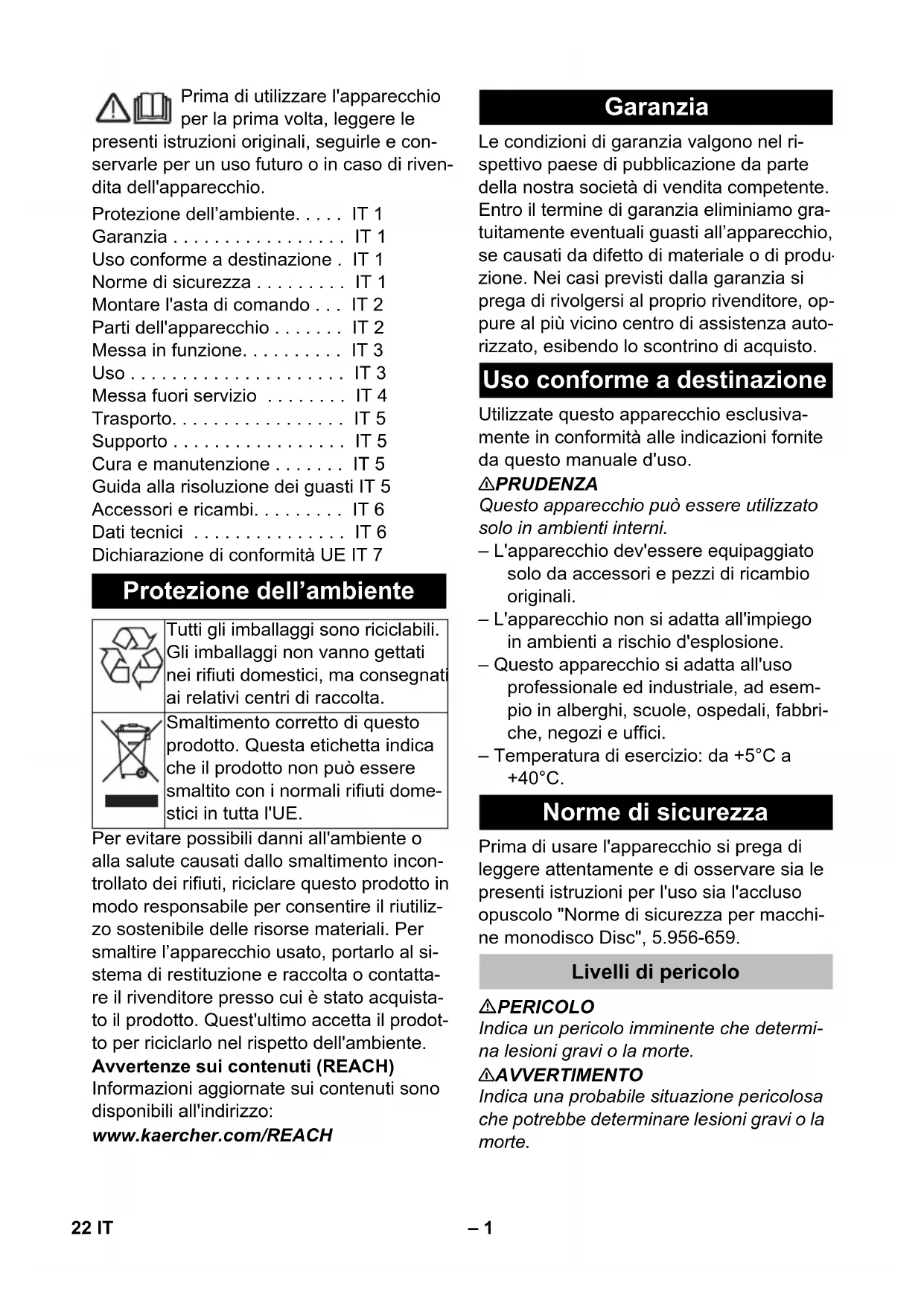 Chairman of the Board of Management Director Regulatory Affairs & Certification 21FR– 1 Prima di utilizzare l'apparecchio per la prima volta, leggere le presenti istruzioni originali, seguirle e con- servarle per un uso futuro o in caso di riven- dita dell'apparecchio. Per evitare possibili danni all'ambiente o alla salute causati dallo smaltimento incon- trollato dei rifiuti, riciclare questo prodotto in modo responsabile per consentire il riutiliz- zo sostenibile delle risorse materiali. Per smaltire l’apparecchio usato, portarlo al si- stema di restituzione e raccolta o contatta- re il rivenditore presso cui è stato acquista- to il prodotto. Quest'ultimo accetta il prodot- to per riciclarlo nel rispetto dell'ambiente. Avvertenze sui contenuti (REACH) Informazioni aggiornate sui contenuti sono disponibili all'indirizzo: www.kaercher.com/REACH Le condizioni di garanzia valgono nel ri- spettivo paese di pubblicazione da parte della nostra società di vendita competente. Entro il termine di garanzia eliminiamo gra- tuitamente eventuali guasti all’apparecchio, se causati da difetto di materiale o di produ- zione. Nei casi previsti dalla garanzia si prega di rivolgersi al proprio rivenditore, op- pure al più vicino centro di assistenza auto- rizzato, esibendo lo scontrino di acquisto. Utilizzate questo apparecchio esclusiva- mente in conformità alle indicazioni fornite da questo manuale d'uso. 몇 PRUDENZA Questo apparecchio può essere utilizzato solo in ambienti interni. – L'apparecchio dev'essere equipaggiato solo da accessori e pezzi di ricambio originali. – L'apparecchio non si adatta all'impiego in ambienti a rischio d'esplosione. – Questo apparecchio si adatta all'uso professionale ed industriale, ad esem- pio in alberghi, scuole, ospedali, fabbri- che, negozi e uffici. – Temperatura di esercizio: da +5°C a +40°C. Prima di usare l'apparecchio si prega di leggere attentamente e di osservare sia le presenti istruzioni per l'uso sia l'accluso opuscolo "Norme di sicurezza per macchi- ne monodisco Disc", 5.956-659. PERICOLO Indica un pericolo imminente che determi- na lesioni gravi o la morte. 몇 AVVERTIMENTO Indica una probabile situazione pericolosa che potrebbe determinare lesioni gravi o la morte. Protezione dell’ambiente. . . . . IT 1 Garanzia . . . . . . . . . . . . . . . . . IT 1 Uso conforme a destinazione . IT 1 Norme di sicurezza . . . . . . . . . IT 1 Montare l'asta di comando . . . IT 2 Parti dell'apparecchio . . . . . . . IT 2 Messa in funzione. . . . . . . . . . IT 3 Uso . . . . . . . . . . . . . . . . . . . . . IT 3 Messa fuori servizio . . . . . . . . IT 4 Trasporto. . . . . . . . . . . . . . . . . IT 5 Supporto . . . . . . . . . . . . . . . . . IT 5 Cura e manutenzione . . . . . . . IT 5 Guida alla risoluzione dei guasti IT 5 Accessori e ricambi. . . . . . . . . IT 6 Dati tecnici . . . . . . . . . . . . . . . IT 6 Dichiarazione di conformità UE IT 7 Protezione dell’ambiente Tutti gli imballaggi sono riciclabili. Gli imballaggi non vanno gettati nei rifiuti domestici, ma consegnati ai relativi centri di raccolta. Smaltimento corretto di questo prodotto. Questa etichetta indica che il prodotto non può essere smaltito con i normali rifiuti dome- stici in tutta l'UE. Garanzia Uso conforme a destinazione Norme di sicurezza Livelli di pericolo 22 IT– 2 몇 PRUDENZA Indica una probabile situazione pericolosa che potrebbe causare lesioni leggere. ATTENZIONE Indica una probabile situazione pericolosa che potrebbe determinare danni alle cose. I dispositivi di sicurezza servono alla prote- zione dell'utente e non devono essere mes- si fuori servizio o essere utilizzati al di fuori della loro funzione. Impedisce l'accensione accidentale dell’apparecchio. Per accendere l’apparec- chio, premere il tasto di sblocco, quindi l'in- terruttore ON/OFF. Prima della messa in funzione deve essere montata come illustrato l'asta di comando e realizzare il collegamento elettrico con l'ap- parecchio. Figura riportata sulla copertina L’illustrazione dell'apparecchio mostra l’ap- parecchio BDS 43/150 C Classic. L’appa- recchio BDS 43/Duo C differisce legger- mente da questo. 1 Trascinatore, spazzola a disco / piatto di azionamento del pad 2 Scopa/disco pad 3 Leva di dosaggio soluzione di detergen- te (opzione) 4 Interruttore ON/OFF 5 Gancio per cavo 6 Pulsante di sblocco 7 Impugnatura 8 Leva regolazione inclinazione 9 Fusibile azionamento spazzole 10 Presa per accessori 11 Serbatoio per detergente (opzione) 12 Corpo motore 13 Interruttore numero di giri delle spazzo- le (solo BDS 43/Duo C) ** non in dotazione Dispositivi di sicurezza Chiusura Montare l'asta di comando Parti dell'apparecchio