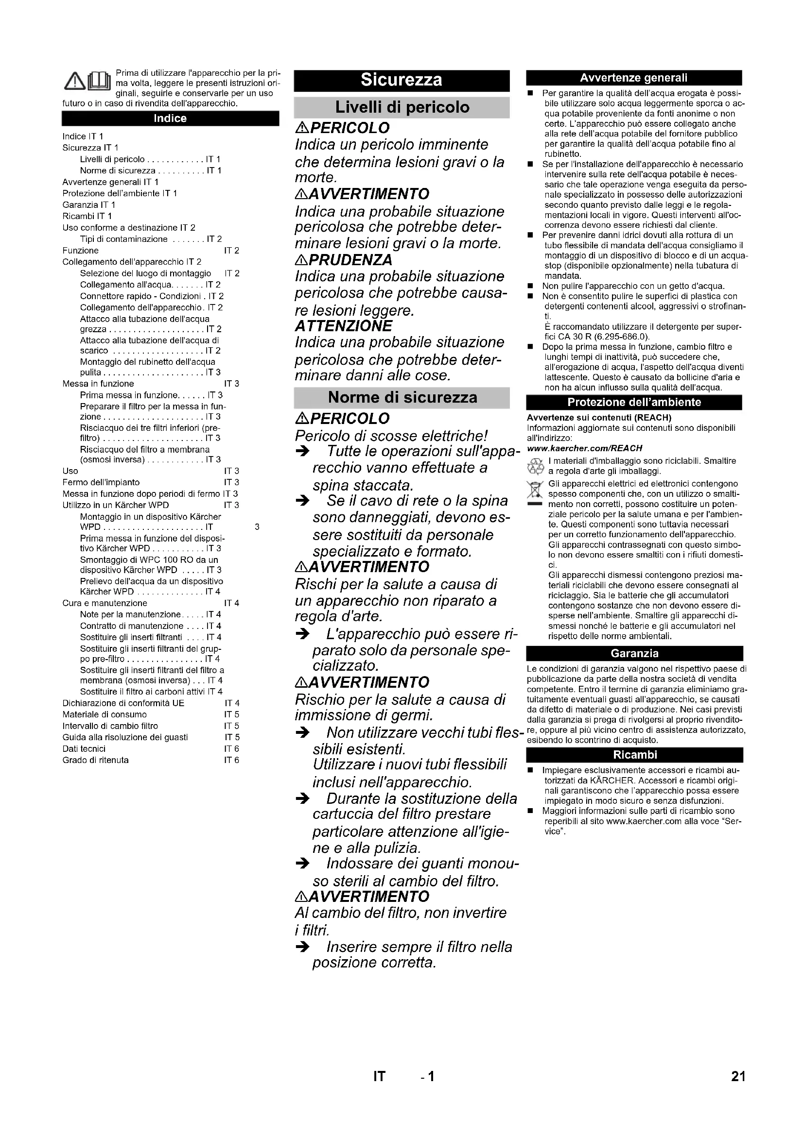 Chairman of the Board of ManagementDirector Regulatory Affairs & Certification 18 FR- 5 Matériel de consommation Désignation Description N° de réf. Filtre fin Premier niveau de filtration pour la retenue des particules d’impureté grossières 6 640-765.0 Filtre à charbon actif (granulés) Deuxième niveau de filtration pour la préséparation des substances nocives 6.640-766.0 Filtre à charbon actif (bloc) Troisième niveau de filtration pour la séparation fine des substances nocives 6.640-767.0 Filtre à membrane (osmose inversée) Quatrième niveau de filtration pour la désalinisation 6.640-783.0 Filtre supérieur à charbon actif Cinquième niveau de filtration pour assurer la neutralité du goût après l’osmose inversée 6.640-769.0 Intervalles de remplacement des filtres Filtre fin 3 - 6 Mois ou au besoin (voir le chapitre : « Assistance en cas de panne») Filtre à charbon actif (granulés) 6 - 12 Filtre à charbon actif (bloc) 6 - 12 Filtre à membrane (osmose inversée) 18 - 24 Filtre à charbon actif 6 - 12 Assistance en cas de panne Défaut Éventuelle cause Élimination Pas d’arrivée d'eau Fiche électrique pas branchée dans la prise électrique. Brancher la fiche secteur. Pas d’alimentation en eau Assurer l’alimentation en eau Pressostat de l’appareil défectueux Contacter le service. L'électrovalve est défectueuse Contacter le service. Faible arrivée d'eau La pompe ne démarre pas Contrôler la pompe. Soupape de dérivation ouverte Fermer la soupape à dérivation. Filtre fin bouché. Remplacer le filtre fin. Filtre à membrane (osmose inversée) bouché. Remplacer le filtre à membrane (osmose in- versée). La pompe ne s’arrête pas Pressostat en sortie de l’appareil défectueux. Contacter le service. La pompe ne démarre pas. Pressostat en sortie de l’appareil défectueux. Contacter le service. Filtre fin bouché. Remplacer le filtre fin. Pressostat à l’entrée défectueux. Contacter le service. Pas d’alimentation en eau Vérifier l’alimentation en eau. Fiche électrique pas branchée dans la prise électrique. Brancher la fiche secteur. Pompe défectueuse. Contacter le service. Sortie d'eau du boîtier du filtre Boîtier de filtre pas serré. Serrer fermement le boîtier du filtre. Joint torique du boîtier de filtre décalé ou défectueux Contrôler le joint torique, le mettre correcte- ment en place et le remplacer en cas de dom- mage. L’eau ne sort que par la conduite d’évacuation d’eau Soupape de dérivation ouverte. Fermer la soupape à dérivation. Filtre à membrane (osmose inversée) bouché. Remplacer le filtre à membrane (osmose in- versée). Pompe défectueuse. L’eau potable a un goût prononcé Filtre supérieur à charbon actif usagé. Remplacer le filtre à charbon actif supérieur. La pompe s’arrête et redémarre après un court instant. Fuite / perte d’eau / perte de pression dans l’appareil ou dans le système de câbles suivant. Bien serrer le corps de filtre. Fermer complètement le robinet d'eau. Chercher l’origine de la fuite et l’éliminer. Clapet anti-retour de l’appareil défectueux Contacter le service. 19FR- 6 Caractéristiques techniques WPC 100 RO Tension de service V/~/Hz 110...240/1/50-60 Puissance de raccordement W80 Protection minimale par fusible A6 Pression d'arrivée de l'eau MPa (bars) 0,1...0,3 (1...3) Température arrivée d'eau °C 5...45 Puissance du filtre l/h 70 Puissance du filtre (max) l/h 100 Température ambiante °C 5...45 Largeur mm 372 Profondeur mm 240 Hauteur mm 530 Poids (vide) kg 13,45 Poids, en état de service (rempli d’eau et avec accessoires) kg 17,86 Niveau de pression acoustique en mode normal dB(A) < 60 Agents actifs / homologations Tous les composants amenant l’eau potable sont adaptés pour un contact direct avec l’eau potable, conformé- ment aux règles générales reconnues de la technique. Degré de rétention Le degré de rétention des substances nocives chimiques, des pathogènes biologiques et des impuretés peut être déterminé à l’aide du tableau suivant (valeurs approxima- tives). La capacité de rétention réelle dépend du niveau de pollution ! Bactéries Degré de rétention jus- qu’à 99,99% Chlore Degré de rétention jus- qu’à 100% Sels (sodium, potassium, calcium...) Degré de rétention jus- qu’à 90% Aluminium Degré de rétention jus- qu’à 98% Arsenic Degré de rétention jus- qu’à 88% Métaux lourds (par exemple : plomb) Degré de rétention jus- qu’à 99% nitrate Degré de rétention jus- qu’à 50% Herbicides (glyphosate) Degré de rétention jus- qu’à 60% Résidus de médicaments Degré de rétention jus- qu’à 99,9% Résidus d’hormones Degré de rétention jus- qu’à 99,95% coloration Degré de rétention jus- qu’à 100% 20 FR- 1 Prima di utilizzare l'apparecchio per la pri-ma volta, leggere le presenti istruzioni ori-ginali, seguirle e conservarle per un uso futuro o in caso di rivendita dell'apparecchio. PERICOLO Indica un pericolo imminente che determina lesioni gravi o la morte. 몇 AVVERTIMENTO Indica una probabile situazione pericolosa che potrebbe deter- minare lesioni gravi o la morte. 몇 PRUDENZA Indica una probabile situazione pericolosa che potrebbe causa- re lesioni leggere. ATTENZIONE Indica una probabile situazione pericolosa che potrebbe deter- minare danni alle cose. PERICOLO Pericolo di scosse elettriche! Tutte le operazioni sull'appa- recchio vanno effettuate a spina staccata. Se il cavo di rete o la spina sono danneggiati, devono es- sere sostituiti da personale specializzato e formato. 몇 AVVERTIMENTO Rischi per la salute a causa di un apparecchio non riparato a regola d'arte. L'apparecchio può essere ri- parato solo da personale spe- cializzato. 몇 AVVERTIMENTO Rischio per la salute a causa di immissione di germi. Non utilizzare vecchi tubi fles- sibili esistenti. Utilizzare i nuovi tubi flessibili inclusi nell'apparecchio. Durante la sostituzione della cartuc