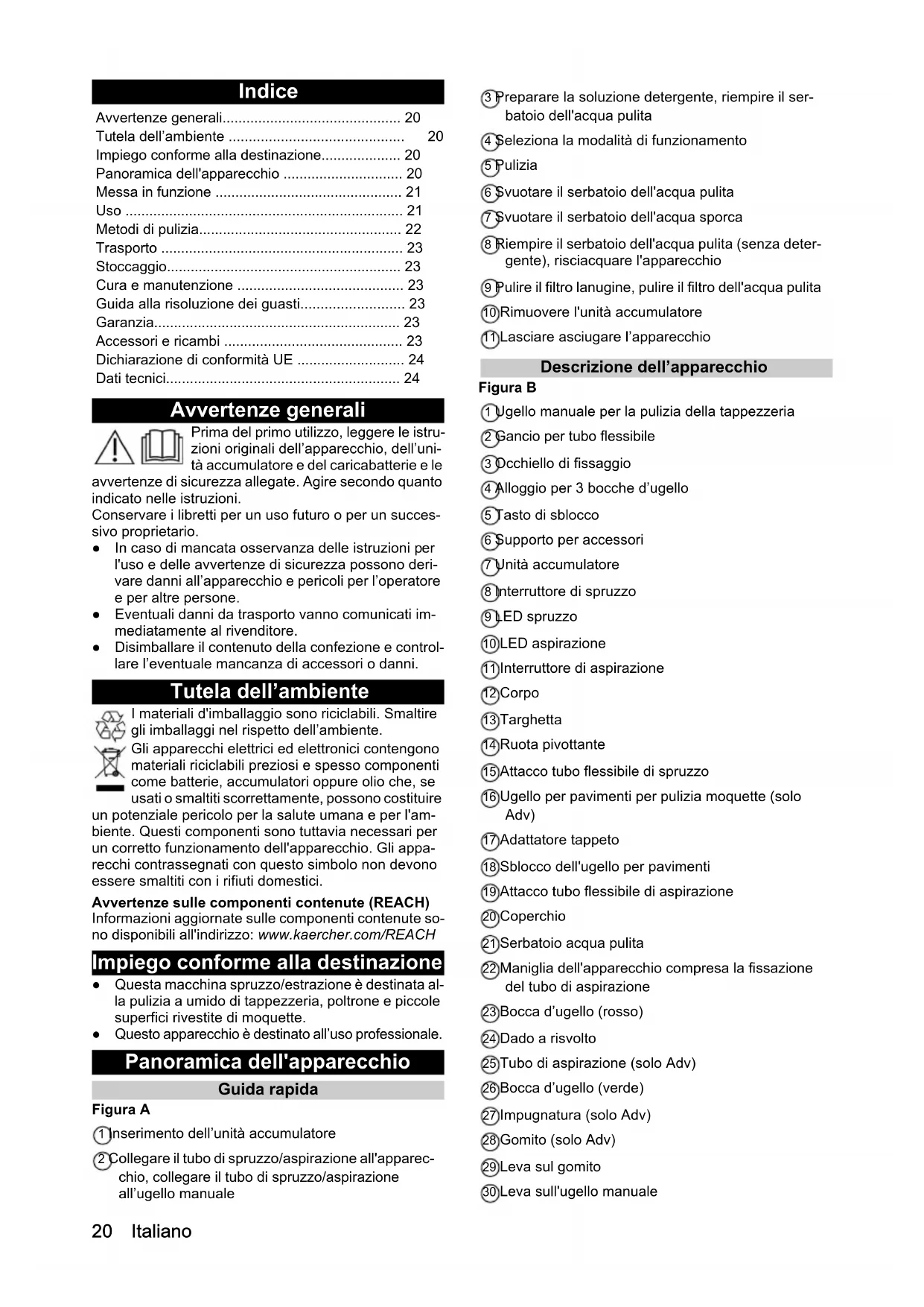 - 0,220 Italiano Indice Avvertenze generali Prima del primo utilizzo, leggere le istru- zioni originali dell’apparecchio, dell’uni- tà accumulatore e del caricabatterie e le avvertenze di sicurezza allegate. Agire secondo quanto indicato nelle istruzioni. Conservare i libretti per un uso futuro o per un succes- sivo proprietario. ● In caso di mancata osservanza delle istruzioni per l'uso e delle avvertenze di sicurezza possono deri- vare danni all’apparecchio e pericoli per l’operatore e per altre persone. ● Eventuali danni da trasporto vanno comunicati im- mediatamente al rivenditore. ● Disimballare il contenuto della confezione e control- lare l’eventuale mancanza di accessori o danni. Tutela dell’ambiente I materiali d'imballaggio sono riciclabili. Smaltire gli imballaggi nel rispetto dell’ambiente. Gli apparecchi elettrici ed elettronici contengono materiali riciclabili preziosi e spesso componenti come batterie, accumulatori oppure olio che, se usati o smaltiti scorrettamente, possono costituire un potenziale pericolo per la salute umana e per l'am- biente. Questi componenti sono tuttavia necessari per un corretto funzionamento dell'apparecchio. Gli appa- recchi contrassegnati con questo simbolo non devono essere smaltiti con i rifiuti domestici. Avvertenze sulle componenti contenute (REACH) Informazioni aggiornate sulle componenti contenute so- no disponibili all'indirizzo: www.kaercher.com/REACH Impiego conforme alla destinazione ● Questa macchina spruzzo/estrazione è destinata al- la pulizia a umido di tappezzeria, poltrone e piccole superfici rivestite di moquette. ● Questo apparecchio è destinato all’uso professionale. Panoramica dell'apparecchio Guida rapida Figura A 1 Inserimento dell’unità accumulatore 2 Collegare il tubo di spruzzo/aspirazione all'apparec- chio, collegare il tubo di spruzzo/aspirazione all’ugello manuale 3 Preparare la soluzione detergente, riempire il ser- batoio dell'acqua pulita 4 Seleziona la modalità di funzionamento 5 Pulizia 6 Svuotare il serbatoio dell'acqua pulita 7 Svuotare il serbatoio dell'acqua sporca 8 Riempire il serbatoio dell'acqua pulita (senza deter- gente), risciacquare l'apparecchio 9 Pulire il filtro lanugine, pulire il filtro dell'acqua pulita 10 Rimuovere l'unità accumulatore 11 Lasciare asciugare l’apparecchio Descrizione dell’apparecchio Figura B 1 Ugello manuale per la pulizia della tappezzeria 2 Gancio per tubo flessibile 3 Occhiello di fissaggio 4 Alloggio per 3 bocche d’ugello 5 Tasto di sblocco 6 Supporto per accessori 7 Unità accumulatore 8 Interruttore di spruzzo 9 LED spruzzo 10 LED aspirazione 11 Interruttore di aspirazione 12 Corpo 13 Targhetta 14 Ruota pivottante 15 Attacco tubo flessibile di spruzzo 16 Ugello per pavimenti per pulizia moquette (solo Adv) 17 Adattatore tappeto 18 Sblocco dell'ugello per pavimenti 19 Attacco tubo flessibile di aspirazione 20 Coperchio 21 Serbatoio acqua pulita 22 Maniglia dell'apparecchio compresa la fissazione del tubo di aspirazione 23 Bocca d’ugello (rosso) 24 Dado a risvolto 25 Tubo di aspirazione (solo Adv) 26 Bocca d’ugello (verde) 27 Impugnatura (solo Adv) 28 Gomito (solo Adv) 29 Leva sul gomito 30 Leva sull'ugello manuale Avvertenze generali p. 20