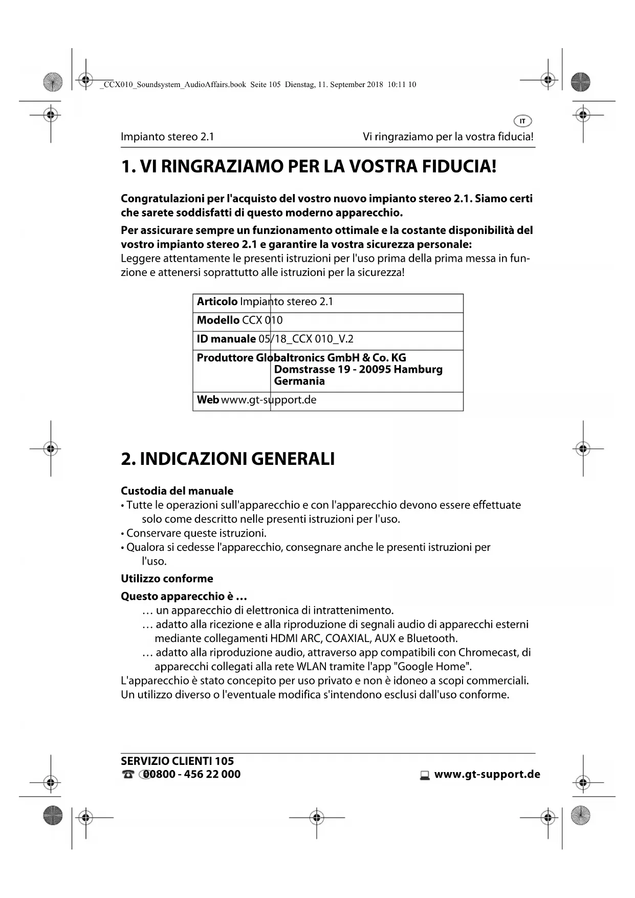- Qualora si cedesse l'apparecchio, consegnare anche le presenti istruzioni per l'uso. Utilizzo conforme Questo apparecchio è … … un apparecchio di elettronica di intrattenimento. … adatto alla ricezione e alla riproduzione di segnali audio di apparecchi esterni mediante collegamenti HDMI ARC, COAXIAL, AUX e Bluetooth. … adatto alla riproduzione audio, attraverso app compatibili con Chromecast, di apparecchi collegati alla rete WLAN tramite l'app "Google Home". L'apparecchio è stato concepito per uso privato e non è idoneo a scopi commerciali. Un utilizzo diverso o l'eventuale modifica s'intendono esclusi dall'uso conforme. Articolo Impianto stereo 2.1 Modello CCX 010 ID manuale 05/18_CCX 010_V.2 Produttore Globaltronics GmbH & Co. KG Domstrasse 19 - 20095 Hamburg Germania Web www.gt-support.de _CCX010_Soundsystem_AudioAffairs.book Seite 105 Dienstag, 11. September 2018 10:11 10Indicazioni generali Impianto stereo 2.1