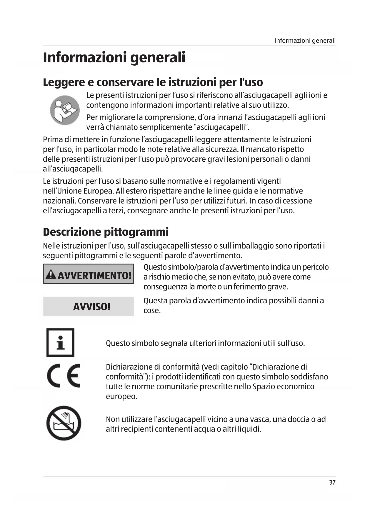 Informazioni generali Leggere e conservare le istruzioni per l‘uso Le presenti istruzioni per l’uso si riferiscono all’asciugacapelli agli ioni e contengono informazioni importanti relative al suo utilizzo. Per migliorare la comprensione, d’ora innanzi l’asciugacapelli agli ioni verrà chiamato semplicemente “asciugacapelli”. Prima di mettere in funzione l’asciugacapelli leggere attentamente le istruzioni per l’uso, in particolar modo le note relative alla sicurezza. Il mancato rispetto delle presenti istruzioni per l’uso può provocare gravi lesioni personali o danni all’asciugacapelli. Le istruzioni per l’uso si basano sulle normative e i regolamenti vigenti nell’Unione Europea. All’estero rispettare anche le linee guida e le normative nazionali. Conservare le istruzioni per l’uso per utilizzi futuri. In caso di cessione ell’asciugacapelli a terzi, consegnare anche le presenti istruzioni per l’uso. Descrizione pittogrammi Nelle istruzioni per l’uso, sull’asciugacapelli stesso o sull’imballaggio sono riportati i seguenti pittogrammi e le seguenti parole d’avvertimento. AVVERTIMENTO! Questo simbolo/parola d’avvertimento indica un pericolo a rischio medio che, se non evitato, può avere come conseguenza la morte o un ferimento grave. AVVISO! Questa parola d’avvertimento indica possibili danni a cose. Questo simbolo segnala ulteriori informazioni utili sull’uso. Dichiarazione di conformità (vedi capitolo “Dichiarazione di conformità”): i prodotti identificati con questo simbolo soddisfano tutte le norme comunitarie prescritte nello Spazio economico europeo. Non utilizzare l’asciugacapelli vicino a una vasca, una doccia o ad altri recipienti contenenti acqua o altri liquidi. Buch_CH_ProfHaartrockner .indb 37Buch_CH_ProfHaartrockner .indb 37 14.09.2021 11:10:4614.09.2021 11:10:46Sicurezza