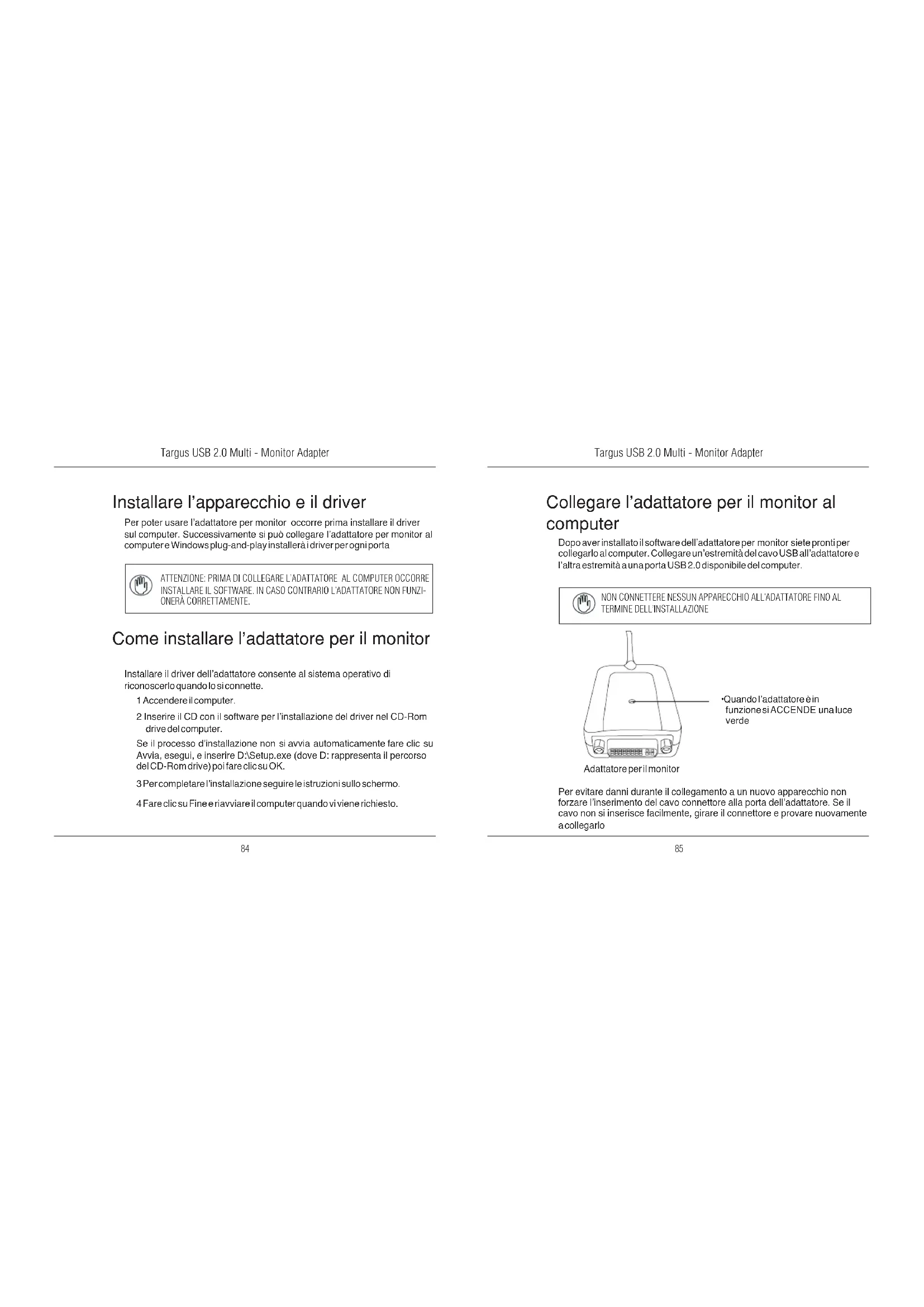 - Quando l’adattatore è in funzione si ACCENDE una luce verde Per evitare danni durante il collegamento a un nuovo apparecchio non forzare l’inserimento del cavo connettore alla porta dell’adattatore. Se il cavo non si inserisce facilmente, girare il connettore e provare nuovamente a collegarloTargus USB 2.0 Multi - Monitor Adapter