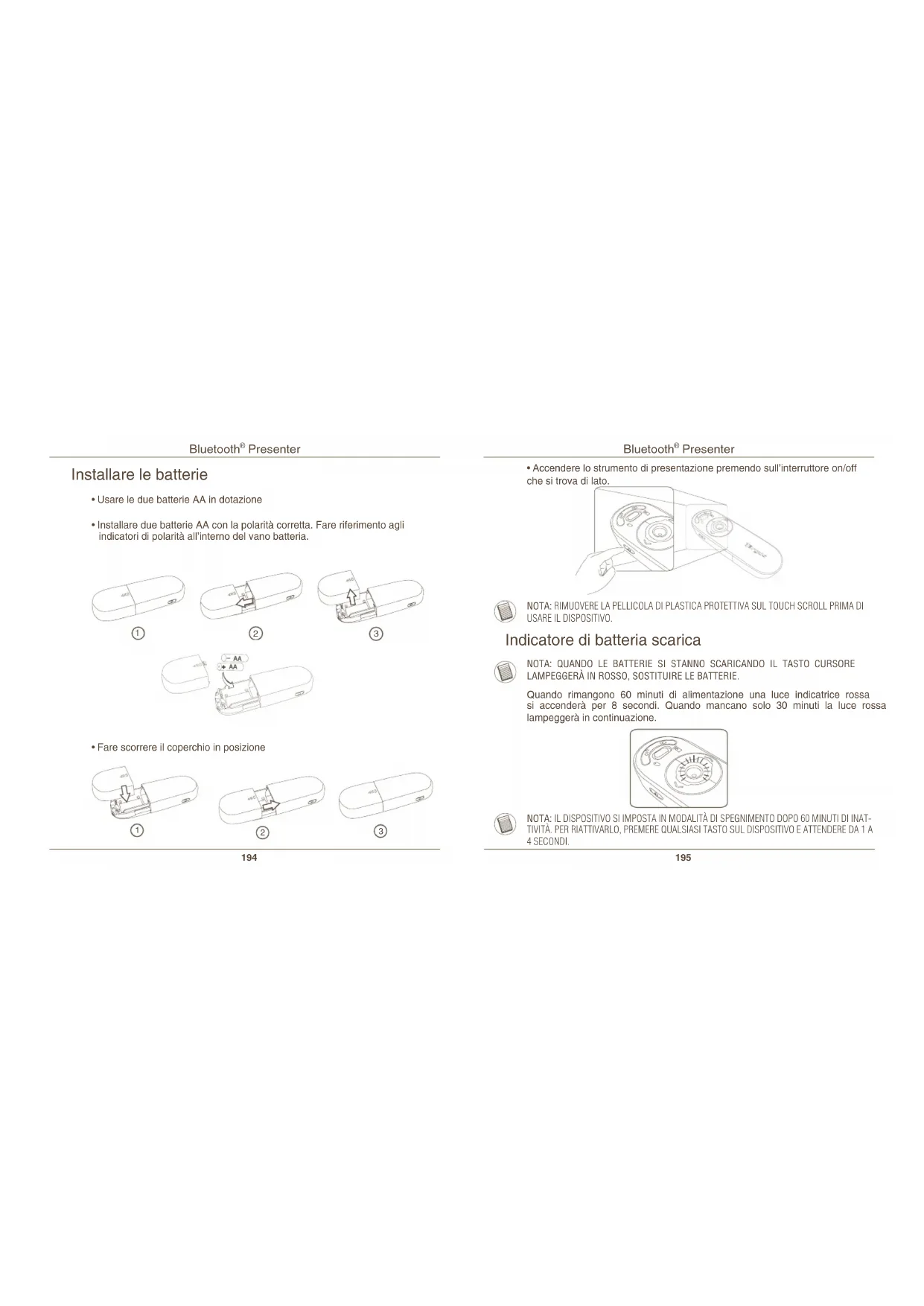 l’impostazione. Il presentatore dovrà essere in modalità “discovery” (scoperta) per collegarsi. Innanzitutto, accendere il presentatore premendo il tasto “on/off” per 3 secondi. Quindi entro 3 secondi dopo l’accensione, premere qualsiasi pulsante una volta (tranne il pulsante “on/off”) per accedere alla modalità discovery. Il LED nel Touch Scroll lampeggerà in modo continuo ad indicare che la modalità“discovery” è stata attivata. Configurazione iniziale NOTA: USARE IL DRIVER PIÙ RECENTE PER LA PERIFERICA BLUETOOTH. LE ISTRUZIONI SULLO SCHERMO POSSONO VARIARE A SECONDA DELLA VERSIONE DEL DRIVER DELLA PERIFERICA BLUETOOTH. Prima di poter iniziare a usare il mouse Bluetooth occorre portare a compimento alcuni passaggi d’impostazione iniziale. Bluetooth Software: Mac