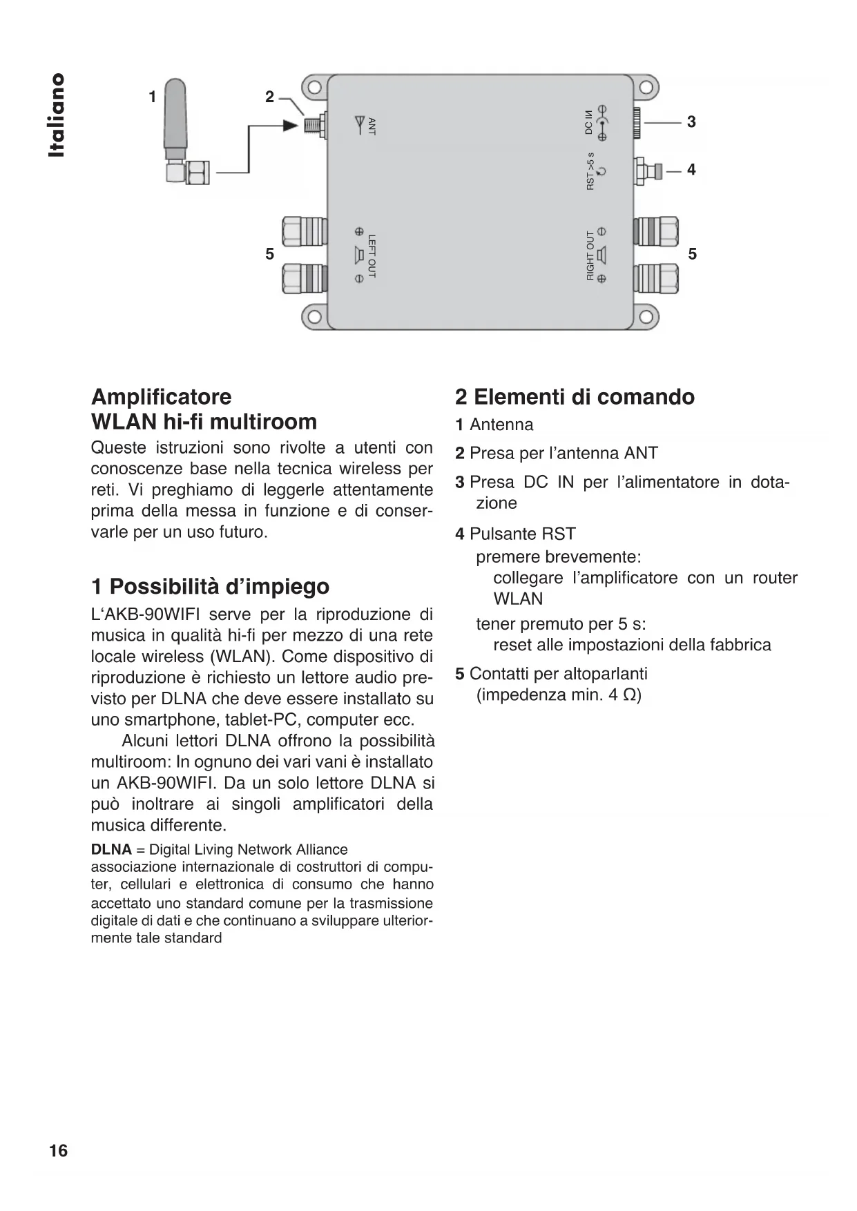 Amplificatore WLAN hi-fi multiroom Queste istruzioni sono rivolte a utenti con conoscenze base nella tecnica wireless per reti. Vi preghiamo di leggerle attentamente prima della messa in funzione e di conser- varle per un uso futuro. 1 Possibilità dʼimpiego LʻAKB-90WIFI serve per la riproduzione di musica in qualità hi-fi per mezzo di una rete locale wireless (WLAN). Come dispositivo di riproduzione è richiesto un lettore audio pre- visto per DLNA che deve essere installato su uno smartphone, tablet-PC, computer ecc. Alcuni lettori DLNA offrono la possibilità multiroom: In ognuno dei vari vani è installato un AKB-90WIFI. Da un solo lettore DLNA si può inoltrare ai singoli amplificatori della musica differente. DLNA = Digital Living Network Alliance associazione internazionale di costruttori di compu- ter, cellulari e elettronica di consumo che hanno accettato uno standard comune per la trasmissione digitale di dati e che continuano a sviluppare ulterior- mente tale standard 2 Elementi di comando 1 Antenna 2 Presa per lʼantenna ANT 3 Presa DC IN per lʼalimentatore in dota- zione 4 Pulsante RST premere brevemente: collegare lʼamplificatore con un router WLAN tener premuto per 5 s: reset alle impostazioni della fabbrica 5 Contatti per altoparlanti (impedenza min. 4 Ω) LEFT OUTRST >5 s ANT