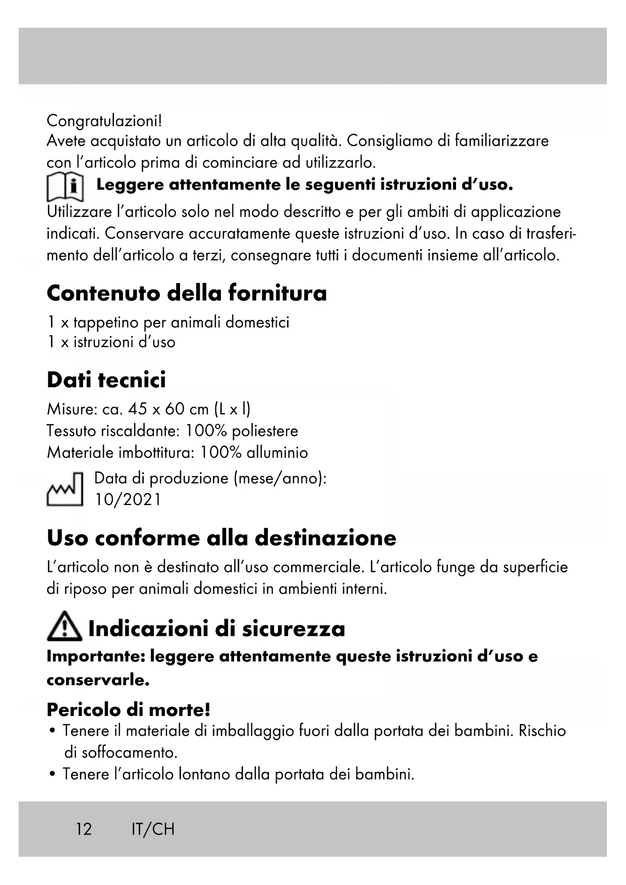 - Utilizzare l’articolo solo per lo scopo previsto. Uso L’articolo dispone di una superficie riscaldante. Nota: la superficie riscaldante contiene una lamina che emette un rumore scricchiolante. Questa speciale lamina riflette il calore corporeo del cane. Conservazione, pulizia In caso di mancato utilizzo, riporre l’articolo a temperatura ambiente in un luogo asciutto e pulito. Scuotere regolarmente l’articolo e pulirlo con l’aspirapolvere. Non utilizzare detergenti aggressivi per la pulizia. Lo sporco più consistente può essere rimosso con un panno umido. Per una migliore pulizia dell’articolo, è possibile aprire la cerniera e rimuovere il cuscino interno. Dopo la pulizia lasciare asciugare completamente e inserire di nuovo il cuscino interno. Il rivestimento è lavabile con ciclo per i delicati a 30 °C.14 Smaltimento Smaltire l’articolo e i materiali dell’imballaggio in conformità con le direttive locali in vigore. I materiali di imballaggio, come ad esempio le pellicole, non devono essere alla portata dei bambini. Conservare i materiali di imballag- gio in un luogo non raggiungibile per i bambini. Smaltire i prodotti e gli imballaggi in modo ecologico. Il codice di riciclaggio ha lo scopo di contrassegnare i diversi materiali al fine di introdurli nel ciclo di riutilizzo (recycling). Il codice è composto dal simbolo del riciclo, che dovrebbe rappresentare il ciclo del riutilizzo, e un numero che indica di che materiale si tratta. Avvertenze sulla garanzia e sulla gestione dei servizi di assistenza L’articolo è stato prodotto con la massima cura e sotto un continuo controllo. DELTA-SPORT HANDELSKONTOR GmbH concede ai clienti finali privati, su questo articolo, tre anni di garanzia dalla data di acquisto (termine di garanzia) sulla base delle seguenti disposizioni. La garanzia vale solo per i vizi di materiale e di lavorazione. La garanzia non si estende alle parti soggette ad un normale degradamento e che siano quindi da considerarsi come pezzi soggetti ad usura (ad es. le batterie) né ai pezzi fragili come ad es. interruttori, batterie ricaricabili oppure pezzi in vetro. IT/CH15IT/CH Dalla presente garanzia sono escluse le richieste legate a casi di utilizzo non conforme oppure di abuso dell’articolo, oppure di utilizzo avvenuto non nell’ambito delle condizioni previste oppure del campo di impiego previsto, oppure in caso di non osservanza delle direttive riportate nelle istruzioni d’uso, a meno che il cliente non dimostri che sussista un vizio di materiale o di lavorazione che non sia riconducibile ad una delle circostanze riportate sopra. Le richieste di garanzia possono essere avanzate solo entro il relativo termine, su presentazione dello scontrino originale di acquisto. Si prega quindi di conservare lo scontrino originale. Il termine di garanzia non sarà prolungato a seguito di eventuali riparazioni effettuate sulla base della ga- ranzia, della garanzia obbligatoria prevista per legge oppure di accondis- cendenza. Ciò vale anche per le parti sostituite oppure riparate. In caso di contestazione rivolgersi dapprima alla hotline di assistenza sotto indicata oppure mettersi in contatto con noi via e-mail. Laddove sussista un caso coperto dalla garanzia, l’articolo sarà – a nostra discrezione – da noi riparato gratuitamente, sostituito oppure sarà rimborsato il prezzo di acqui- sto. Non sussistono ulteriori diritti derivanti dalla garanzia. I vostri diritti giuridici, in particolare i diritti di garanzia obbligatoria prevista dalla legge nei confronti del relativo venditore, non sono limitati dalla presen- te garanzia. IAN: 373701_2104 Assistenza Svizzera Tel.: 0842 665566 (0,08 CHF/Min., telefonia mobile max. 0,40 CHF/Min.) E-Mail: deltasport@lidl.ch16 Congratulations! You have chosen to purchase a high-quality product. Familiarise yourself with the product before using it for the first time. Read the following instructions for use carefully. Use the product only as described and only for the given areas of applica- tion. Store these instructions for use carefully. When passing the product on to third parties, please also hand over all accompanying documents. Package contents 1 x pet mat 1 x instructions for use Technical data Dimensions: approx. 45 x 60cm (L x W) Warming fabric material: 100% polyester Stuffing material: 100% aluminium Date of manufacture (month/year): 10/2021 Intended use The product is not intended for commercial use. The product serves as an indoor bed for pets. Safety information Important: read these instructions for use carefully and keep them in a safe place! Life-threatening hazard!