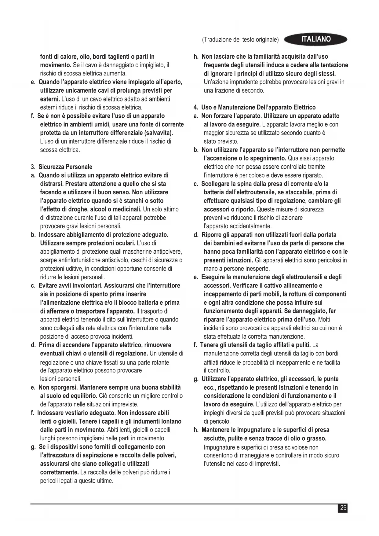 a. Non forzare l’apparato. Utilizzare un apparato adatto al lavoro da eseguire. L’apparato lavora meglio e con maggior sicurezza se utilizzato secondo quanto è stato previsto. b. Non utilizzare l’apparato se l’interruttore non permette l’accensione o lo spegnimento. Qualsiasi apparato elettrico che non possa essere controllato tramite l’interruttore è pericoloso e deve essere riparato. c. Scollegare la spina dalla presa di corrente e/o la batteria dall’elettroutensile, se staccabile, prima di effettuare qualsiasi tipo di regolazione, cambiare gli accessori o riporlo. Queste misure di sicurezza preventive riducono il rischio di azionare l’apparato accidentalmente. d. Riporre gli apparati non utilizzati fuori dalla portata dei bambini ed evitarne l’uso da parte di persone che hanno poca familiarità con l’apparato elettrico e con le presenti istruzioni. Gli apparati elettrici sono pericolosi in mano a persone inesperte. e. Eseguire la manutenzione degli elettroutensili e degli accessori. Vericare il cattivo allineamento e inceppamento di parti mobili, la rottura di componenti e ogni altra condizione che possa inuire sul funzionamento degli apparati. Se danneggiato, far riparare l’apparato elettrico prima dell’uso. Molti incidenti sono provocati da apparati elettrici su cui non è stata effettuata la corretta manutenzione. f. Tenere gli utensili da taglio aflati e puliti. La manutenzione corretta degli utensili da taglio con bordi aflati riduce le probabilità di inceppamento e ne facilita il controllo. g. Utilizzare l’apparato elettrico, gli accessori, le punte ecc., rispettando le presenti istruzioni e tenendo in considerazione le condizioni di funzionamento e il lavoro da eseguire. L’utilizzo dell’apparato elettrico per impieghi diversi da quelli previsti può provocare situazioni di pericolo. h. Mantenere le impugnature e le superci di presa asciutte, pulite e senza tracce di olio o grasso. Impugnature e superci di presa scivolose non consentono di maneggiare e controllare in modo sicuro l’utensile nel caso di imprevisti.30 (Traduzione del testo originale) ITALIANO