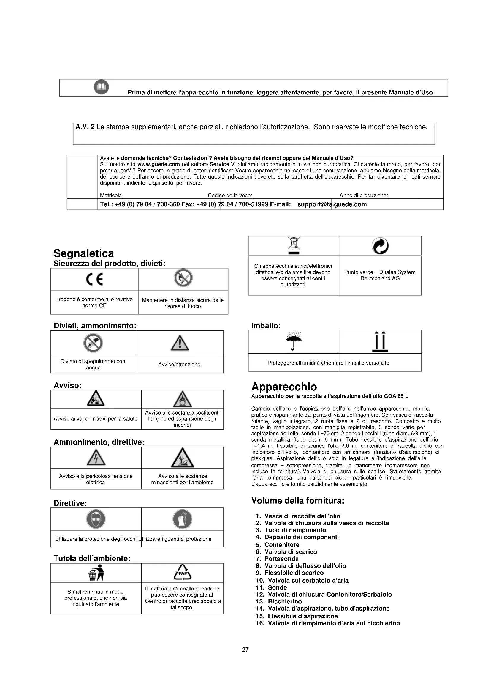 Prima di mettere l’apparecchio in funzione, leggere attentamente, per favore, il presente Manuale d’Uso A.V. 2 Le stampe supplementari, anche parziali, richiedono l’autorizzazione. Sono riservate le modifiche tecniche. Avete le domande tecniche? Contestazioni? Avete bisogno dei ricambi oppure del Manuale d’Uso? Sul nostro sito www.guede.com nel settore Service Vi aiutiamo rapidamente e in via non burocratica. Ci dareste la mano, per favore, per poter aiutarVi? Per essere in grado di poter identificare Vostro apparecchio nel caso di una contestazione, abbiamo bisogno della matricola, del codice e dell'anno di produzione. Tutte queste indicazioni troverete sulla targhetta dell’apparecchio. Per far diventare tali dati sempre disponibili, indicatene qui sotto, per favore. Matricola:____________________________Codice della voce:_____________________________Anno di produzione:_________________ Tel.: +49 (0) 79 04 / 700-360 Fax: +49 (0) 79 04 / 700-51999 E-mail: support@ts.guede.com 2717. Manometro Istruzioni di sicurezza generali Prima di utilizzare l’apparecchio, è necessario leggere completamente il Manuale d’Uso. Nel caso dei dubbi sulla connessione e manovra dell’apparecchio, rivolgersi al costruttore (Centro d’Assistenza).