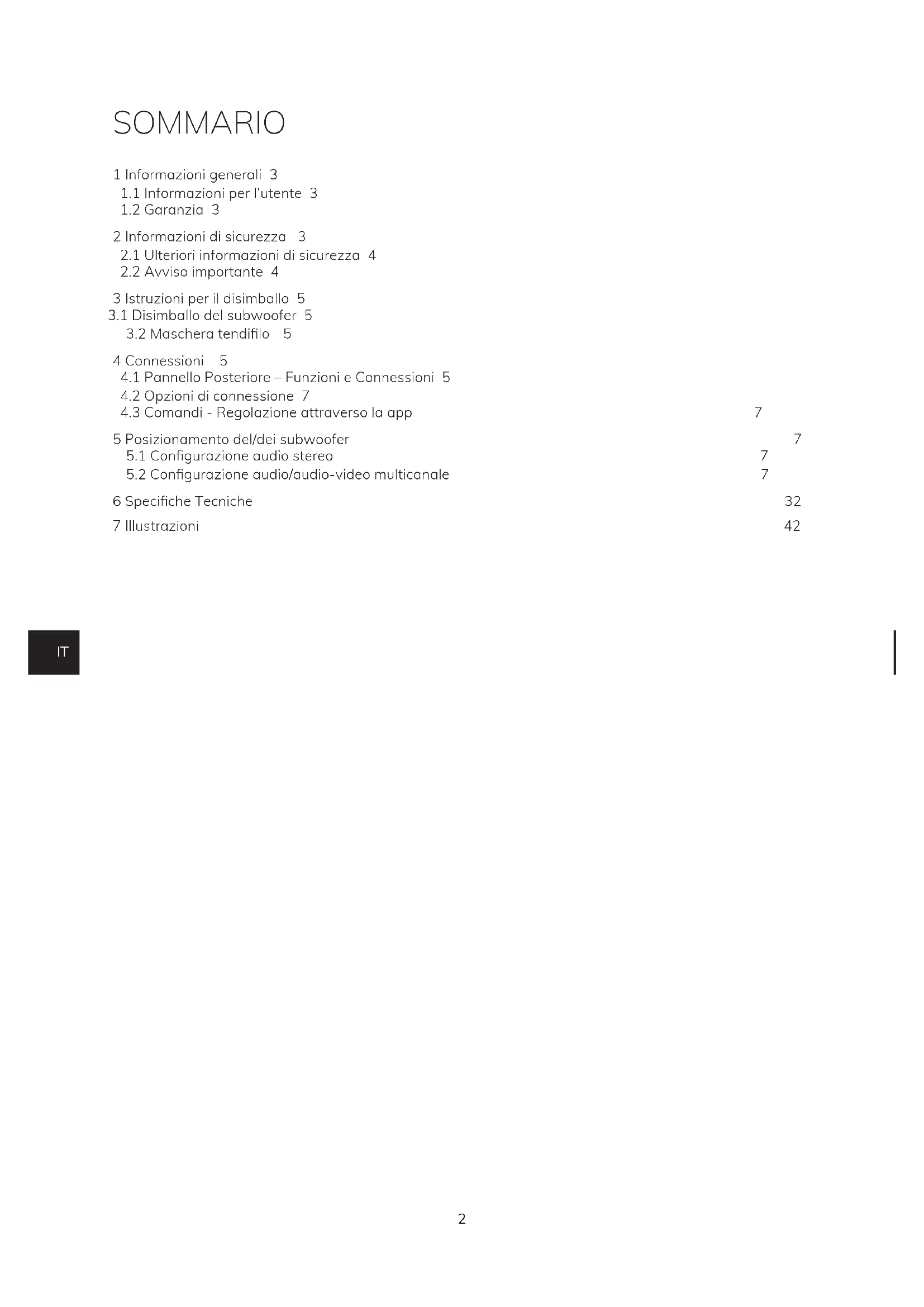 5 Posizionamento del/dei subwoofer 7 5.1Congurazioneaudiostereo 7 5.2Congurazioneaudio/audio-videomulticanale 7 6SpecicheTecniche 32 7 Illustrazioni 42IT