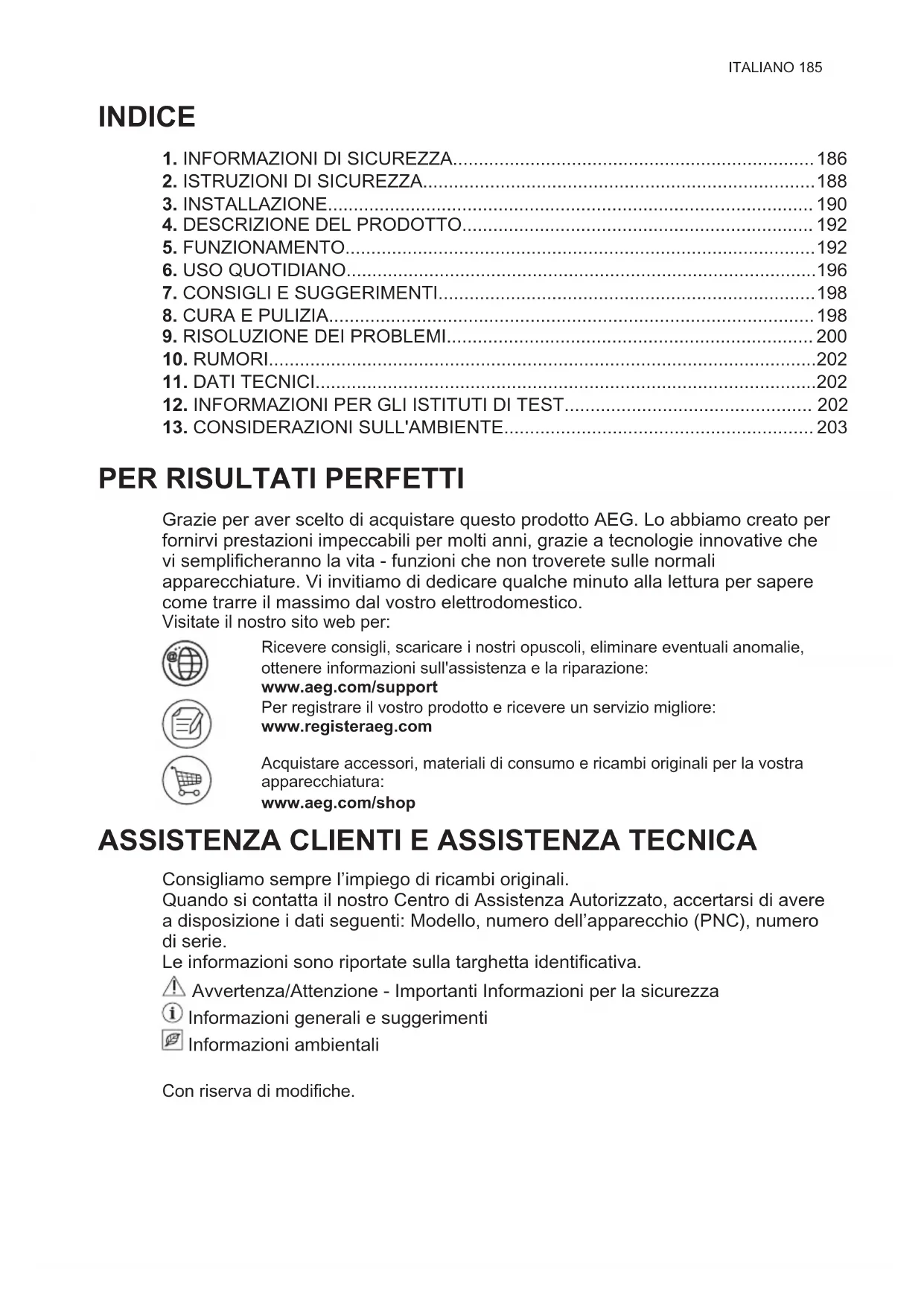 Grazie per aver scelto di acquistare questo prodotto AEG. Lo abbiamo creato per fornirvi prestazioni impeccabili per molti anni, grazie a tecnologie innovative che vi semplificheranno la vita - funzioni che non troverete sulle normali apparecchiature. Vi invitiamo di dedicare qualche minuto alla lettura per sapere come trarre il massimo dal vostro elettrodomestico. Visitate il nostro sito web per: Ricevere consigli, scaricare i nostri opuscoli, eliminare eventuali anomalie, ottenere informazioni sull'assistenza e la riparazione: www.aeg.com/support Per registrare il vostro prodotto e ricevere un servizio migliore: www.registeraeg.com Acquistare accessori, materiali di consumo e ricambi originali per la vostra apparecchiatura: www.aeg.com/shop