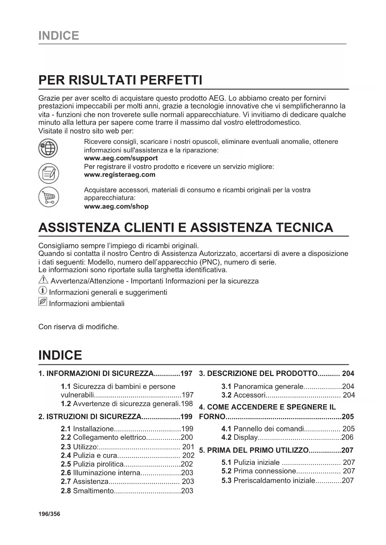 Consigliamo sempre l’impiego di ricambi originali. Quando si contatta il nostro Centro di Assistenza Autorizzato, accertarsi di avere a disposizione i dati seguenti: Modello, numero dell’apparecchio (PNC), numero di serie. Le informazioni sono riportate sulla targhetta identificativa. Avvertenza/Attenzione - Importanti Informazioni per la sicurezza Informazioni generali e suggerimenti Informazioni ambientali Con riserva di modifiche. INDICE
