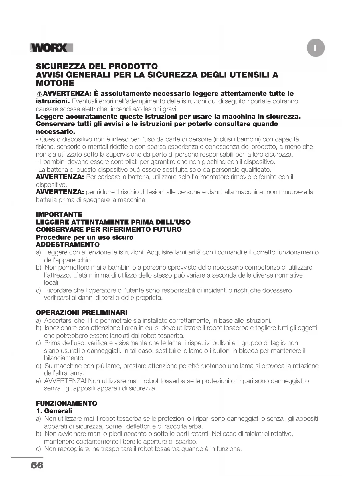 Procedure per un uso sicuro ADDESTRAMENTO a) Leggere con attenzione le istruzioni. Acquisire familiarità con i comandi e il corretto funzionamento dell’apparecchio. b) Non permettere mai a bambini o a persone sprovviste delle necessarie competenze di utilizzare l’attrezzo. L’età minima di utilizzo dello stesso può variare a seconda delle diverse normative locali. c) Ricordare che l’operatore o l’utente sono responsabili di incidenti o rischi che dovessero verificarsi ai danni di terzi o delle proprietà. OPERAZIONI PRELIMINARI a) Accertarsi che il filo perimetrale sia installato correttamente, in base alle istruzioni. b) Ispezionare con attenzione l’area in cui si deve utilizzare il robot tosaerba e togliere tutti gli oggetti che potrebbero essere lanciati dal robot tosaerba. c) Prima dell’uso, verificare visivamente che le lame, i rispettivi bulloni e il gruppo di taglio non siano usurati o danneggiati. In tal caso, sostituire le lame o i bulloni in blocco per mantenere il bilanciamento. d) Su macchine con più lame, prestare attenzione perché ruotando una lama si provoca la rotazione dell’altra lama. e) AVVERTENZA! Non utilizzare mai il robot tosaerba se le protezioni o i ripari sono danneggiati o senza i gli appositi apparati di sicurezza. FUNZIONAMENTO