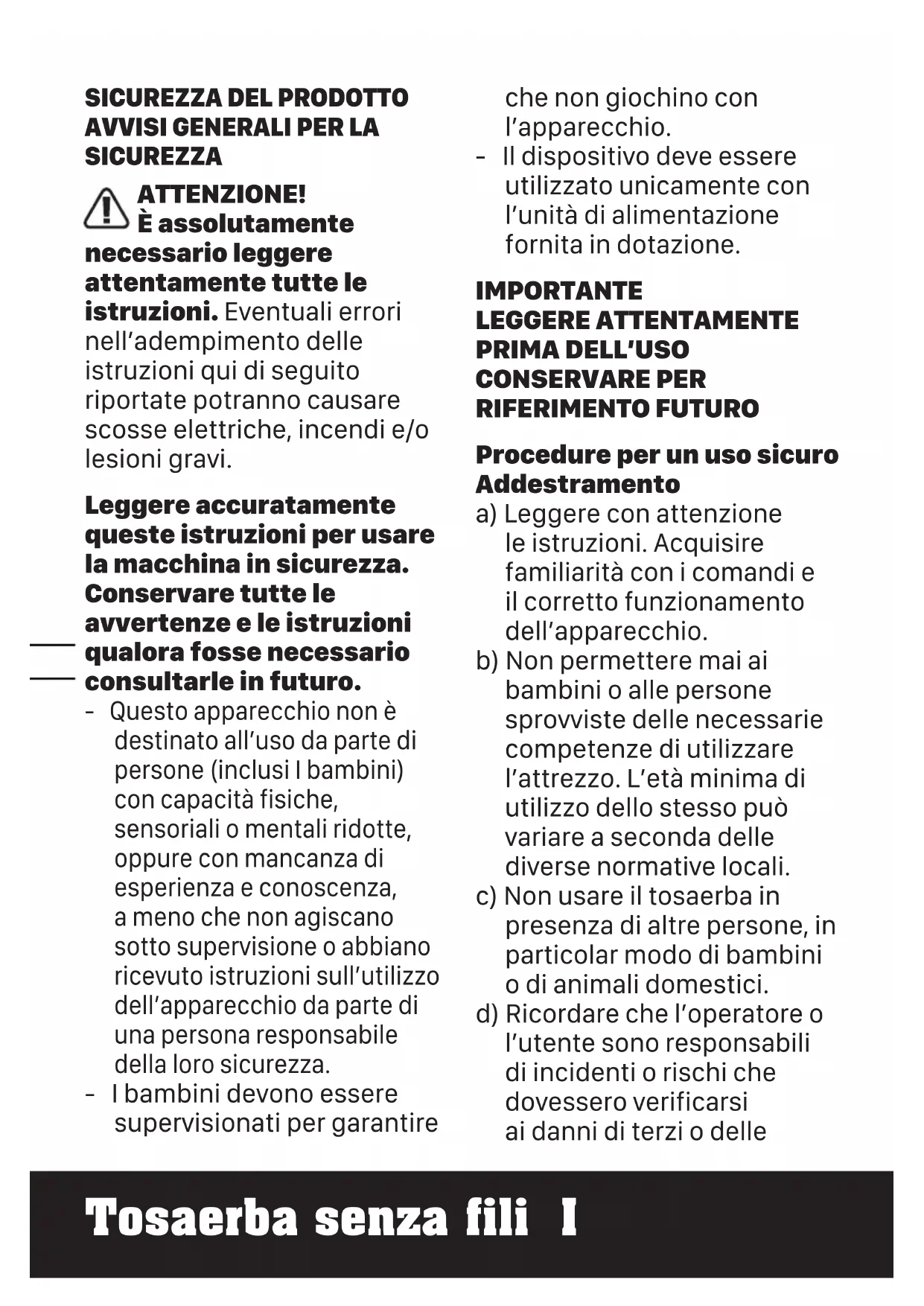 CONSERVARE PER RIFERIMENTO FUTURO Procedure per un uso sicuro Addestramento a) Leggere con attenzione le istruzioni. Acquisire familiarità con i comandi e il corretto funzionamento dell’apparecchio. b) Non permettere mai ai bambini o alle persone sprovviste delle necessarie competenze di utilizzare l’attrezzo. L’età minima di utilizzo dello stesso può variare a seconda delle diverse normative locali. c) Non usare il tosaerba in presenza di altre persone, in particolar modo di bambini o di animali domestici. d) Ricordare che l’operatore o l’utente sono responsabili di incidenti o rischi che dovessero verificarsi ai danni di terzi o delle4342 Tosaerba senza fili I proprietà. Operazioni preliminari a) Durante il lavoro, indossare sempre calzature robuste e pantaloni lunghi. Non utilizzare l’apparecchio scalzi o indossando sandali aperti. b) Ispezionare con attenzione l’area in cui si deve utilizzare l’apparecchiatura e togliere tutti gli oggetti che potrebbero essere lanciati dall’apparecchiatura; c) Prima dell’uso, verificare visivamente che le lame, i rispettivi bulloni e il gruppo di taglio non siano usurati o danneggiati. In tal caso, sostituire le lame o i bulloni in blocco per mantenere l’equilibrio; Sostituire le etichette danneggiate e illeggibili. Funzionamento a) Usare il tosaerba solo nelle ore diurne o in buone condizioni di luce artificiale. b) Se possibile, evitare di utilizzare l’apparecchio su erba bagnata. c) Sui terreni in pendenza, è necessario mantenere sempre la stabilità. d) Camminare, non correre mai; e) Per le apparecchiatura rotative dotate di ruote, effettuare il taglio in senso trasversale a superfici inclinati, mai dall’alto verso il basso; f) Prestare estrema attenzione ai cambi di direzione nelle suddette condizioni di pendenza. g) Non usare il tosaerba su pendii estremamente scoscesi. h) Prestare la massima attenzione tirando a sé l’apparecchio o invertendo la direzione dello stesso.