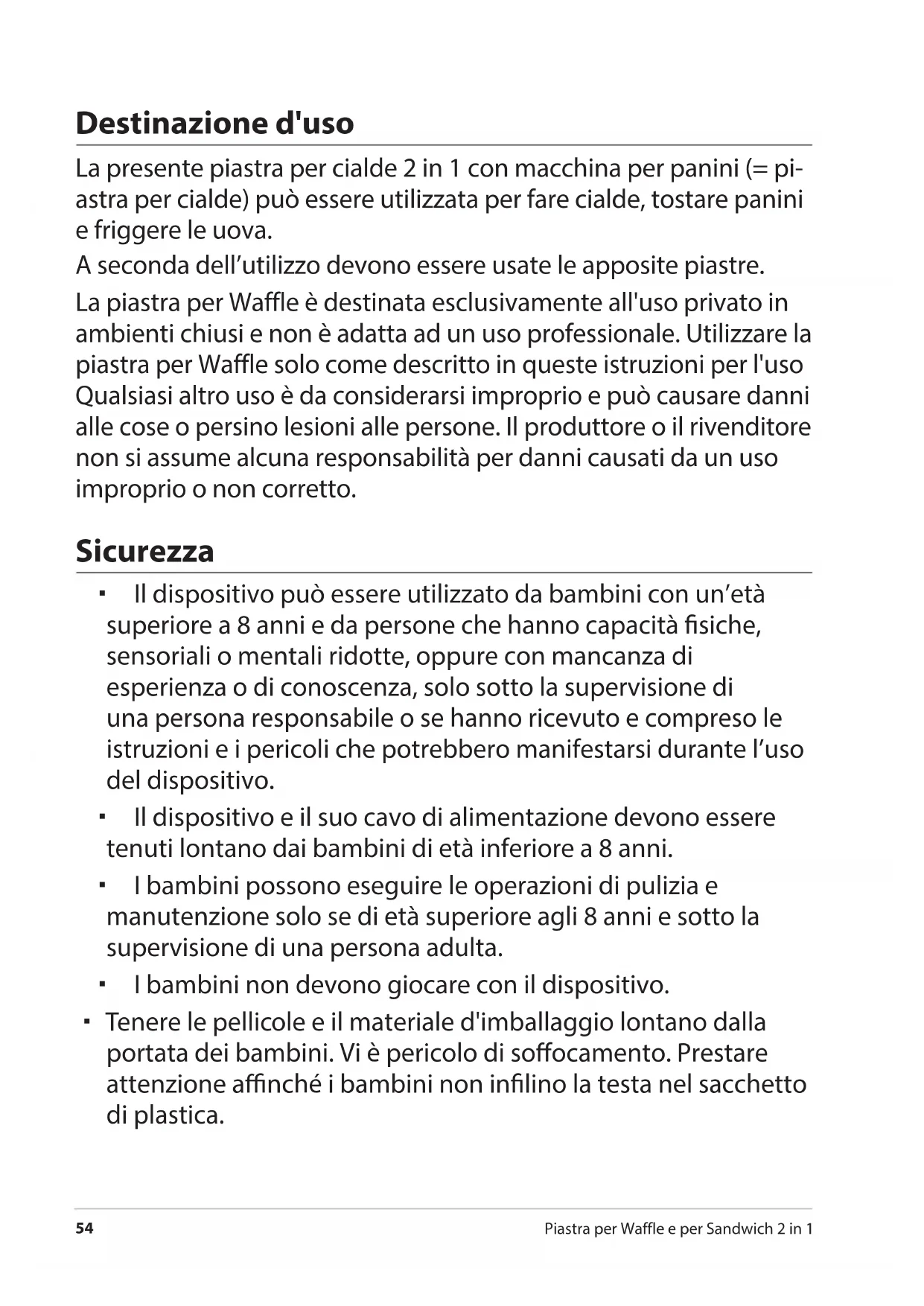 Piastra per Waffle e per Sandwich 2 in 1 Destinazione d'uso La presente piastra per cialde 2 in 1 con macchina per panini (= pi- astra per cialde) può essere utilizzata per fare cialde, tostare panini e friggere le uova. A seconda dell’utilizzo devono essere usate le apposite piastre. La piastra per Waffle è destinata esclusivamente all'uso privato in ambienti chiusi e non è adatta ad un uso professionale. Utilizzare la piastra per Waffle solo come descritto in queste istruzioni per l'uso Qualsiasi altro uso è da considerarsi improprio e può causare danni alle cose o persino lesioni alle persone. Il produttore o il rivenditore non si assume alcuna responsabilità per danni causati da un uso improprio o non corretto. Sicurezza Il dispositivo può essere utilizzato da bambini con un’età superiore a 8 anni e da persone che hanno capacità siche, sensoriali o mentali ridotte, oppure con mancanza di esperienza o di conoscenza, solo sotto la supervisione di una persona responsabile o se hanno ricevuto e compreso le istruzioni e i pericoli che potrebbero manifestarsi durante l’uso del dispositivo. Il dispositivo e il suo cavo di alimentazione devono essere tenuti lontano dai bambini di età inferiore a 8 anni. I bambini possono eseguire le operazioni di pulizia e manutenzione solo se di età superiore agli 8anni e sotto la supervisione di una persona adulta. I bambini non devono giocare con il dispositivo. Tenere le pellicole e il materiale d'imballaggio lontano dalla portata dei bambini. Vi è pericolo di soocamento. Prestare attenzione anché i bambini non inlino la testa nel sacchetto di plastica.Sicurezza