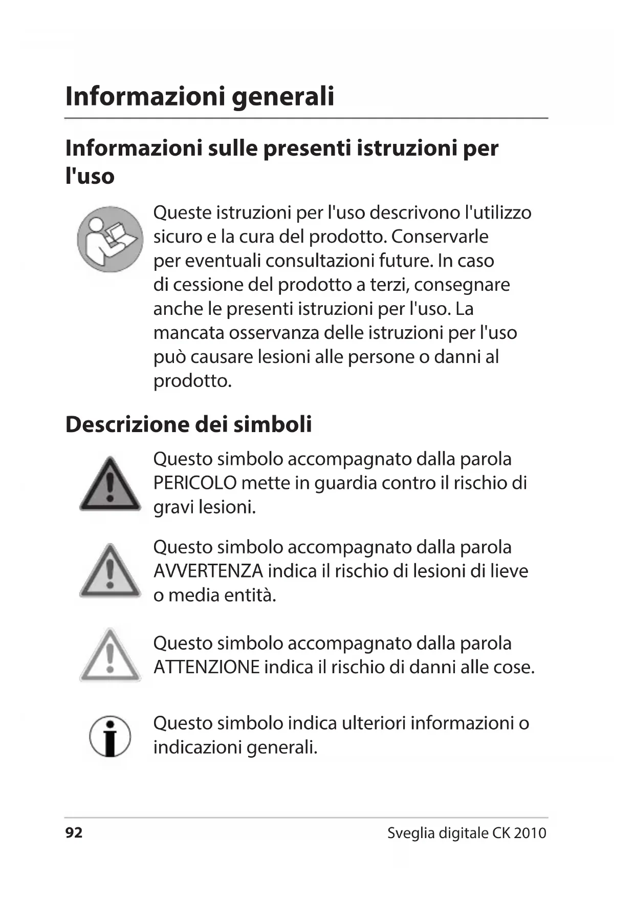 - Smaltimento 2 Sveglia digitale CK 2010 Informazioni generali Informazioni sulle presenti istruzioni per l'uso Queste istruzioni per l'uso descrivono l'utilizzo sicuro e la cura del prodotto. Conservarle per eventuali consultazioni future. In caso di cessione del prodotto a terzi, consegnare anche le presenti istruzioni per l'uso. La mancata osservanza delle istruzioni per l'uso può causare lesioni alle persone o danni al prodotto. Descrizione dei simboli Questo simbolo accompagnato dalla parola PERICOLO mette in guardia contro il rischio di gravi lesioni. Questo simbolo accompagnato dalla parola AVVERTENZA indica il rischio di lesioni di lieve o media entità. Questo simbolo accompagnato dalla parola ATTENZIONE indica il rischio di danni alle cose. Questo simbolo indica ulteriori informazioni o indicazioni generali.93 Sveglia digitale CK 2010 Italiano Sicurezza Il dispositivo può essere utilizzato da bambini con un’età superiore a 8anni e da persone che hanno capacità siche, sensoriali o mentali ridotte, oppure con mancanza di esperienza o di conoscenza, solo sotto la supervisione di una persona responsabile o se hanno ricevuto e compreso le istruzioni e i pericoli che potrebbero manifestarsi durante l’uso del dispositivo. Le batterie possono essere letali. Tenere le batterie fuori dalla portata dei bambini piccoli. Se una batteria viene ingerita o entra nel corpo in qualsiasi altro modo, consultare immediatamente un medico. In caso contrario, si possono vericare gravi ustioni interne entro 2ore, che possono provocare la morte. Tenere l'apparecchio e l'adattatore di rete lontano da bambini al di sotto degli 8anni. I bambini possono eseguire le operazioni di pulizia e manutenzione solo se di età superiore agli 8anni e sotto la supervisione di una persona adulta. I bambini non devono giocare con il dispositivo. Tenere le pellicole e il materiale d'imballaggio lontano dalla portata dei bambini. Vi è pericolo di soocamento. Prestare attenzione anché i bambini non inlino la testa nel sacchetto di plastica. Utilizzare sempre l'alimentatore fornito in dotazione e sostituirlo solo con uno dello stesso tipo. Utilizzare l'alimentatore solo in ambienti interni asciutti e proteggerlo dall'umidità. Non utilizzare più il dispositivo se non è più possibile serrare saldamente la vite di chiusura del vano batteria.94 Sveglia digitale CK 2010 PERICOLO da elettricità Collegare il dispositivo ad una presa correttamente installata, la cui tensione corrisponda a quella indicata nei "Dati tecnici". Accertarsi che la presa di corrente sia facilmente accessibile, in modo da poter scollegare rapidamente la spina dell'adattatore di rete se necessario. Non utilizzare il dispositivo: − se il dispositivo stesso o parti di esso sono danneg- giate, − se il cavo o la spina dell'adattatore di corrente è danneggiato, − se il dispositivo è caduto. Svolgere completamente il cavo dell'adattatore di corrente prima di ogni utilizzo. Assicurarsi che il cavo dell'adattatore di rete non venga danneggiato da spigoli vivi o oggetti caldi. Scollegare la spina dell'adattatore di rete dalla presa: − prima di pulire la sveglia, − se, durante il funzionamento, il dispositivo mostra di subire interferenze, − durante un temporale. − Tirare sempre la spina dell'adattatore di rete, non il cavo. Non apportare nessuna modica al dispositivo. Le riparazioni devono essere eseguite esclusivamente da un'ocina specializzata, poiché un'apparecchiatura riparata in modo improprio può rappresentare un pericolo per l'utente.95 Sveglia digitale CK 2010 Italiano Se l'alimentatore elettrico o il relativo cavo sono danneggiati, sostituire immediatamente l'alimentatore con uno dello stesso tipo. Rischio di lesioni Attenzione: L'utilizzo improprio delle batterie può costituire un pericolo di esplosione. Le batterie non devono essere ricaricate, riattivate con altri mezzi, smontate, buttate nel fuoco o messe in cortocircuito. Evitare il contatto del liquido delle batterie con la pelle, gli occhi e le mucose. In caso di contatto con il liquido, lavare subito con acqua abbondante e consultare immediatamente un medico. ATTENZIONE - Rischio di danni alle cose Proteggere il dispositivo da urti violenti, vibrazioni, radiazioni solari dirette, nonché sporco e livelli di umidità elevati. Non posizionare il dispositivo su superci calde né nelle immediate vicinanze di dispositivi elettrici e oggetti sensibili. Rimuovere la batteria dal dispositivo quando è scarica o quando si prevede di non utilizzare il dispositivo per un lungo periodo. In tal modo si eviteranno danni causati da eventuali perdite di liquido dalle batterie. Non esporre la batteria a condizioni estreme, posizionandola su termosifoni o facendovi arrivare radiazioni solari dirette. Serio rischio di fuoriuscita di liquido! Se necessario, pulire i contatti del dispositivo e le batterie prima di inserirle.96 Sveglia digitale CK 2010 Non apportare nessuna modica al dispositivo. Consentire solo riparazioni ad opera di laboratori specializzati, prestando attenzione a rispettare le condizioni di validità della garanzia. Sul retro del dispositivo si trovano i piedini. Dal momento che le superci dei mobili possono essere di materiali dierenti e trattate con i più diversi prodotti per la pulizia, non è possibile escludere completamente la possibilità che tali materiali o prodotti contengano componenti in grado di danneggiare o ammorbidire i piedini della bilancia. Se necessario, mettere un tappetino antiscivolo sotto il dispositivo. Non usare mai in nessun caso detergenti contenenti agenti forti, graanti o abrasivi per pulire la sveglia. In caso contrario, la supercie del dispositivo potrebbe essere graata. Informazioni sulla ricarica wireless Ad oggi, lo standard Qi (uno standard per la ricarica wireless degli smartphone) non è supportato da tutti i produttori né compatibile con tutti i modelli. Controllare le istruzioni per l'uso del proprio smartphone. Su Internet è