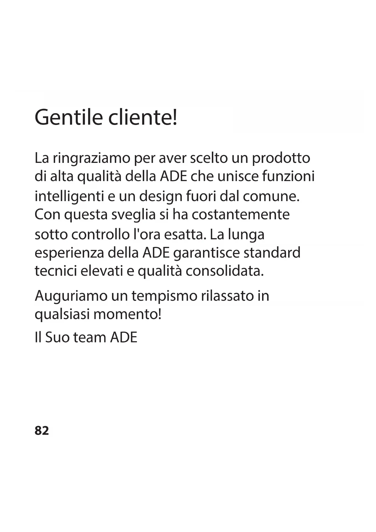 Smaltimento del prodotto Smaltire il prodotto secondo le norme vigenti nel proprio paese. Non smaltire il dispositivo con i normali rifiuti domestici. Al termine della sua vita utile, l'apparecchio deve essere smaltito in modo appropriato. In tal modo si rende possibile il riutilizzo del materiale riciclabile contenuto nell’apparecchio limitando l’impatto sull’ambiente. Smaltire l’apparecchio usato presso un centro di raccolta per rifiuti elettrici o un centro di riciclaggio. Per ulteriori informazioni rivolgersi alla ditta di smaltimento locale o alla propria amministrazione comunale.100 Le batterie e gli accumulatori non devono essere smaltiti con i rifiuti domestici Le batterie e gli accumulatori devono essere consegnati presso un centro di raccolta comunale o di quartiere, oppure presso il proprio rivenditore, al fine di garantire il loro smaltimento in modo rispettoso dell'ambiente.101 IT102 Szanowny Kliencie! Zakupiony wysokiej jakości produkt marki ADE łączy w sobie inteligentne funkcje z wyjątkową stylistyką. Budzik umożliwia precyzyjne kontrolowanie czasu. Wieloletnie doświadczenie marki ADE gwarantuje wysoki standard techniczny oraz sprawdzoną jakość. Życzymy zawsze poczucia czasu bez pośpiechu! Zespół ADE103