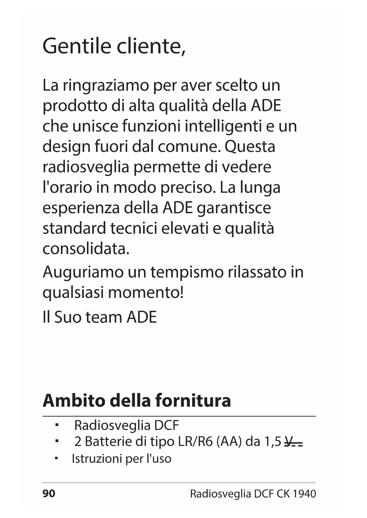 Radiosveglia DCF CK 1940 Italiano Non appena le batterie sono inserite, la radio avvia la ricezione, si veda il capitolo successivo. Indicazioni sulla sostituzione delle batterie: Utilizzare solo il tipo di batterie indicato nei “Dati tecnici”. Sostituire sempre tutte le batterie. Provvedere allo smaltimento corretto delle batterie, vedi “Smaltimento”. Ricezione del segnale orario Quando le batterie sono inserite, tutte le indicazioni sul display vengono visualizzate per un istante, il display si illumina. Dopo qualche istante sul display appare la temperatura ambiente misurata. Poi, il dispositivo entrerà in modalità di ricezione; il numero di onde radio indica la qualità del segnale ricevuto: quante più onde radio appaiono sul display, tanto più forte sarà il segnale radio. Quando la ricezione del segnale orario è sufficientemente forte, sullo schermo comparirà l'orario. La radiosveglia si accende più volte automaticamente ogni notte per la ricezione. L'ora visualizzata sarà sincronizzata con quella del trasmettitore del segnale orario.100 Radiosveglia DCF CK 1940 Se non è ricevuto un segnale sufficientemente forte, la radiosveglia interrompe la procedura di ricezione dopo qualche minuto e l'icona della torre radio si spegne. La ricezione sarà riavviata in un secondo momento. In tal caso, l'indicazione dell'orario avviene lo stesso (a partire dall'orario iniziale "00:00"). Lista di controllo con indicazione dei dati sul display