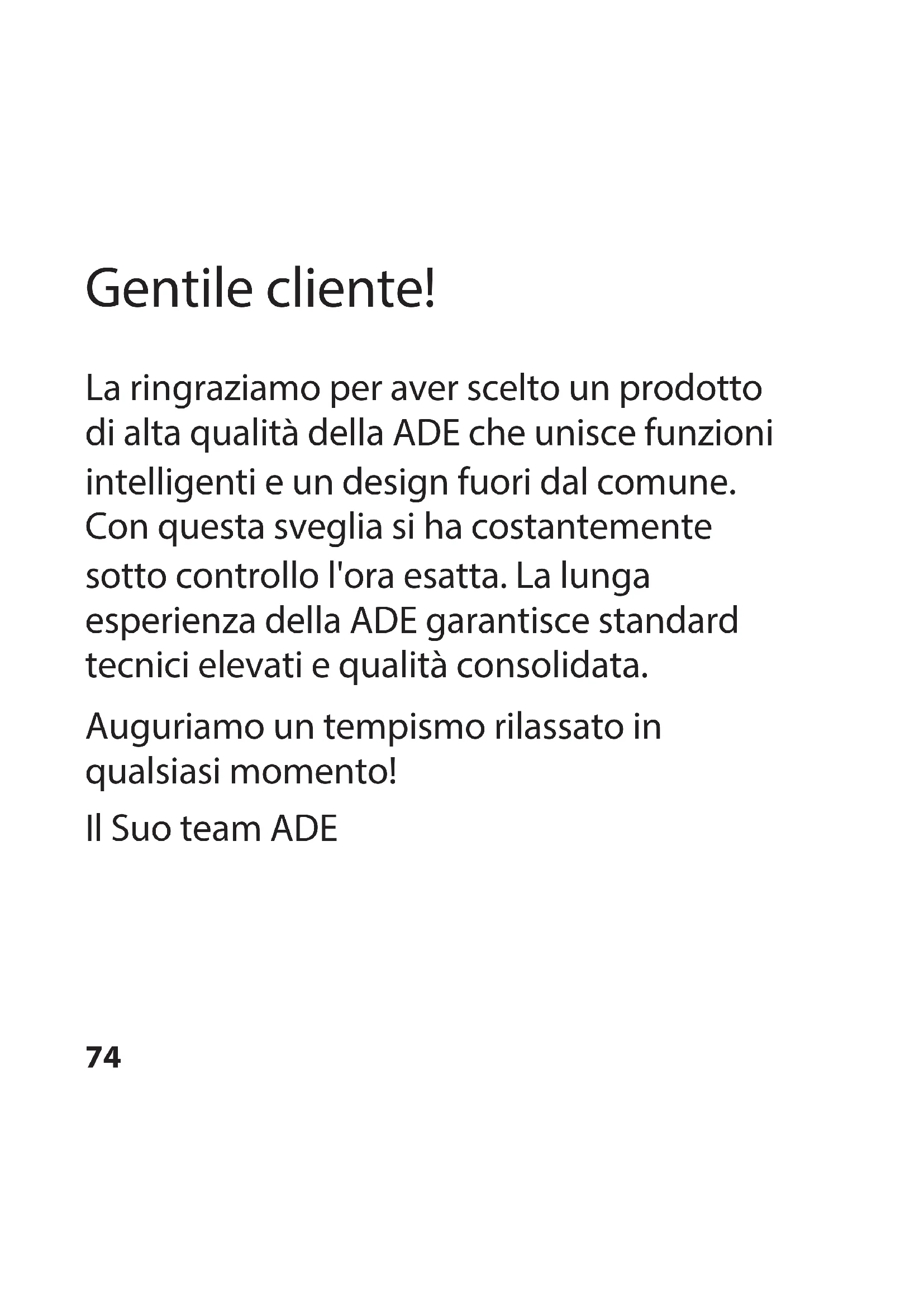 Al termine della sua vita utile, l'apparecchio deve essere smaltito in modo appropriato. In tal modo si rende possibile il riutilizzo del materiale riciclabile contenuto nell’apparecchio limitando l’impatto sull’ambiente. Smaltire l’apparecchio usato presso un centro di raccolta per rifiuti elettrici o un centro di riciclaggio. Per ulteriori informazioni rivolgersi alla ditta di smaltimento locale o alla propria amministrazione comunale. Le batterie e gli accumulatori non devono essere smaltiti con i rifiuti domestici Le batterie e gli accumulatori devono essere consegnati presso un centro di raccolta comunale o di quartiere, oppure presso il proprio rivenditore. Al fine di garantire il loro smaltimento in modo rispettoso dell'ambiente.92 Szanowny Kliencie! Zakupiony wysokiej jakości produkt marki ADE łączy w sobie inteligentne funkcje z wyjątkową stylistyką. Budzik umożliwia precyzyjne kontrolowanie czasu. Wieloletnie doświadczenie marki ADE gwarantuje wysoki standard techniczny oraz sprawdzoną jakość. Życzymy zawsze poczucia czasu bez pośpiechu! Zespół ADE93