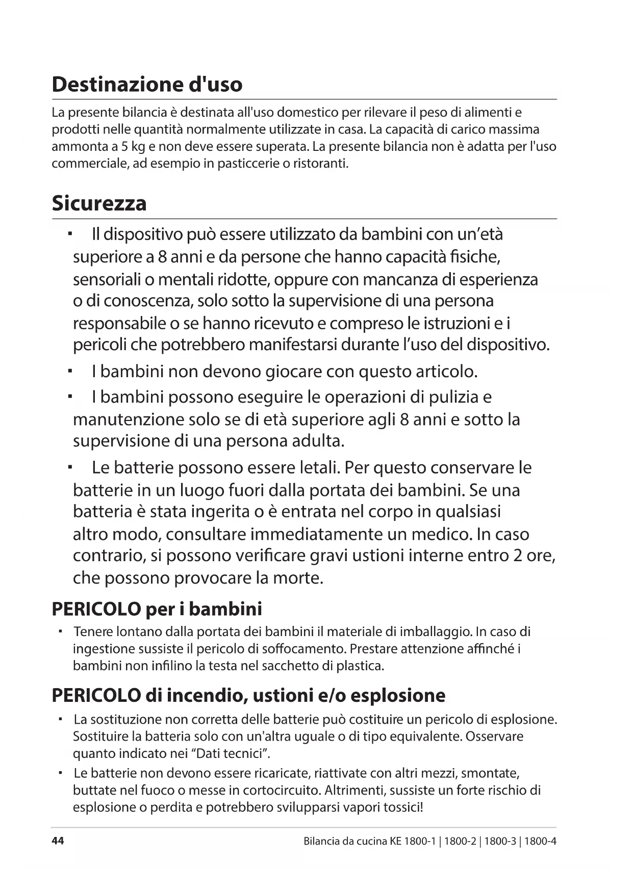 Bilancia da cucina KE 1800-1 | 1800-2 | 1800-3 | 1800-4 Destinazione d'uso La presente bilancia è destinata all'uso domestico per rilevare il peso di alimenti e prodotti nelle quantità normalmente utilizzate in casa. La capacità di carico massima ammonta a 5 kg e non deve essere superata. La presente bilancia non è adatta per l'uso commerciale, ad esempio in pasticcerie o ristoranti. Sicurezza Il dispositivo può essere utilizzato da bambini con un’età superiore a 8 anni e da persone che hanno capacità siche, sensoriali o mentali ridotte, oppure con mancanza di esperienza o di conoscenza, solo sotto la supervisione di una persona responsabile o se hanno ricevuto e compreso le istruzioni e i pericoli che potrebbero manifestarsi durante l’uso del dispositivo. I bambini non devono giocare con questo articolo. I bambini possono eseguire le operazioni di pulizia e manutenzione solo se di età superiore agli 8 anni e sotto la supervisione di una persona adulta. Le batterie possono essere letali. Per questo conservare le batterie in un luogo fuori dalla portata dei bambini. Se una batteria è stata ingerita o è entrata nel corpo in qualsiasi altro modo, consultare immediatamente un medico. In caso contrario, si possono vericare gravi ustioni interne entro 2 ore, che possono provocare la morte. PERICOLO per i bambini Tenere lontano dalla portata dei bambini il materiale di imballaggio. In caso di ingestione sussiste il pericolo di soocamento. Prestare attenzione anché i bambini non inlino la testa nel sacchetto di plastica. PERICOLO di incendio, ustioni e/o esplosione La sostituzione non corretta delle batterie può costituire un pericolo di esplosione. Sostituire la batteria solo con un'altra uguale o di tipo equivalente. Osservare quanto indicato nei “Dati tecnici”. Le batterie non devono essere ricaricate, riattivate con altri mezzi, smontate, buttate nel fuoco o messe in cortocircuito. Altrimenti, sussiste un forte rischio di esplosione o perdita e potrebbero svilupparsi vapori tossici!Sicurezza