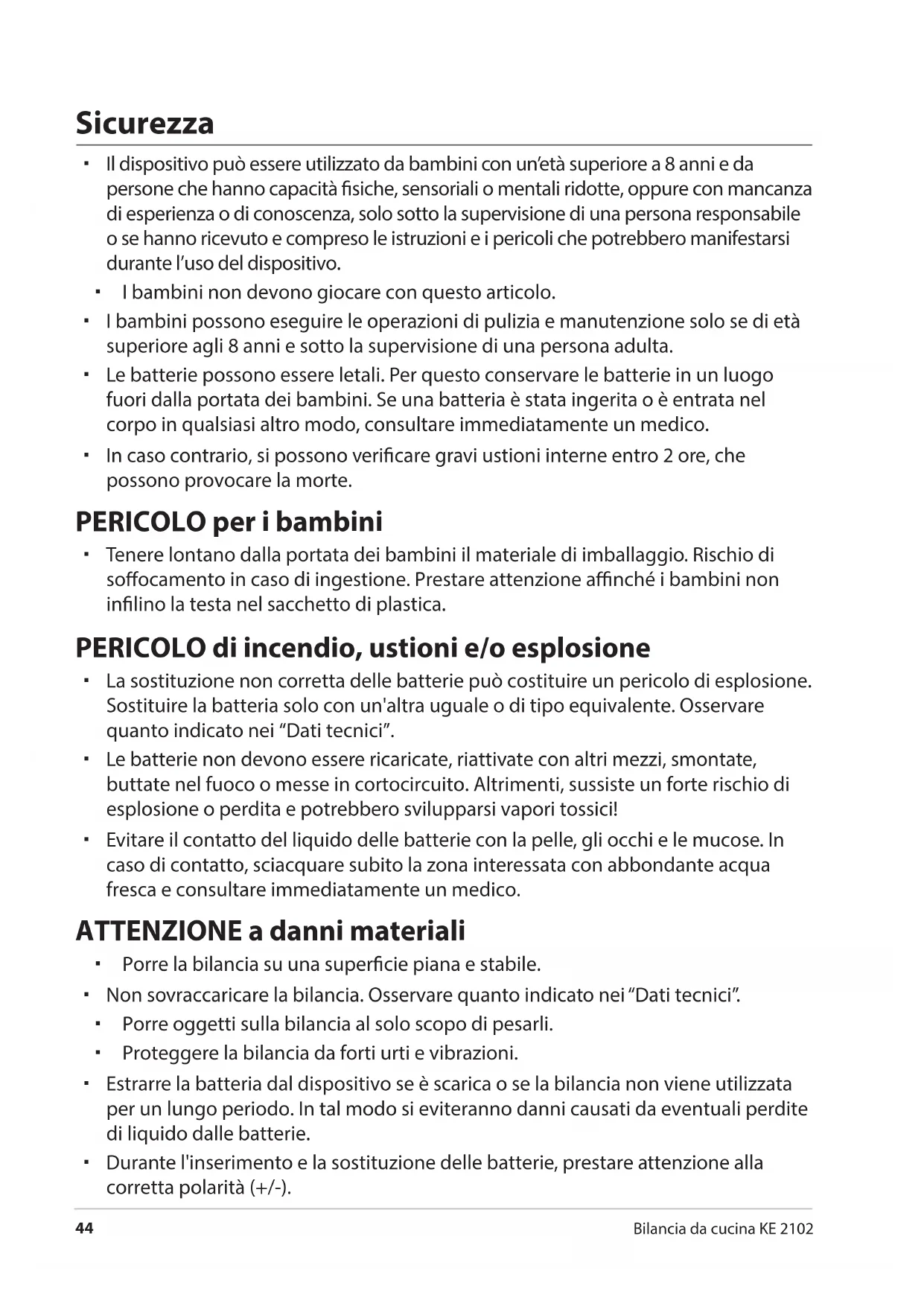 Bilancia da cucina KE 2102 Sicurezza Il dispositivo può essere utilizzato da bambini con un’età superiore a 8 anni e da persone che hanno capacità siche, sensoriali o mentali ridotte, oppure con mancanza di esperienza o di conoscenza, solo sotto la supervisione di una persona responsabile o se hanno ricevuto e compreso le istruzioni e i pericoli che potrebbero manifestarsi durante l’uso del dispositivo. I bambini non devono giocare con questo articolo. I bambini possono eseguire le operazioni di pulizia e manutenzione solo se di età superiore agli 8anni e sotto la supervisione di una persona adulta. Le batterie possono essere letali. Per questo conservare le batterie in un luogo fuori dalla portata dei bambini. Se una batteria è stata ingerita o è entrata nel corpo in qualsiasi altro modo, consultare immediatamente un medico. In caso contrario, si possono vericare gravi ustioni interne entro 2ore, che possono provocare la morte. PERICOLO per i bambini Tenere lontano dalla portata dei bambini il materiale di imballaggio. Rischio di soocamento in caso di ingestione. Prestare attenzione anché i bambini non inlino la testa nel sacchetto di plastica. PERICOLO di incendio, ustioni e/o esplosione La sostituzione non corretta delle batterie può costituire un pericolo di esplosione. Sostituire la batteria solo con un'altra uguale o di tipo equivalente. Osservare quanto indicato nei “Dati tecnici”. Le batterie non devono essere ricaricate, riattivate con altri mezzi, smontate, buttate nel fuoco o messe in cortocircuito. Altrimenti, sussiste un forte rischio di esplosione o perdita e potrebbero svilupparsi vapori tossici! Evitare il contatto del liquido delle batterie con la pelle, gli occhi e le mucose. In caso di contatto, sciacquare subito la zona interessata con abbondante acqua fresca e consultare immediatamente un medico. ATTENZIONE a danni materiali Porre la bilancia su una supercie piana e stabile. Non sovraccaricare la bilancia. Osservare quanto indicato nei “Dati tecnici”. Porre oggetti sulla bilancia al solo scopo di pesarli. Proteggere la bilancia da forti urti e vibrazioni. Estrarre la batteria dal dispositivo se è scarica o se la bilancia non viene utilizzata per un lungo periodo. In tal modo si eviteranno danni causati da eventuali perdite di liquido dalle batterie. Durante l'inserimento e la sostituzione delle batterie, prestare attenzione alla corretta polarità(+/-).Destinazione d’uso