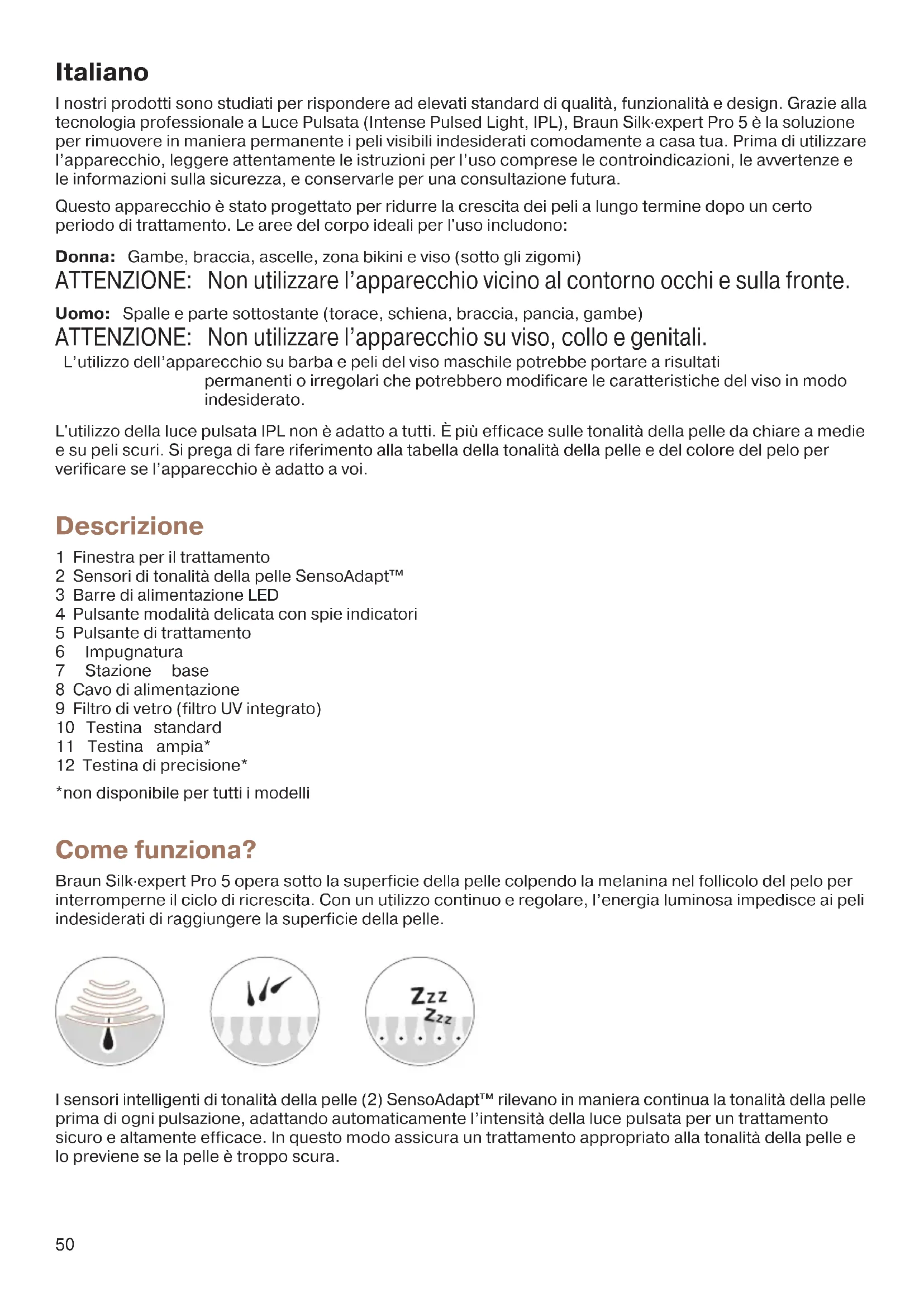 barba/peli del viso maschili. Si sconsiglia di utilizzare il dispositivo su aree della pelle dove sono presenti dermal filler. Non utilizzare più di una volta a settimana nella stessa zona. Potrebbero verificarsi danni alla pelle dopo un trattamento prolungato o ripetuto sulla stessa zona. Sicurezza degli occhi Non guardare direttamente il filtro di vetro (9) o tentare di attivare l’apparecchio se rivolto verso gli occhi. Per proteggere la sicurezza degli occhi, e quella delle persone vicine, l’apparecchio si attiverà solo quando entrambi i sensori della tonalità della pelle sono a contatto con la pelle. Se in qualsiasi momento l’apparecchio si attiva quando entrambi i sensori NON sono a contatto con la pelle, INTERROMPERE immediatamente l’utilizzo dell’apparecchio e contattare il rivenditore. Possibili lesioni agli occhi (che potrebbero portare alla perdita della vista) o lesioni alla pelle se non vengono seguite le istruzioni. Proteggi gli occhi dall'esposizione. Non utilizzare l'apparecchio sulle palpebre o vicino agli occhi. Precauzioni