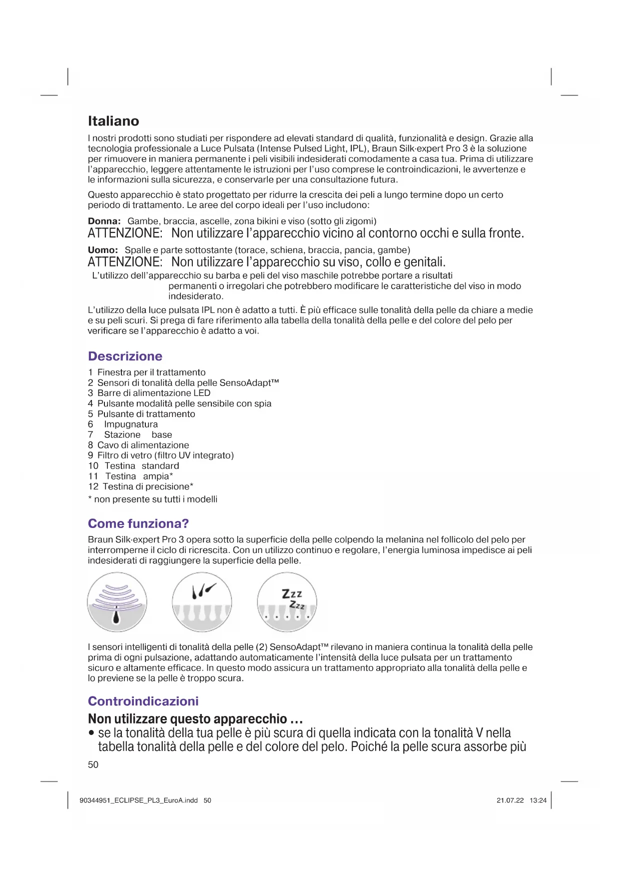barba/peli del viso maschili. 90344951_ECLIPSE_PL3_EuroA.indd 5190344951_ECLIPSE_PL3_EuroA.indd 51 21.07.22 13:2421.07.22 13:2452 Si sconsiglia di utilizzare il dispositivo su aree della pelle dove sono presenti dermal filler. Non utilizzare più di una volta a settimana nella stessa zona. Potrebbero verificarsi danni alla pelle dopo un trattamento prolungato o ripetuto sulla stessa zona. Sicurezza degli occhi Non guardare direttamente il filtro di vetro (9) o tentare di attivare l’apparecchio se rivolto verso gli occhi. Per proteggere la sicurezza degli occhi, e quella delle persone vicine, l’apparecchio si attiverà solo quando entrambi i sensori della tonalità della pelle sono a contatto con la pelle. Se in qualsiasi momento l’apparecchio si attiva quando entrambi i sensori NON sono a contatto con la pelle, INTERROMPERE immediatamente l’utilizzo dell’apparecchio e contattare il rivenditore. Possibili lesioni agli occhi (che potrebbero portare alla perdita della vista) o lesioni alla pelle se non vengono seguite le istruzioni. Proteggi gli occhi dall’esposizione. Non utilizzare l’apparecchio sulle palpebre o vicino agli occhi. Precauzioni