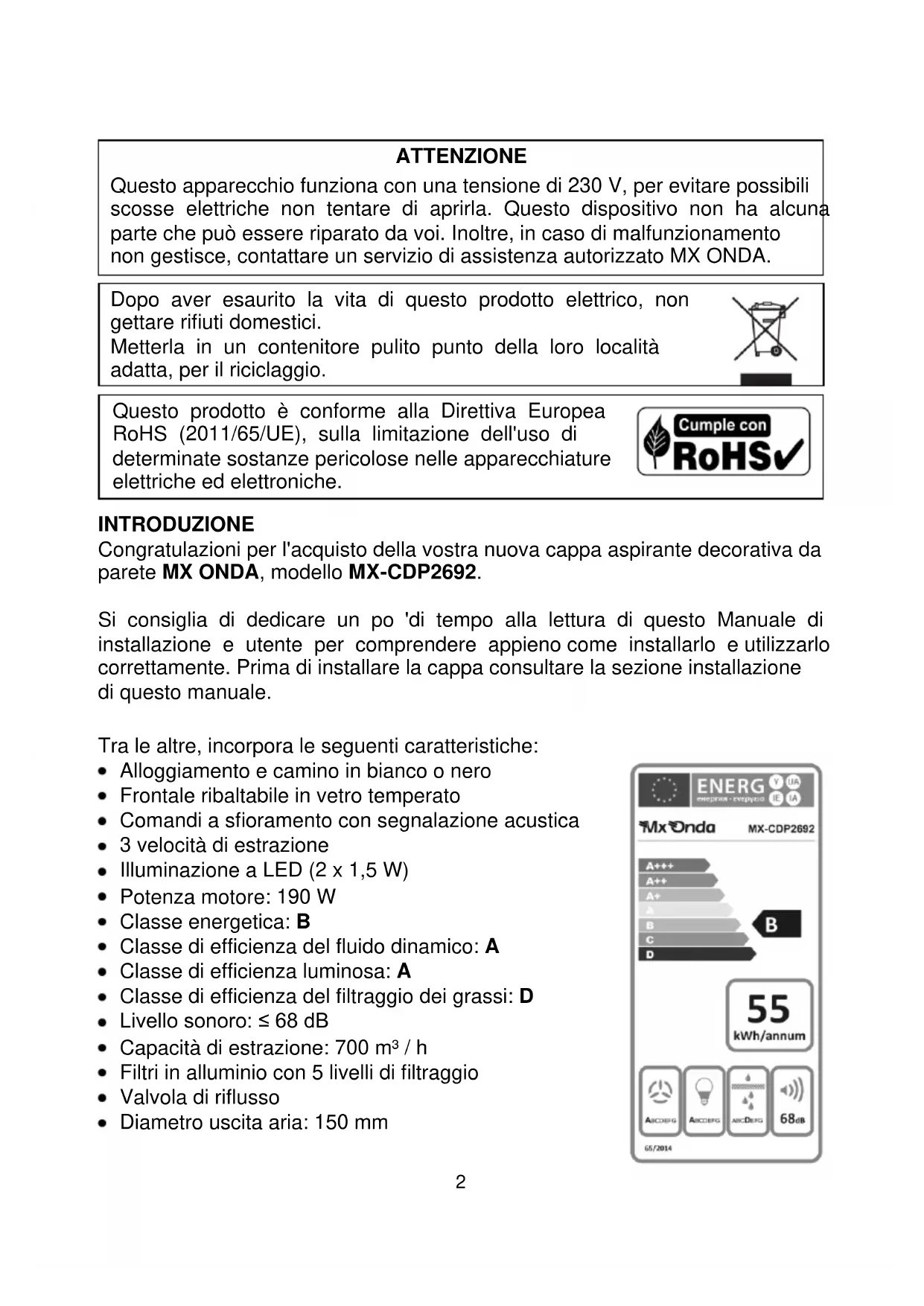 Questo prodotto è conforme alla Direttiva Europea RoHS (2011/65/UE), sulla limitazione dell'uso di determinate sostanze pericolose nelle apparecchiature elettriche ed elettroniche. INTRODUZIONE Congratulazioni per l'acquisto della vostra nuova cappa aspirante decorativa da parete MX ONDA, modello MX-CDP2692. Si consiglia di dedicare un po 'di tempo alla lettura di questo Manuale di installazione e utente per comprendere appieno come installarlo e utilizzarlo correttamente. Prima di installare la cappa consultare la sezione installazione di questo manuale. Tra le altre, incorpora le seguenti caratteristiche: Alloggiamento e camino in bianco o nero Frontale ribaltabile in vetro temperato Comandi a sfioramento con segnalazione acustica 3 velocità di estrazione Illuminazione a LED (2 x 1,5 W) Potenza motore: 190 W Classe energetica: B Classe di efficienza del fluido dinamico: A Classe di efficienza luminosa: A Classe di efficienza del filtraggio dei grassi: D Livello sonoro: ≤ 68 dB Capacità di estrazione: 700 m³ / h Filtri in alluminio con 5 livelli di filtraggio Valvola di riflusso Diametro uscita aria: 150 mm