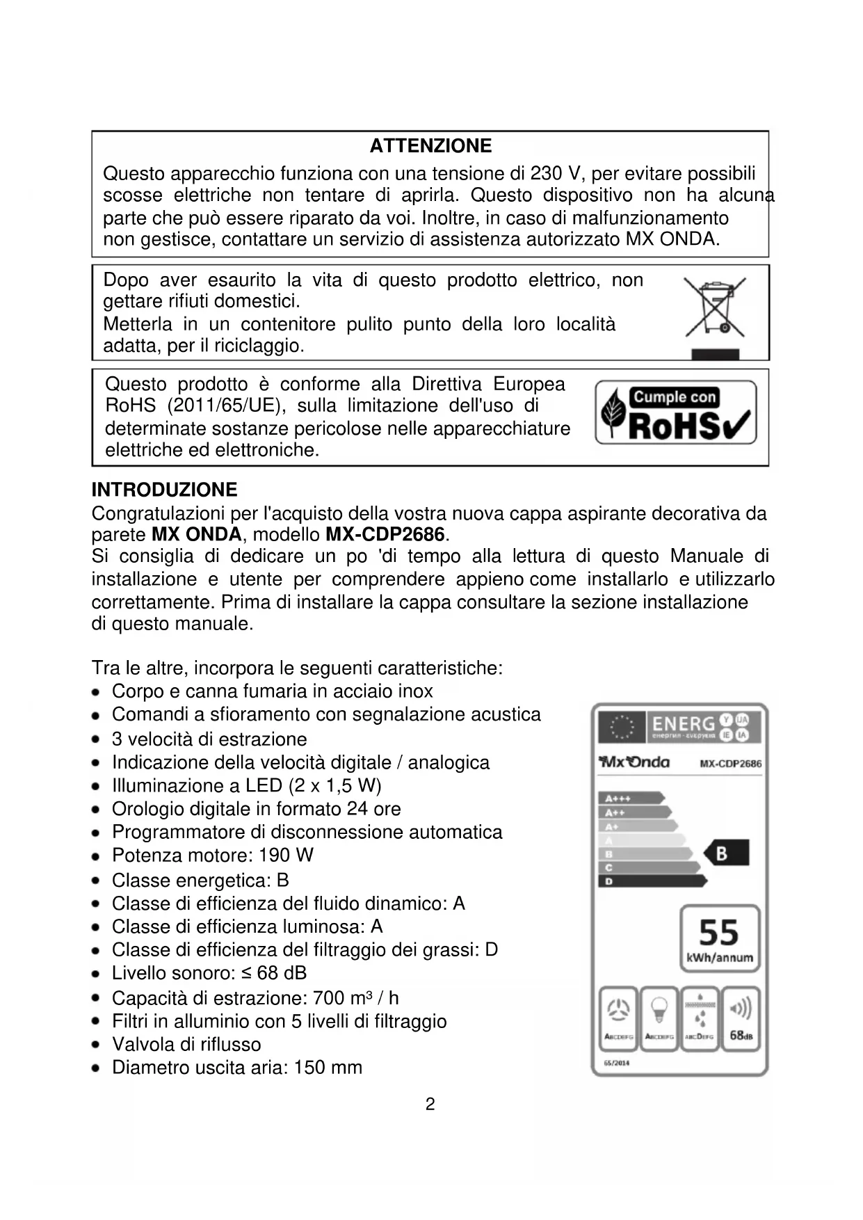 Questo prodotto è conforme alla Direttiva Europea RoHS (2011/65/UE), sulla limitazione dell'uso di determinate sostanze pericolose nelle apparecchiature elettriche ed elettroniche. INTRODUZIONE Congratulazioni per l'acquisto della vostra nuova cappa aspirante decorativa da parete MX ONDA, modello MX-CDP2686. Si consiglia di dedicare un po 'di tempo alla lettura di questo Manuale di installazione e utente per comprendere appieno come installarlo e utilizzarlo correttamente. Prima di installare la cappa consultare la sezione installazione di questo manuale. Tra le altre, incorpora le seguenti caratteristiche: Corpo e canna fumaria in acciaio inox Comandi a sfioramento con segnalazione acustica 3 velocità di estrazione Indicazione della velocità digitale / analogica Illuminazione a LED (2 x 1,5 W) Orologio digitale in formato 24 ore Programmatore di disconnessione automatica Potenza motore: 190 W Classe energetica: B Classe di efficienza del fluido dinamico: A Classe di efficienza luminosa: A Classe di efficienza del filtraggio dei grassi: D Livello sonoro: ≤ 68 dB Capacità di estrazione: 700 m³ / h Filtri in alluminio con 5 livelli di filtraggio Valvola di riflusso Diametro uscita aria: 150 mm