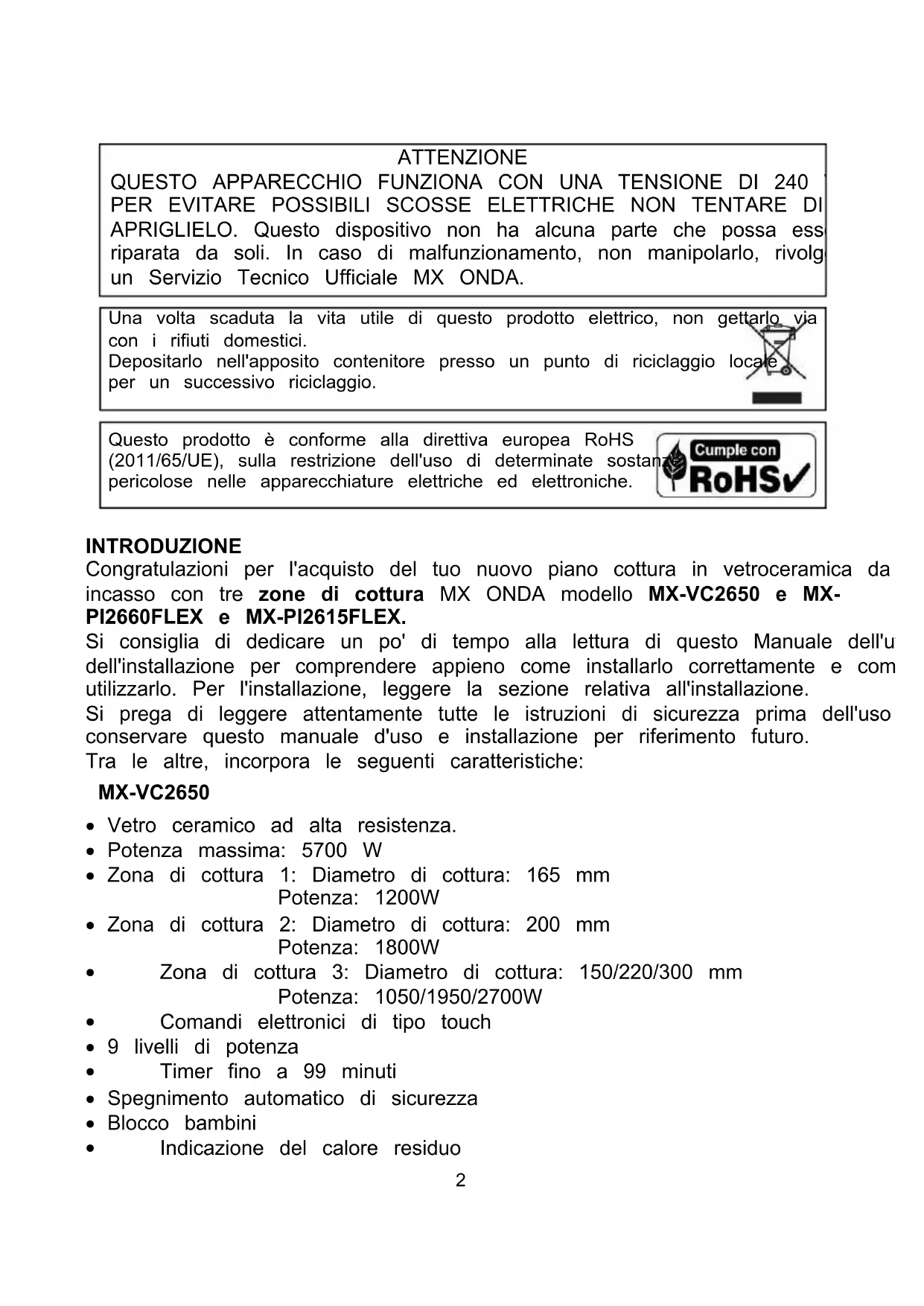 ATTENZIONE QUESTO APPARECCHIO FUNZIONA CON UNA TENSIONE DI 240 V, PER EVITARE POSSIBILI SCOSSE ELETTRICHE NON TENTARE DI APRIGLIELO. Questo dispositivo non ha alcuna parte che possa essere riparata da soli. In caso di malfunzionamento, non manipolarlo, rivolgersi ad un Servizio Tecnico Ufficiale MX ONDA. Una volta scaduta la vita utile di questo prodotto elettrico, non gettarlo via con i rifiuti domestici. Depositarlo nell'apposito contenitore presso un punto di riciclaggio locale per un successivo riciclaggio. Questo prodotto è conforme alla direttiva europea RoHS (2011/65/UE), sulla restrizione dell'uso di determinate sostanze pericolose nelle apparecchiature elettriche ed elettroniche. INTRODUZIONE Congratulazioni per l'acquisto del tuo nuovo piano cottura in vetroceramica da incasso con tre zone di cottura MX ONDA modello MX-VC2650 e MX- PI2660FLEX e MX-PI2615FLEX. Si consiglia di dedicare un po' di tempo alla lettura di questo Manuale dell'utente e dell'installazione per comprendere appieno come installarlo correttamente e come utilizzarlo. Per l'installazione, leggere la sezione relativa all'installazione. Si prega di leggere attentamente tutte le istruzioni di sicurezza prima dell'uso e conservare questo manuale d'uso e installazione per riferimento futuro. Tra le altre, incorpora le seguenti caratteristiche: MX-VC2650 Vetro ceramico ad alta resistenza. Potenza massima: 5700 W Zona di cottura 1: Diametro di cottura: 165 mm Potenza: 1200W Zona di cottura 2: Diametro di cottura: 200 mm Potenza: 1800W