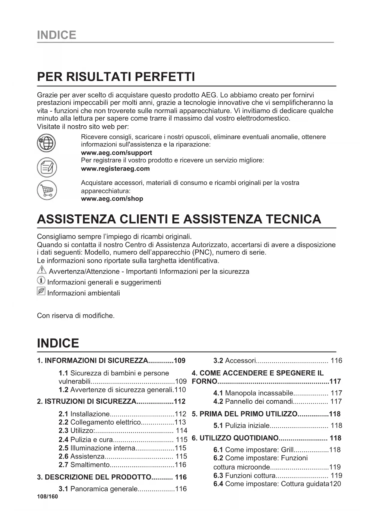 Grazie per aver scelto di acquistare questo prodotto AEG. Lo abbiamo creato per fornirvi prestazioni impeccabili per molti anni, grazie a tecnologie innovative che vi semplificheranno la vita - funzioni che non troverete sulle normali apparecchiature. Vi invitiamo di dedicare qualche minuto alla lettura per sapere come trarre il massimo dal vostro elettrodomestico. Visitate il nostro sito web per: Ricevere consigli, scaricare i nostri opuscoli, eliminare eventuali anomalie, ottenere informazioni sull'assistenza e la riparazione: www.aeg.com/support Per registrare il vostro prodotto e ricevere un servizio migliore: www.registeraeg.com Acquistare accessori, materiali di consumo e ricambi originali per la vostra apparecchiatura: www.aeg.com/shop