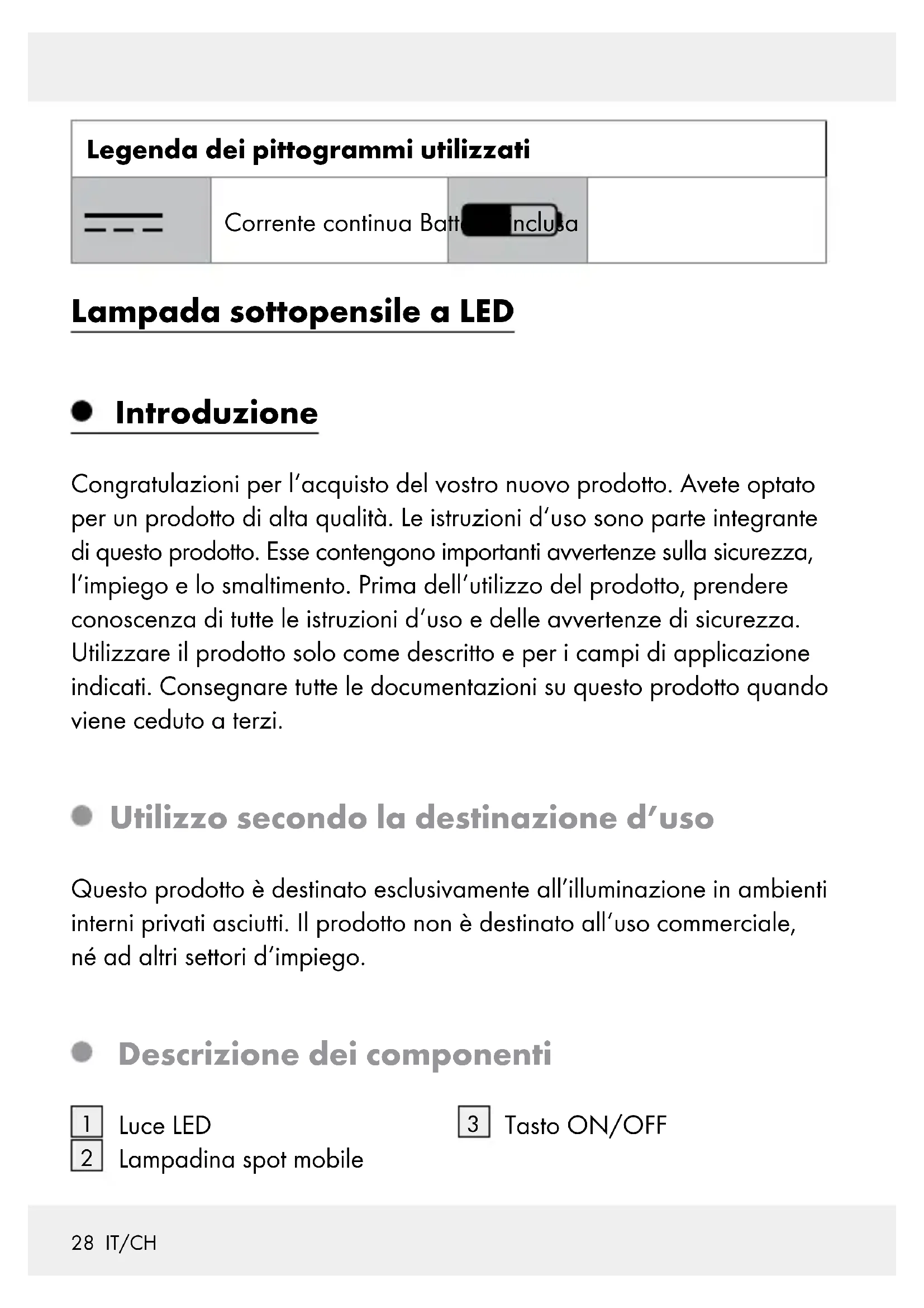 Cuscinetto adesivo Dati tecnici LED: 3 Spots, ognuna dotata di 3 LED (per il modello HG04436A) e ognuna con 1 LED (per il modello HG04436B) di max. 0,2 W (per il modello HG04436A) e max. 0,5 W (per il modello HG04436B). (le lampadine non sono sostituibili.) Batterie: 6 x 1,5 V , tipo AAA Durata illuminazione: ca. 20 ore Contenuto della confezione 1 Lampada sottopensile a LED 1 Piastra di montaggio 6 Batterie 2 Viti (ø 3 x 10 mm) 2 Tamponi adesivi 1 Manuale di istruzioni per l‘uso30 IT/CH Avvertenze generali in materia di sicurezza SI PREGA DI LEGGERE LE ISTRUZIONI PRIMA DELL‘USO! CONSERVARE CON CURA IL MANUALE DI ISTRUZIONI! Prima dell‘uso, controllare che il prodotto non sia danneggiato. Non mettere in funzione il prodotto se danneggiato. Questo prodotto può essere usato da bambini a partire dagli 8 anni in su e da persone con capacità fisiche, sensoriali o mentali limitate, oppure senza esperienza e conoscenza in merito, purché sorvegliati o istruiti circa un uso sicuro del prodotto e purché com- prendano i pericoli ad esso connessi. I bambini non possono gio- care con il prodotto. La pulizia e la manutenzione non possono essere eseguite da bambini senza la supervisione di un adulto. Non utilizzare mai il prodotto qualora si rilevassero danneggiamenti. I LED non sono sostituibili. Sostituire l‘intero prodotto quando i LED giungono al termine della propria vita media. Il prodotto è destinato esclusivamente all‘uso in ambienti interni. Avvertenze di sicurezza per batterie / accumulatori PERICOLO DI MORTE! Tenere le batterie / gli accumulatori fuori dalla portata dei bambini. In caso di ingerimento consultare subito un medico!31 IT/CH PERICOLO DI ESPLOSIONE! Non ricaricare mai batterie non ricaricabili. Non cortocircuitare e / o aprire le batterie o gli accumulatori. Ne conseguirebbe un rischio di incendio, surriscaldamento o scoppio. Non gettare mai le batterie / gli accumulatori nel fuoco o in acqua. Non esercitare alcuna pressione meccanica sulle batterie / sugli accumulatori. Rischio di perdita di liquido dalle batterie / dagli accumulatori Evitare condizioni e temperature estreme che possano ripercuotersi sulle batterie / sugli accumulatori, quali ad esempio la vicinanza a termosifoni o l‘irraggiamento solare diretto. Evitare il contatto delle sostanze chimiche con la pelle, gli occhi e le mucose in caso di fuoriuscita del liquido dalle batterie / dagli accumulatori! Sciacquare subito le aree colpite con acqua pulita e consultare immediatamente un medico! INDOSSARE GUANTI PROTETTIVI! Batterie e accu- mulatori danneggiati o che presentano perdite possono corrodere la pelle in caso di contatto. Pertanto, in questo caso indossare sempre guanti di protezione adatti. Nel caso di perdita di liquido delle batterie / degli accumulatori, rimuoverli subito dal prodotto per evitare danneggiamenti. Utilizzare solamente batterie / gli accumulatori dello stesso tipo. Non mischiare le batterie / gli accumulatori vecchi con quelli nuovi! Rimuovere le batterie / gli accumulatori, quando il prodotto non viene utilizzato a lungo.32 IT/CH Rischio di danneggiamento del prodotto Utilizzare esclusivamente il tipo di batterie / di accumulatori indicato! Inserire le batterie / gli accumulatori secondo il contrassegno della polarità (+) e (-) sulla batteria / sull‘accumulatore del prodotto. Pulire i contatti della batteria / dell‘accumulatore e del vano portabatterie prima dell‘inserimento! Rimuovere immediatamente le batterie / gli accumulatori esausti dal prodotto. Utilizzo Nota: rimuovere dal prodotto l‘intero materiale di imballaggio. Montaggio Fissare la piastra di montaggio