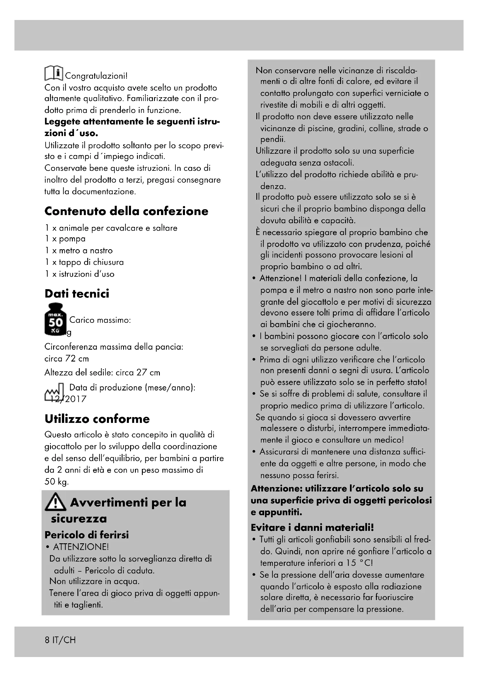 - Se la pressione dell’aria dovesse aumentare quando l’articolo è esposto alla radiazione solare diretta, è necessario far fuoriuscire dell’aria per compensare la pressione. Congratulazioni! Con il vostro acquisto avete scelto un prodotto altamente qualitativo. Familiarizzate con il pro- dotto prima di prenderlo in funzione. Leggete attentamente le seguenti istru- zioni d´uso. Utilizzate il prodotto soltanto per lo scopo previ- sto e i campi d´impiego indicati. Conservate bene queste istruzioni. In caso di inoltro del prodotto a terzi, pregasi consegnare tutta la documentazione. Contenuto della confezione 1 x animale per cavalcare e saltare 1 x pompa 1 x metro a nastro 1 x tappo di chiusura 1 x istruzioni d‘uso Dati tecnici Carico massimo: 50 kg Circonferenza massima della pancia: circa 72 cm Altezza del sedile: circa 27 cm Data di produzione (mese/anno): 12/2017 Utilizzo conforme Questo articolo è stato concepito in qualità di giocattolo per lo sviluppo della coordinazione e del senso dell‘equilibrio, per bambini a partire da 2 anni di età e con un peso massimo di 50 kg. Avvertimenti per la sicurezza Pericolo di ferirsi