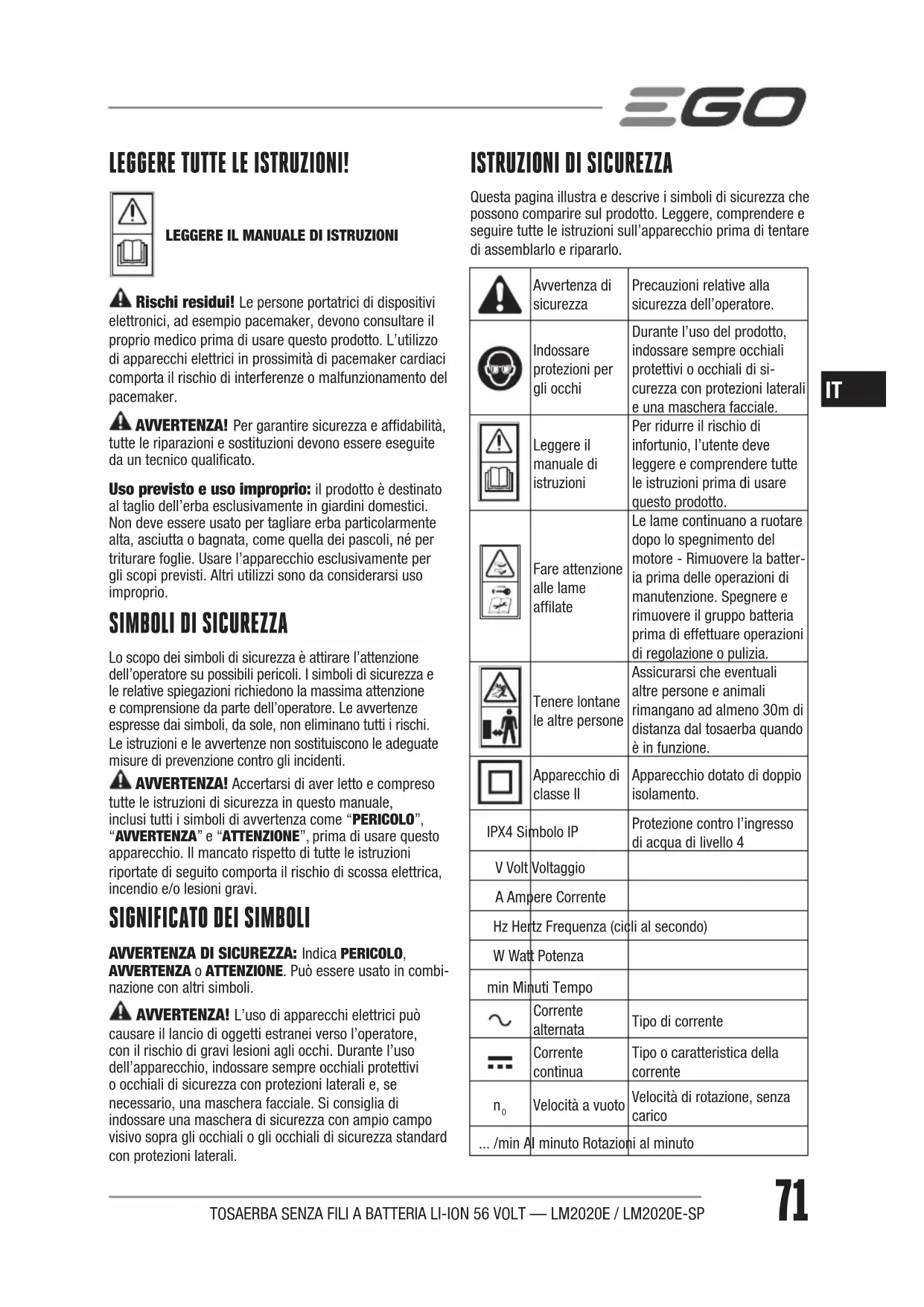 Questa pagina illustra e descrive i simboli di sicurezza che possono comparire sul prodotto. Leggere, comprendere e seguire tutte le istruzioni sull’apparecchio prima di tentare di assemblarlo e ripararlo.Avvertenza di sicurezzaPrecauzioni relative alla sicurezza dell’operatore.Indossare protezioni per gli occhiDurante l’uso del prodotto, indossare sempre occhiali protettivi o occhiali di si-curezza con protezioni laterali e una maschera facciale.Leggere il manuale di istruzioniPer ridurre il rischio di infortunio, l’utente deve leggere e comprendere tutte le istruzioni prima di usare questo prodotto.Fare attenzione alle lame aflateLe lame continuano a ruotare dopo lo spegnimento del motore - Rimuovere la batter-ia prima delle operazioni di manutenzione. Spegnere e rimuovere il gruppo batteria prima di effettuare operazioni di regolazione o pulizia.Tenere lontane le altre personeAssicurarsi che eventuali altre persone e animali rimangano ad almeno 30m di distanza dal tosaerba quando è in funzione.Apparecchio di classe IIApparecchio dotato di doppio isolamento.IPX4 Simbolo IPProtezione contro l’ingresso di acqua di livello 4V Volt VoltaggioA Ampere CorrenteHz Hertz Frequenza (cicli al secondo)W Watt Potenzamin Minuti TempoCorrente alternataTipo di correnteCorrente continuaTipo o caratteristica della corrente