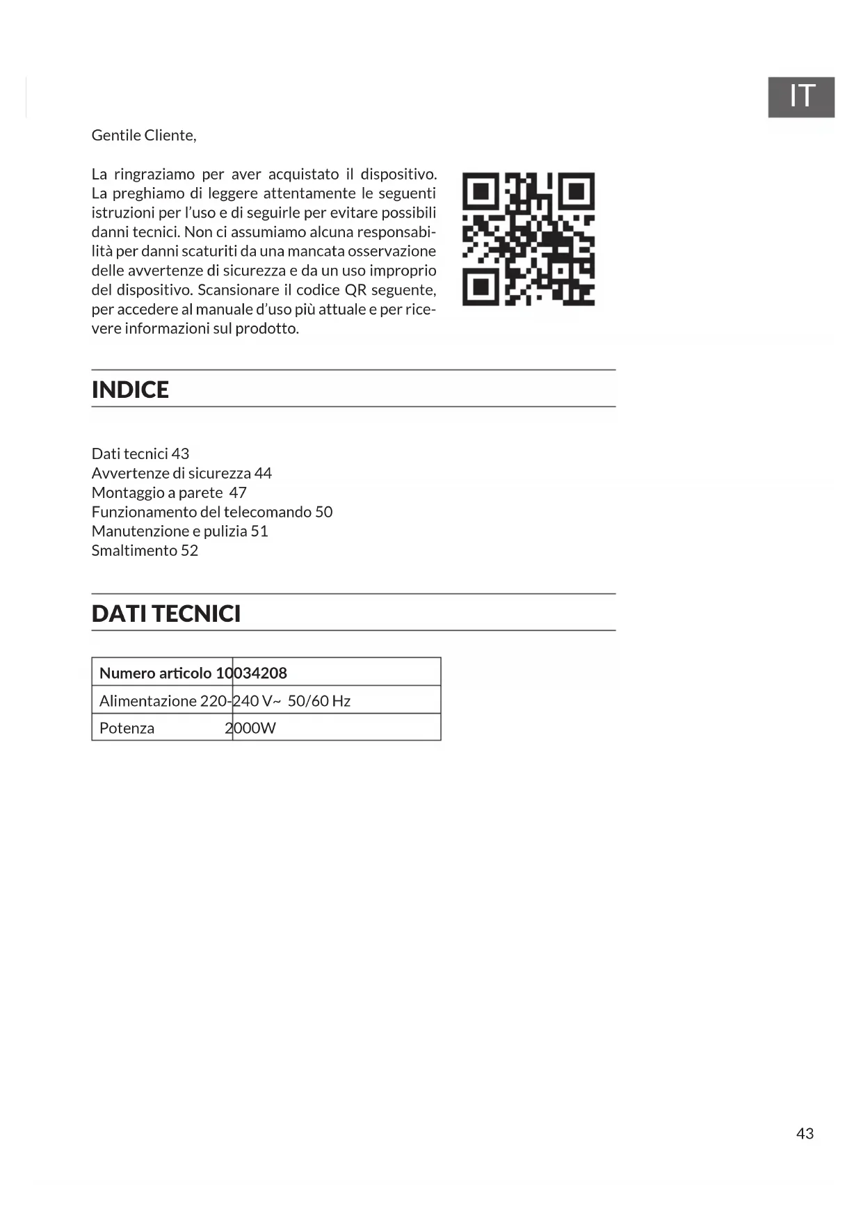 Gentile Cliente, La ringraziamo per aver acquistato il dispositivo. La preghiamo di leggere attentamente le seguenti istruzioni per l’uso e di seguirle per evitare possibili danni tecnici. Non ci assumiamo alcuna responsabi- lità per danni scaturiti da una mancata osservazione delle avvertenze di sicurezza e da un uso improprio del dispositivo. Scansionare il codice QR seguente, per accedere al manuale d’uso più attuale e per rice- vere informazioni sul prodotto. INDICE Dati tecnici 43 Avvertenze di sicurezza 44 Montaggio a parete 47 Funzionamento del telecomando 50 Manutenzione e pulizia 51 Smaltimento 52 DATI TECNICI Numero arcolo 10034208 Alimentazione 220-240 V~ 50/60 Hz Potenza 2000W44