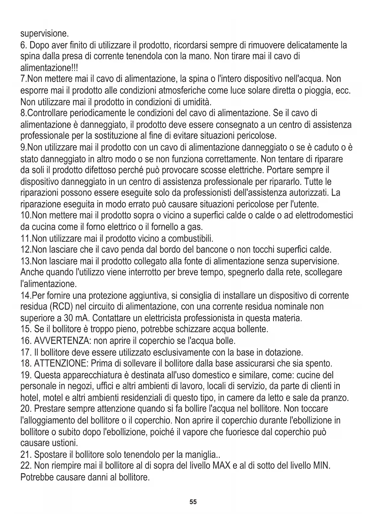 istruzioni. Il produttore non è responsabile per eventuali danni dovuti a un uso improprio. 5.AVVERTENZA: questo dispositivo può essere utilizzato da bambini di età superiore a 8 anni e persone con ridotte capacità fisiche, sensoriali o mentali, o persone senza esperienza o conoscenza del dispositivo, solo sotto la supervisione di una persona responsabile della loro sicurezza, o se sono stati istruiti sull'uso sicuro del dispositivo e sono consapevoli dei pericoli associati al suo funzionamento. I bambini non devono giocare con il dispositivo. La pulizia e la manutenzione del dispositivo non devono essere eseguite da bambini, a meno che non abbiano più di 8 anni e queste attività siano svolte sotto (IT) ITALIANO55 7.Non mettere mai il cavo di alimentazione, la spina o l'intero dispositivo nell'acqua. Non esporre mai il prodotto alle condizioni atmosferiche come luce solare diretta o pioggia, ecc. Non utilizzare mai il prodotto in condizioni di umidità. 10.Non mettere mai il prodotto sopra o vicino a superfici calde o calde o ad elettrodomestici da cucina come il forno elettrico o il fornello a gas. 11.Non utilizzare mai il prodotto vicino a combustibili. 9.Non utilizzare mai il prodotto con un cavo di alimentazione danneggiato o se è caduto o è stato danneggiato in altro modo o se non funziona correttamente. Non tentare di riparare da soli il prodotto difettoso perché può provocare scosse elettriche. Portare sempre il dispositivo danneggiato in un centro di assistenza professionale per ripararlo. Tutte le riparazioni possono essere eseguite solo da professionisti dell'assistenza autorizzati. La riparazione eseguita in modo errato può causare situazioni pericolose per l'utente. 12.Non lasciare che il cavo penda dal bordo del bancone o non tocchi superfici calde. 8.Controllare periodicamente le condizioni del cavo di alimentazione. Se il cavo di alimentazione è danneggiato, il prodotto deve essere consegnato a un centro di assistenza professionale per la sostituzione al fine di evitare situazioni pericolose. 13.Non lasciare mai il prodotto collegato alla fonte di alimentazione senza supervisione. Anche quando l'utilizzo viene interrotto per breve tempo, spegnerlo dalla rete, scollegare l'alimentazione. 14.Per fornire una protezione aggiuntiva, si consiglia di installare un dispositivo di corrente residua (RCD) nel circuito di alimentazione, con una corrente residua nominale non superiore a 30 mA. Contattare un elettricista professionista in questa materia.
