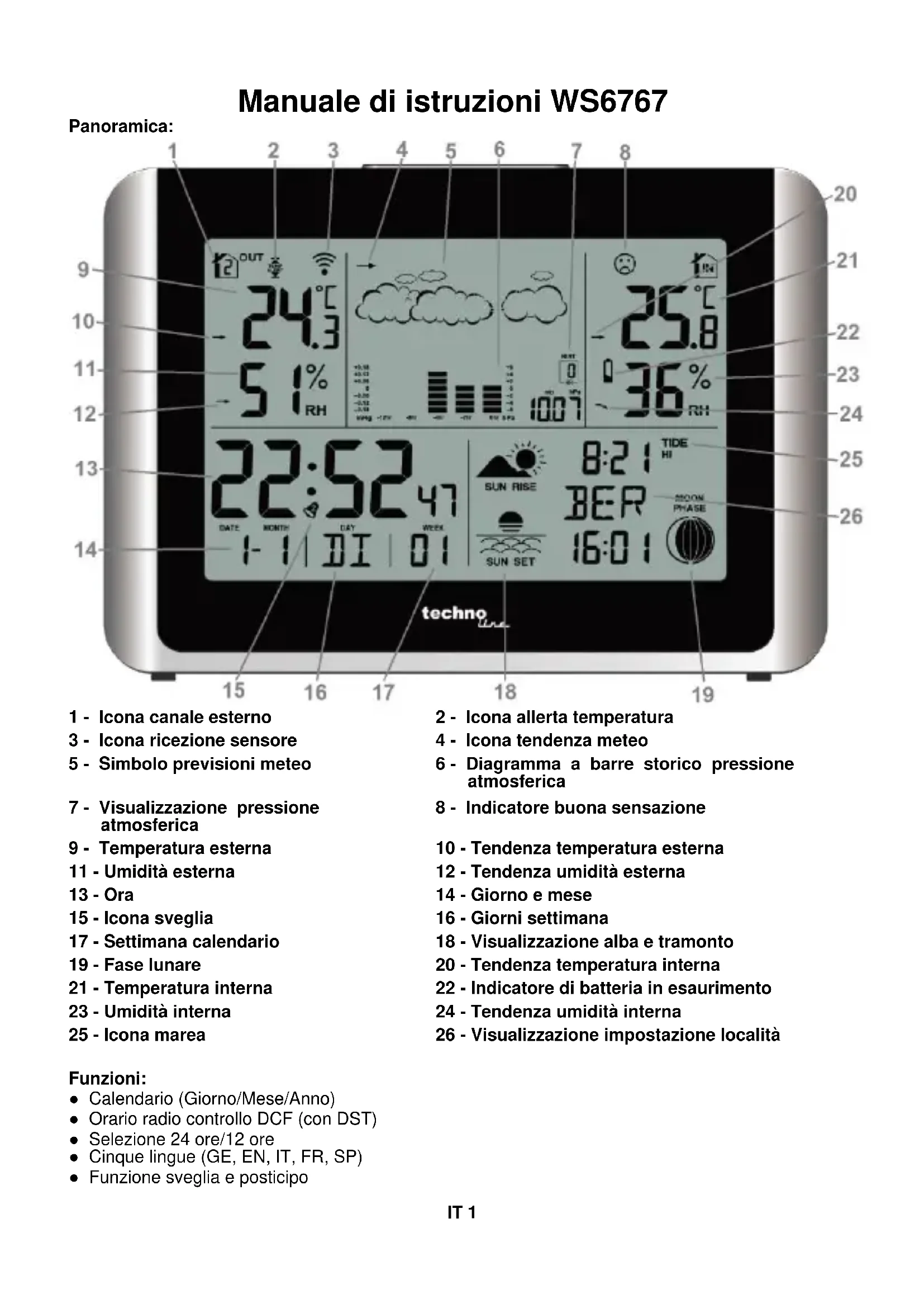 Funzioni: ● Calendario (Giorno/Mese/Anno) ● Orario radio controllo DCF (con DST) ● Selezione 24 ore/12 ore ● Cinque lingue (GE, EN, IT, FR, SP) ● Funzione sveglia e posticipoIT 2 ● Giorni settimana ● °C/°F selezionabile ● Fase lunare ● Temperatura/umidità interna/esterna ● Tendenza temperatura/umidità interna/esterna ● Alba/tramonto ● Indicatore potenza bassa interna/esterna ● Indicatore comfort interno ● Impostazione fuso orario ● Numero di settimana ● Visualizzazione marea alta/media/bassa ● Grafico a barre pressione ● Stazione meteo ● Registrazioni temperatura/umidità interna/esterna Min/Max ● Canale selezionato ● Selezione località ● Avviso temperatura ● Allerta gelo Batterie: Ricevitore (WS6767): 2 X AA Sensore (TX960-TH): 2 X AAA Display LCD intero: