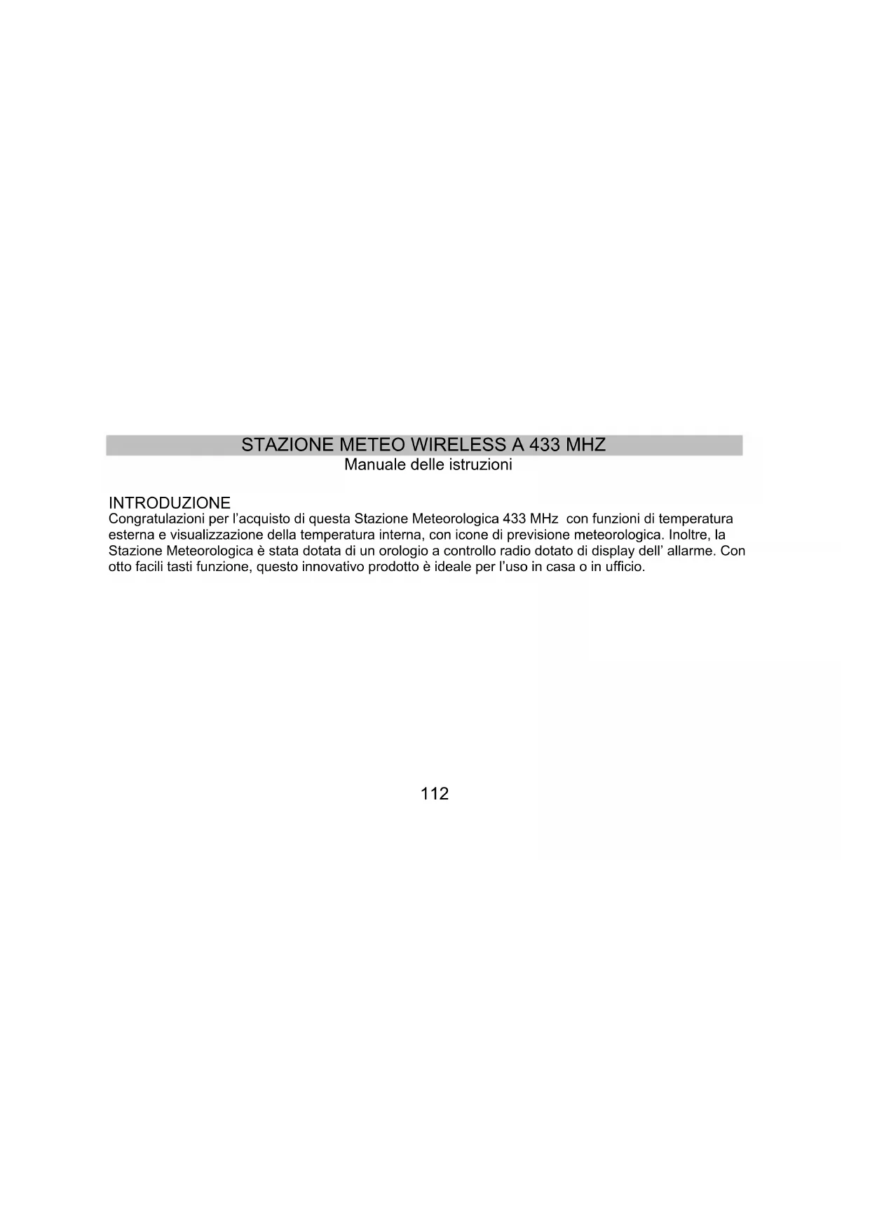 Manuale delle istruzioni INTRODUZIONE Congratulazioni per l’acquisto di questa Stazione Meteorologica 433 MHz con funzioni di temperatura esterna e visualizzazione della temperatura interna, con icone di previsione meteorologica. Inoltre, la Stazione Meteorologica è stata dotata di un orologio a controllo radio dotato di display dell’ allarme. Con otto facili tasti funzione, questo innovativo prodotto è ideale per l’uso in casa o in ufficio.113 Vano batterie Foro per montaggio a muro Supporto Schermo LCDTasti di funzione CARATTERISTICHE: Stazione meteo114