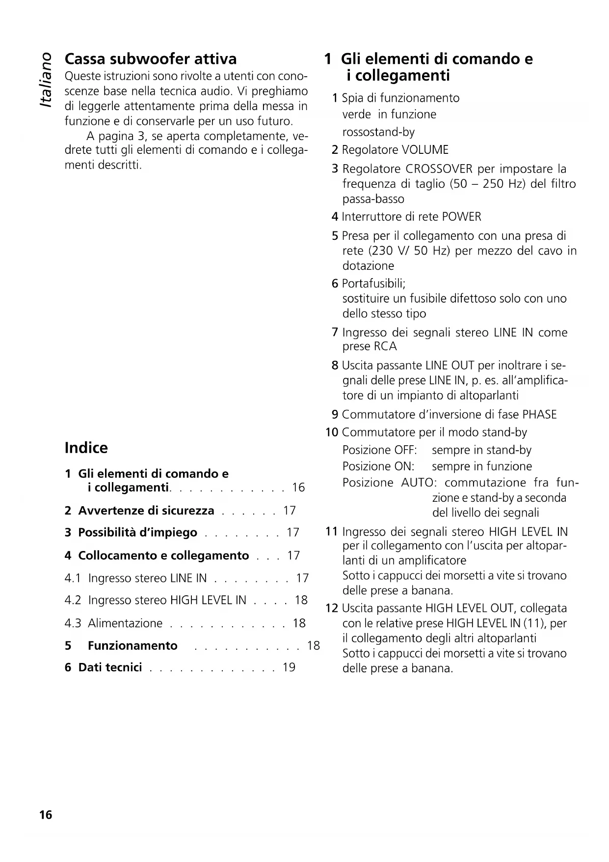 Nel caso d’uso improprio, di collegamenti sbagliati, d’impiego scorretto o di riparazione non a regola d’arte dell’apparecchio, non si assume nessuna responsabilità per eventuali danni consequenziali a persone o a cose e non si assume nessuna garanzia per l’apparecchio. Se si desidera eliminare l’apparecchio definitivamente, consegnarlo per lo smaltimento ad un’istituzione locale per il riciclaggio. 3 Possibilità d’impiego Questo subwoofer attivo compatto serve come integrazione per frequenze basse in impianti di altoparlanti nei settore hifi, home-cinema e ho- me-recording. È equipaggiato con un woofer di 20 cm (8”), e il suo amplificatore ha una potenza di picco di 90 W. Il subwoofer possiede un filtro passa-basso regolabile, un regolatore del volume, una com- mutazione d’inversione di fase attivabile e stand-by automatico. Sono presenti due ingressi stereo (ognuno con uscita passante): un ingresso per il collega- mento con un’uscita con livello Line e un ingresso per il collegamento con un’uscita per altoparlanti. 4 Collocamento e collegamento Collocare il subwoofer su un fondo piano. L’esatta posizione nel centro fra gli altoparlanti stereo non è decisiva con il subwoofer dato che non è possibile localizzare con esattezza le basse frequenze che riproduce. Ma non posizionarlo troppo vicino a pareti o in angoli perché questo fatto falsificherebbe la risposta in frequenza e ostacolerebbe la dissipazione del calore prodotto dall’amplificatore. Anche l’apertura bassreflex sul retro non deve essere coperta. Prima di collegare il subwoofer o di modi- ficare i collegamenti esistenti, spegnere il sub- woofer e gli apparecchi da collegare. Collegare una fonte di segnali con il sub- woofer utilizzando una delle due possibilità di collegamento descritte nei capitoli 4.1 e 4.2.