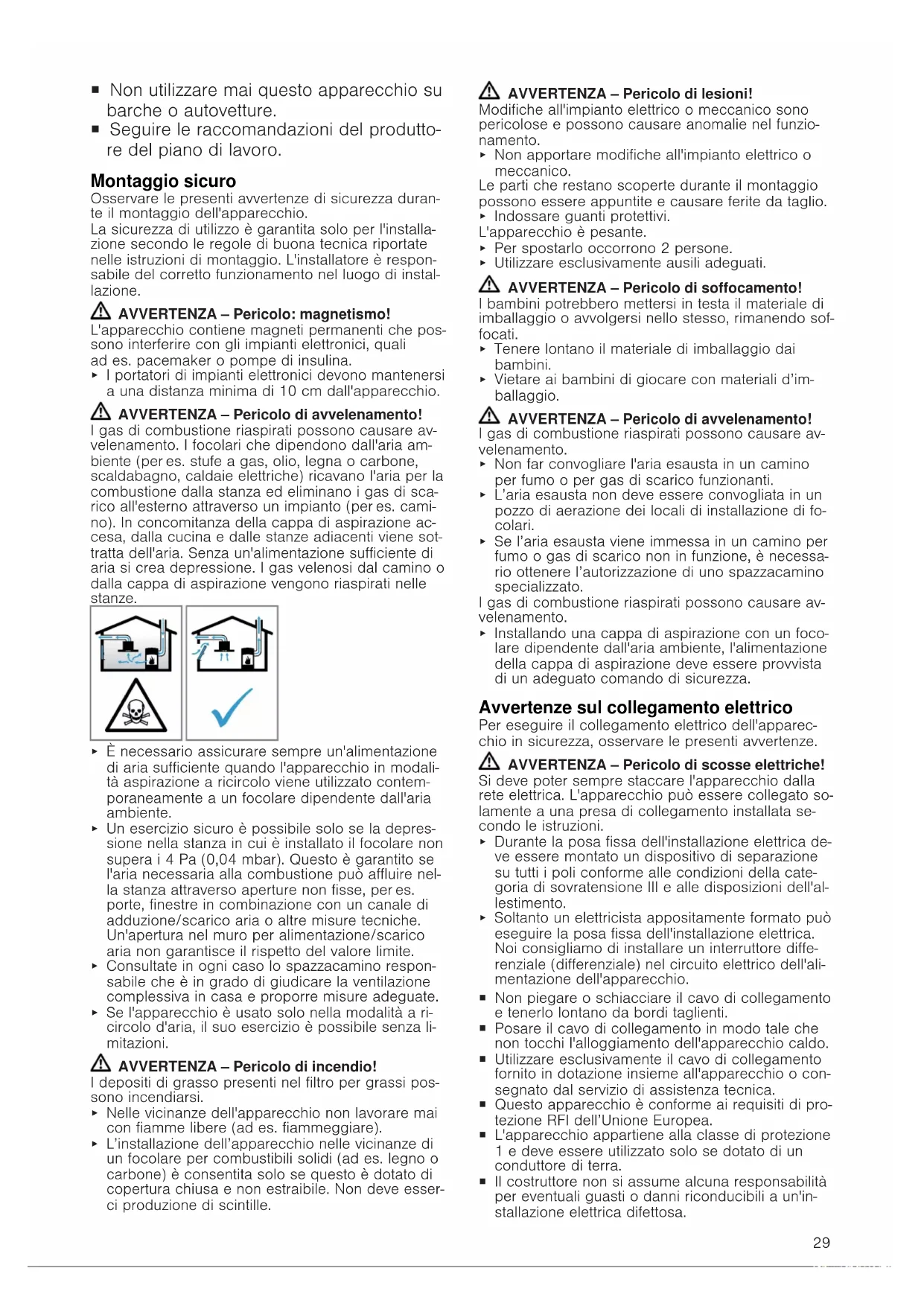 Avvertenze generali ¡ Leggere attentamente le presenti istruzio- ni. ¡ Il collegamento può essere eseguito esclusivamente da un tecnico specializza- to autorizzato. ¡ Prima di eseguire qualsiasi lavoro, stacca- re l'alimentazione della corrente.29 ¡ Non utilizzare mai questo apparecchio su barche o autovetture. ¡ Seguire le raccomandazioni del produtto- re del piano di lavoro. Montaggio sicuro Osservare le presenti avvertenze di sicurezza duran- te il montaggio dell'apparecchio. La sicurezza di utilizzo è garantita solo per l'installa- zione secondo le regole di buona tecnica riportate nelle istruzioni di montaggio. L'installatore è respon- sabile del corretto funzionamento nel luogo di instal- lazione. AVVERTENZA‒Pericolo: magnetismo! L'apparecchio contiene magneti permanenti che pos- sono interferire con gli impianti elettronici, quali ades. pacemaker o pompe di insulina. ▶ I portatori di impianti elettronici devono mantenersi a una distanza minima di 10cm dall'apparecchio. AVVERTENZA‒Pericolo di avvelenamento! I gas di combustione riaspirati possono causare av- velenamento. I focolari che dipendono dall'aria am- biente (per es. stufe a gas, olio, legna o carbone, scaldabagno, caldaie elettriche) ricavano l'aria per la combustione dalla stanza ed eliminano i gas di sca- rico all'esterno attraverso un impianto (per es. cami- no). In concomitanza della cappa di aspirazione ac- cesa, dalla cucina e dalle stanze adiacenti viene sot- tratta dell'aria. Senza un'alimentazione sufficiente di aria si crea depressione. I gas velenosi dal camino o dalla cappa di aspirazione vengono riaspirati nelle stanze. ▶ È necessario assicurare sempre un'alimentazione di aria sufficiente quando l'apparecchio in modali- tà aspirazione a ricircolo viene utilizzato contem- poraneamente a un focolare dipendente dall'aria ambiente. ▶ Un esercizio sicuro è possibile solo se la depres- sione nella stanza in cui è installato il focolare non supera i 4 Pa (0,04 mbar). Questo è garantito se l'aria necessaria alla combustione può affluire nel- la stanza attraverso aperture non fisse, per es. porte, finestre in combinazione con un canale di adduzione/scarico aria o altre misure tecniche. Un'apertura nel muro per alimentazione/scarico aria non garantisce il rispetto del valore limite. ▶ Consultate in ogni caso lo spazzacamino respon- sabile che è in grado di giudicare la ventilazione complessiva in casa e proporre misure adeguate. ▶ Se l'apparecchio è usato solo nella modalità a ri- circolo d'aria, il suo esercizio è possibile senza li- mitazioni. AVVERTENZA‒Pericolo di incendio! I depositi di grasso presenti nel filtro per grassi pos- sono incendiarsi. ▶ Nelle vicinanze dell'apparecchio non lavorare mai con fiamme libere (ad es. fiammeggiare). ▶ L’installazione dell’apparecchio nelle vicinanze di un focolare per combustibili solidi (ad es. legno o carbone) è consentita solo se questo è dotato di copertura chiusa e non estraibile. Non deve esser- ci produzione di scintille. AVVERTENZA‒Pericolo di lesioni! Modifiche all'impianto elettrico o meccanico sono pericolose e possono causare anomalie nel funzio- namento. ▶ Non apportare modifiche all'impianto elettrico o meccanico. Le parti che restano scoperte durante il montaggio possono essere appuntite e causare ferite da taglio. ▶ Indossare guanti protettivi. L'apparecchio è pesante. ▶ Per spostarlo occorrono 2 persone. ▶ Utilizzare esclusivamente ausili adeguati. AVVERTENZA‒Pericolo di soffocamento! I bambini potrebbero mettersi in testa il materiale di imballaggio o avvolgersi nello stesso, rimanendo sof- focati. ▶ Tenere lontano il materiale di imballaggio dai bambini. ▶ Vietare ai bambini di giocare con materiali d’im- ballaggio. AVVERTENZA‒Pericolo di avvelenamento! I gas di combustione riaspirati possono causare av- velenamento. ▶ Non far convogliare l'aria esausta in un camino per fumo o per gas di scarico funzionanti. ▶ L’aria esausta non deve essere convogliata in un pozzo di aerazione dei locali di installazione di fo- colari. ▶ Se l’aria esausta viene immessa in un camino per fumo o gas di scarico non in funzione, è necessa- rio ottenere l’autorizzazione di uno spazzacamino specializzato. I gas di combustione riaspirati possono causare av- velenamento. ▶ Installando una cappa di aspirazione con un foco- lare dipendente dall'aria ambiente, l'alimentazione della cappa di aspirazione deve essere provvista di un adeguato comando di sicurezza. Avvertenze sul collegamento elettrico Per eseguire il collegamento elettrico dell'apparec- chio in sicurezza, osservare le presenti avvertenze. AVVERTENZA‒Pericolo di scosse elettriche! Si deve poter sempre staccare l'apparecchio dalla rete elettrica. L'apparecchio può essere collegato so- lamente a una presa di collegamento installata se- condo le istruzioni. ▶ Durante la posa fissa dell'installazione elettrica de- ve essere montato un dispositivo di separazione su tutti i poli conforme alle condizioni della cate- goria di sovratensione III e alle disposizioni dell'al- lestimento. ▶ Soltanto un elettricista appositamente formato può eseguire la posa fissa dell'installazione elettrica. Noi consigliamo di installare un interruttore diffe- renziale (differenziale) nel circuito elettrico dell'ali- mentazione dell'apparecchio. ¡ Non piegare o schiacciare il cavo di collegamento e tenerlo lontano da bordi taglienti. ¡ Posare il cavo di collegamento in modo tale che non tocchi l'alloggiamento dell'apparecchio caldo. ¡ Utilizzare esclusivamente il cavo di collegamento fornito in dotazione insieme all'apparecchio o con- segnato dal servizio di assistenza tecnica. ¡ Questo apparecchio è conforme ai requisiti di pro- tezione RFI dell’Unione Europea. ¡ L'apparecchio appartiene alla classe di protezione 1 e deve essere utilizzato solo se dotato di un conduttore di terra. ¡ Il costruttore non si assume alcuna responsabilità per eventuali guasti o 