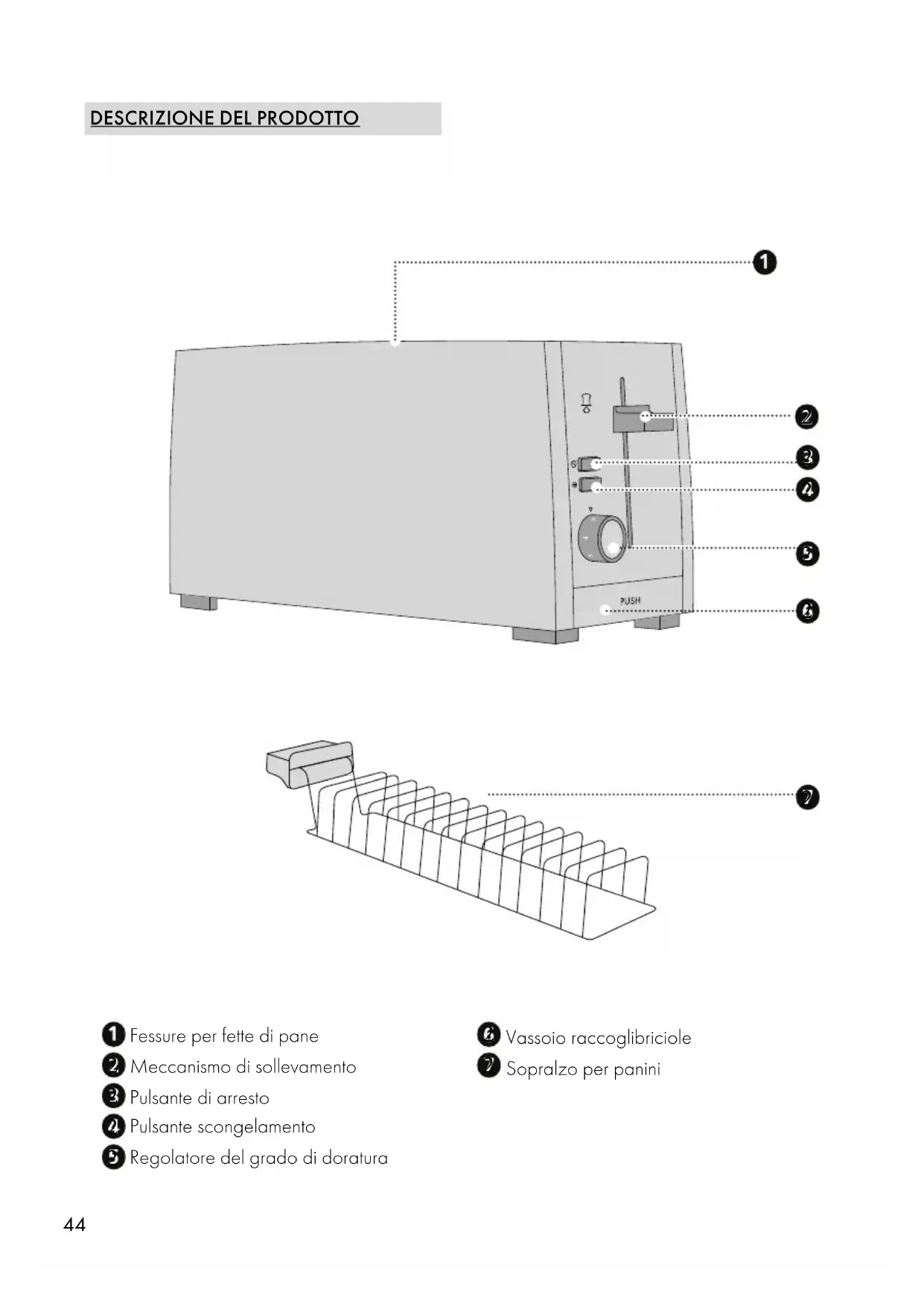 ● Premere il pulsante di arresto. ● Il processo di tostatura viene interrotto. RISCALDARE PANINI Per riscaldare i panini, procedere come segue: ● Sistemare il sopralzo per panini sul dispositivo. ● Posare i panini sul sopralzo per panini. ● Impostare il regolatore per i gradi di doratura sul simbolo dei panini. ● Spingere la leva di sollevamento verso il basso finché non si blocca in posizione. ● Quando la leva di sollevamento si ritrova di nuovo in alto, girare il panino su sé stesso e ripetere la procedura. Durante la procedura, il sopralzo per panini diventa molto caldo. Afferrarlo, quindi, utilizzando esclusivamente l'apposita impugnatura. PULIZIA ● Pulire le superfici esterne dell'apparecchio con un panno morbido inumidito. In caso di sporco tenace è possibile usare un detergente delicato. ● Le briciole che cadono vengono raccolte nel vassoio raccoglibriciole. ● Per estrarre il vassoio raccoglibriciole, premere il pulsante "Push". ● Estrarre il vassoio raccoglibriciole e rimuoverne il contenuto. ● Reinserire il vassoio raccoglibriciole.