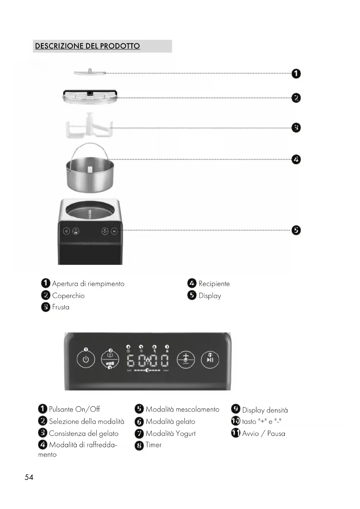 Lasciare il dispositivo nella sua posizione finale per almeno 2 ore prima dell'uso per permettere al liquido refrigerante nel compressore di stabilizzarsi. ● Preparare gli ingredienti secondo la ricetta desiderata. Le miscele di gelato che devono essere prima cotte, devono essere preparate il giorno prima in modo che abbiano abba- stanza tempo per raffreddarsi. ● Versare la miscela di gelato nel contenitore rimovibile, quindi inserirlo in posizione. Il conte- nitore non deve essere riempito per più di 2/3 (Max ), in quanto la miscela di gelato si espande durante il processo di raffreddamento. ● Inserire la frusta nel contenitore rimovibile assicurandosi di farla roteare leggermente, in modo che affondi nella posizione corretta. ● Posizionare il coperchio trasparente sul dispositivo e bloccarlo girandolo in senso antiorario. ● Inserire la spina nella presa di corrente. Sul display appare “- -”. ● Accendere il dispositivo . ● Il dispositivo si avvia in modalità gelato. Sul display appare il timer (60:00).