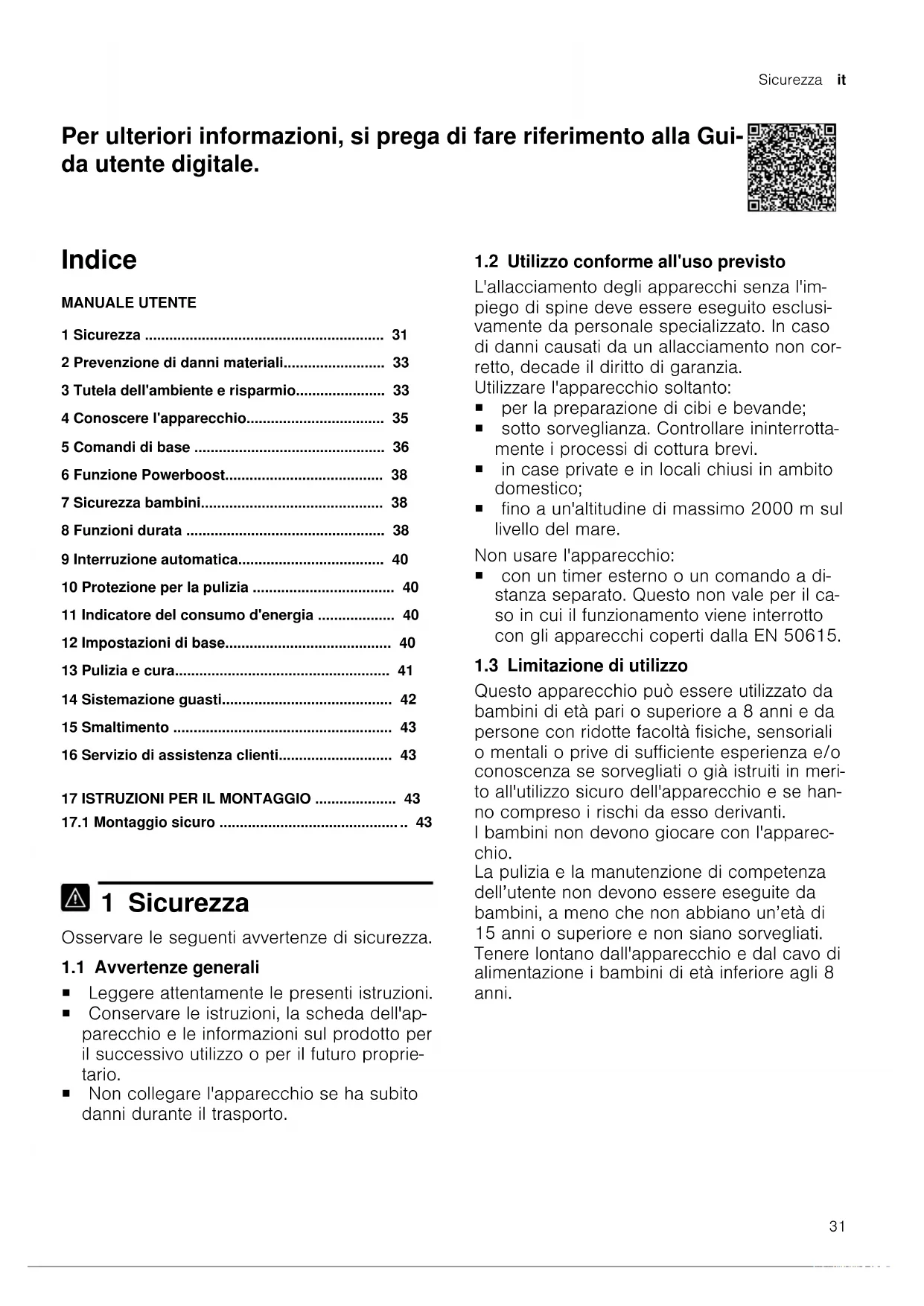 1 Sicurezza Osservare le seguenti avvertenze di sicurezza. 1.1 Avvertenze generali ¡ Leggere attentamente le presenti istruzioni. ¡ Conservare le istruzioni, la scheda dell'ap- parecchio e le informazioni sul prodotto per il successivo utilizzo o per il futuro proprie- tario. ¡ Non collegare l'apparecchio se ha subito danni durante il trasporto. 1.2 Utilizzo conforme all'uso previsto L'allacciamento degli apparecchi senza l'im- piego di spine deve essere eseguito esclusi- vamente da personale specializzato. In caso di danni causati da un allacciamento non cor- retto, decade il diritto di garanzia. Utilizzare l'apparecchio soltanto: ¡ per la preparazione di cibi e bevande; ¡ sotto sorveglianza. Controllare ininterrotta- mente i processi di cottura brevi. ¡ in case private e in locali chiusi in ambito domestico; ¡ fino a un'altitudine di massimo 2000m sul livello del mare. Non usare l'apparecchio: ¡ con un timer esterno o un comando a di- stanza separato. Questo non vale per il ca- so in cui il funzionamento viene interrotto con gli apparecchi coperti dalla EN50615. 1.3 Limitazione di utilizzo Questo apparecchio può essere utilizzato da bambini di età pari o superiore a 8 anni e da persone con ridotte facoltà fisiche, sensoriali o mentali o prive di sufficiente esperienza e/o conoscenza se sorvegliati o già istruiti in meri- to all'utilizzo sicuro dell'apparecchio e se han- no compreso i rischi da esso derivanti. I bambini non devono giocare con l'apparec- chio. La pulizia e la manutenzione di competenza dell’utente non devono essere eseguite da bambini, a meno che non abbiano un’età di 15 anni o superiore e non siano sorvegliati. Tenere lontano dall'apparecchio e dal cavo di alimentazione i bambini di età inferiore agli 8 anni.it Sicurezza