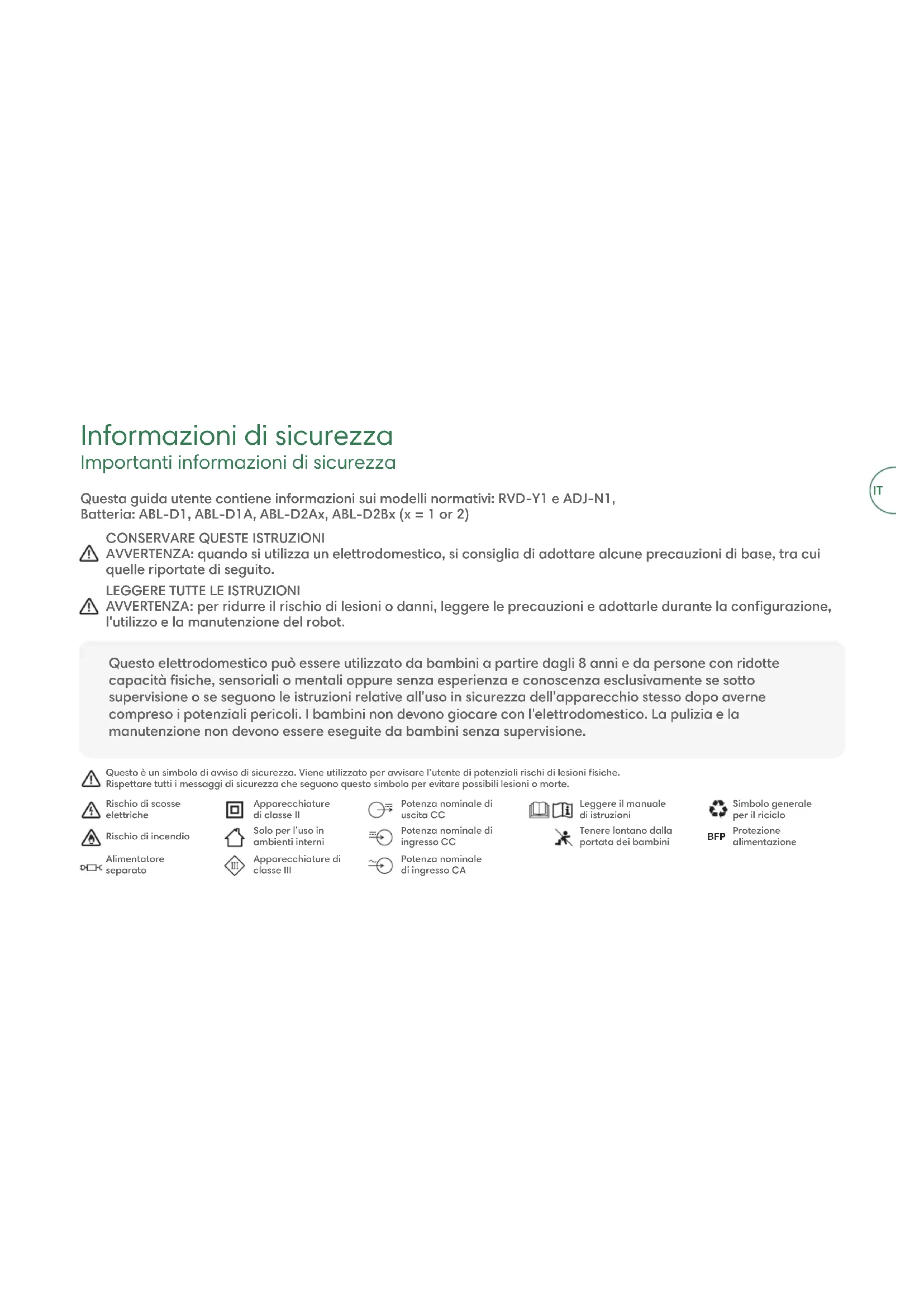AVVERTENZA: per ridurre il rischio di lesioni o danni, leggere le precauzioni e adottarle durante la congurazione, l'utilizzo e la manutenzione del robot. Questa guida utente contiene informazioni sui modelli normativi: RVD-Y1 e ADJ-N1, Batteria: ABL-D1, ABL-D1A, ABL-D2Ax, ABL-D2Bx (x = 1 or 2) Questo è un simbolo di avviso di sicurezza. Viene utilizzato per avvisare l’utente di potenziali rischi di lesioni siche. Rispettare tutti i messaggi di sicurezza che seguono questo simbolo per evitare possibili lesioni o morte. Rischio di scosse elettriche Apparecchiature diclasse II Potenza nominale di uscita CC Leggere il manuale diistruzioni Simbolo generale peril riciclo Rischio di incendio Solo per l’uso in ambienti interni Potenza nominale di ingresso CC Tenere lontano dalla portata dei bambini BFP Protezione alimentazione Alimentatore separato Apparecchiature di classe III Potenza nominale diingresso CA ITAVVERTENZA: indica una situazione pericolosa che, se non evitata, potrebbe provocare la morte o lesioni gravi. ATTENZIONE: indica una situazione pericolosa che, se non evitata, potrebbe provocare lesioni lievi o moderate. AVVISO : indica una situazione pericolosa che, se non evitata, potrebbe provocare danni materiali. ISTRUZIONI GENERALI AVVERTENZA