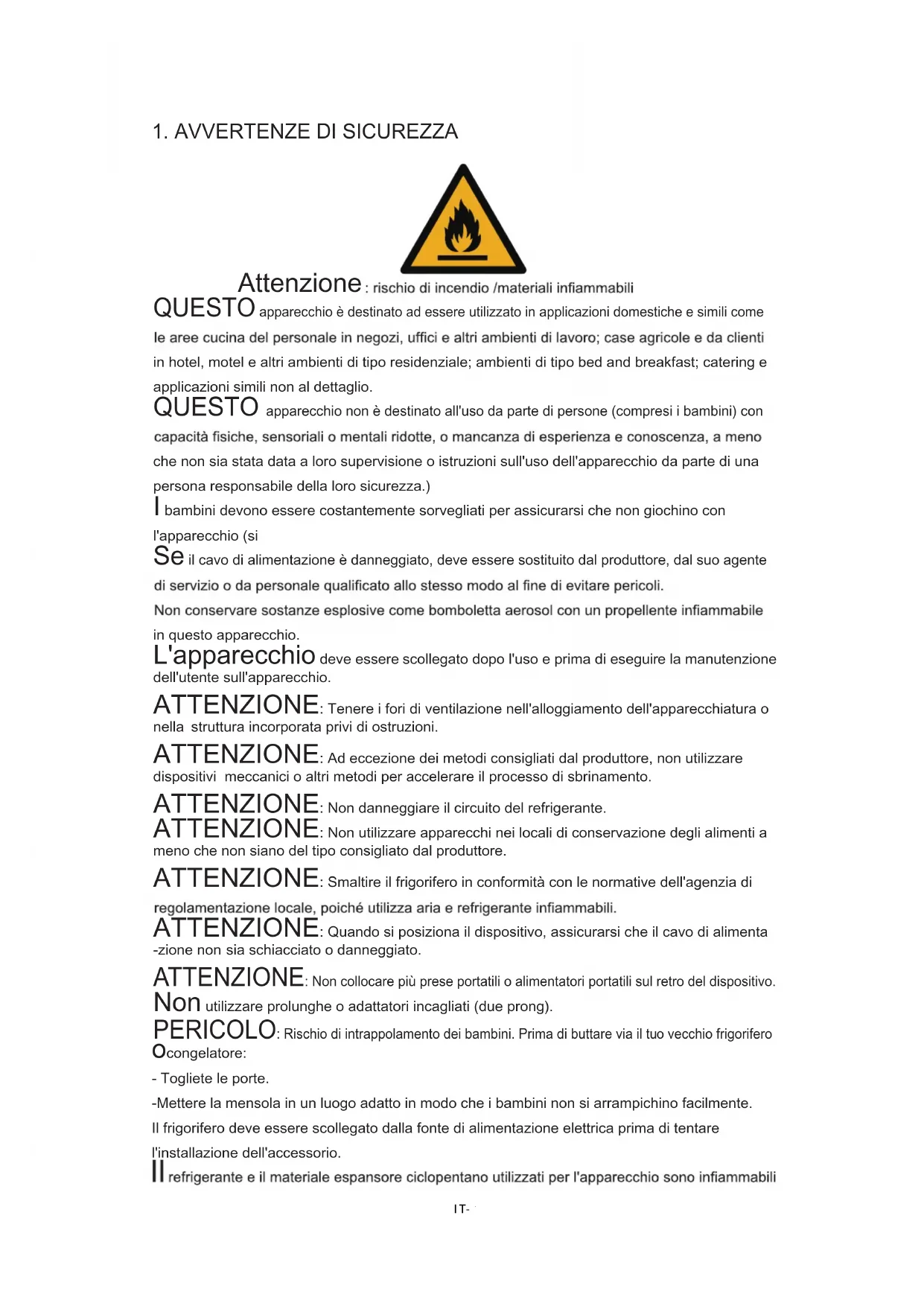 Gentili utenti, grazie per aver scelto il frigorifero Midea!1. AVVERTENZE DI SICUREZZA Attenzione QUESTO apparecchio è destinato ad essere utilizzato in applicazioni domestiche e simili come in hotel, motel e altri ambienti di tipo residenziale; ambienti di tipo bed and breakfast; catering e applicazioni simili non al dettaglio. QUESTO apparecchio non è destinato all'uso da parte di persone (compresi i bambini) con che non sia stata data a loro supervisione o istruzioni sull'uso dell'apparecchio da parte di una persona responsabile della loro sicurezza.) I bambini devono essere costantemente sorvegliati per assicurarsi che non giochino con l'apparecchio (si Se il cavo di alimentazione è danneggiato, deve essere sostituito dal produttore, dal suo agente in questo apparecchio. L'apparecchio deve essere scollegato dopo l'uso e prima di eseguire la manutenzione dell'utente sull'apparecchio. ATTENZIONE: Tenere i fori di ventilazione nell'alloggiamento dell'apparecchiatura o nella struttura incorporata privi di ostruzioni. ATTENZIONE: Ad eccezione dei metodi consigliati dal produttore, non utilizzare dispositivi meccanici o altri metodi per accelerare il processo di sbrinamento. ATTENZIONE: Non danneggiare il circuito del refrigerante. ATTENZIONE: Non utilizzare apparecchi nei locali di conservazione degli alimenti a meno che non siano del tipo consigliato dal produttore. ATTENZIONE: Smaltire il frigorifero in conformità con le normative dell'agenzia di ATTENZIONE: Quando si posiziona il dispositivo, assicurarsi che il cavo di alimenta -zione non sia schiacciato o danneggiato. ATTENZIONE: Non collocare più prese portatili o alimentatori portatili sul retro del dispositivo. Non utilizzare prolunghe o adattatori incagliati (due prong). PERICOLO: Rischio di intrappolamento dei bambini. Prima di buttare via il tuo vecchio frigorifero ocongelatore: - Togliete le porte. -Mettere la mensola in un luogo adatto in modo che i bambini non si arrampichino facilmente. Il frigorifero deve essere scollegato dalla fonte di alimentazione elettrica prima di tentare l'installazione dell'accessorio. IT-1Pertanto, quando viene rottamato, deve essere tenuto lontano dalla fonte del fuoco e riciclato combustione è consentito per evitare danni all'ambiente o altri danni. o mentali ridotte o con mancanza di esperienza e conoscenza possono utilizzare questa apparecchiatura, a condizione che abbiano ricevuto supervisione o guida sull'uso sicuro di questa apparecchiatura e comprendano i pericoli coinvolti. I bambini non devono giocare con l'apparecchio. La pulizia e la manutenzione dell'utente non devono essere eseguite da bambini senza supervisione. I bambini dai 3 agli 8 anni possono caricare e scaricare le apparecchiature di refrigerazione. È necessario che per porte o coperchi dotati di serrature e chiavi, le chiavi siano tenute fuori bambini rimangano chiusi all'interno. Per evitare la contaminazione degli alimenti, si prega di rispettare le seguenti istruzioni: