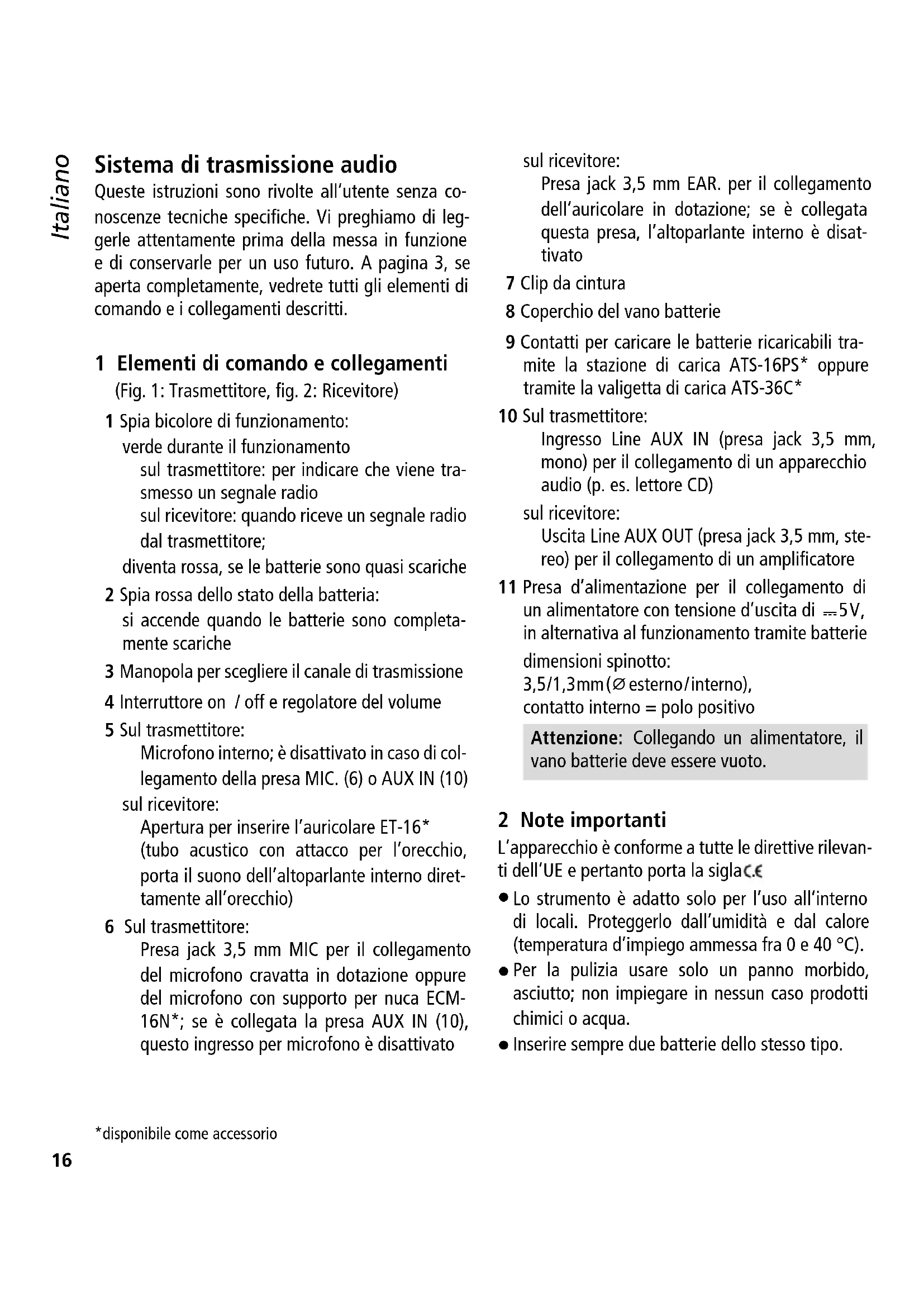 INTERNATIONAL GmbH & Co. KG. Toute reproduction même partielle à des fins commerciales est interdite.16 Italiano Deutsch Deutsch Seite Inhalt English English Page Contents Français Français Page Table des matières Español Español Página Contenidos Nederlands Nederlands Pagina Inhoud Polski Polski Strona Spis treści Magyar Magyar Oldal Italiano Italiano Pagina Indice Sistema di trasmissione audio Queste istruzioni sono rivolte all‘utente senza co- noscenze tecniche specifiche. Vi preghiamo di leg- gerle attentamente prima della messa in funzione e di conservarle per un uso futuro. A pagina 3, se aperta completamente, vedrete tutti gli elementi di comando e i collegamenti descritti. 1 Elementi di comando e collegamenti (Fig. 1: Trasmettitore, fig. 2: Ricevitore) 1 Spia bicolore di funzionamento: verde durante il funzionamento sul trasmettitore: per indicare che viene tra- smesso un segnale radio sul ricevitore: quando riceve un segnale radio dal trasmettitore; diventa rossa, se le batterie sono quasi scariche 2 Spia rossa dello stato della batteria: si accende quando le batterie sono completa- mente scariche 3 Manopola per scegliere il canale di trasmissione 4 Interruttore on / off e regolatore del volume 5 Sul trasmettitore: Microfono interno; è disattivato in caso di col- legamento della presa MIC. (6) o AUX IN (10) sul ricevitore: Apertura per inserire l’auricolare ET-16* (tubo acustico con attacco per l’orecchio, porta il suono dell’altoparlante interno diret- tamente all’orecchio) 6 Sul trasmettitore: Presa jack 3,5 mm MIC per il collegamento del microfono cravatta in dotazione oppure del microfono con supporto per nuca ECM- 16N*; se è collegata la presa AUX IN (10), questo ingresso per microfono è disattivato sul ricevitore: Presa jack 3,5 mm EAR. per il collegamento dell’auricolare in dotazione; se è collegata questa presa, l’altoparlante interno è disat- tivato 7 Clip da cintura 8 Coperchio del vano batterie 9 Contatti per caricare le batterie ricaricabili tra- mite la stazione di carica ATS-16PS* oppure tramite la valigetta di carica ATS-36C* 10 Sul trasmettitore: Ingresso Line AUX IN (presa jack 3,5 mm, mono) per il collegamento di un apparecchio audio (p. es. lettore CD) sul ricevitore: Uscita Line AUX OUT (presa jack 3,5 mm, ste- reo) per il collegamento di un amplificatore 11 Presa d’alimentazione per il collegamento di un alimentatore con tensione d’uscita di