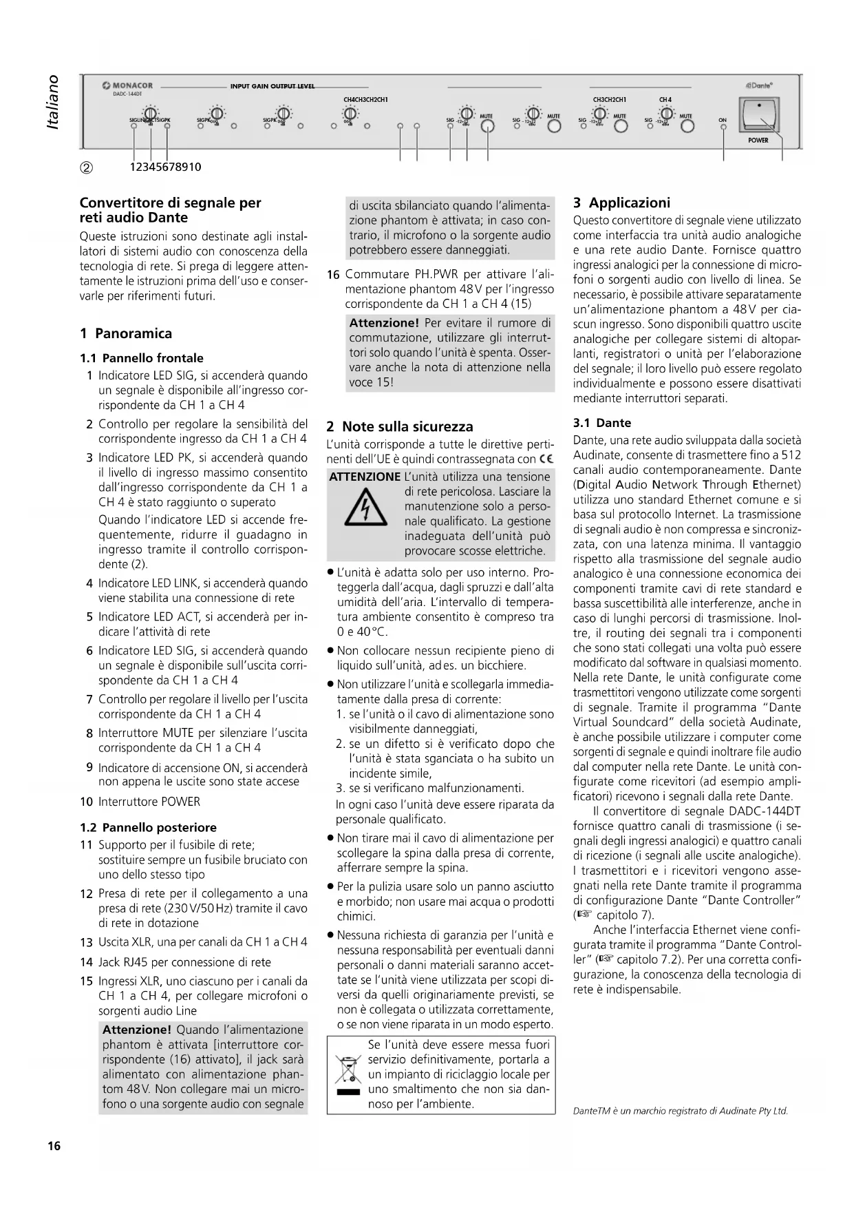 Convertitore di segnale per retiaudio Dante Queste istruzioni sono destinate agli instal- latori di sistemi audio con conoscenza della tecnologia di rete. Si prega di leggere atten- tamente le istruzioni prima dell’uso e conser- varle per riferimenti futuri. 1 Panoramica