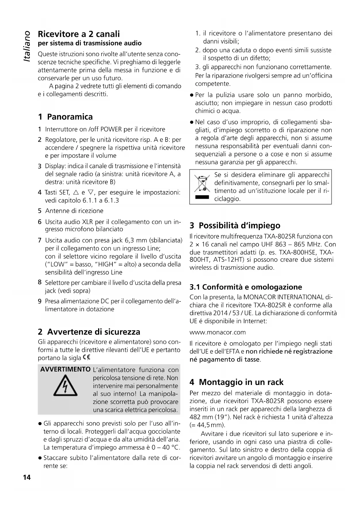 Nel caso d’uso improprio, di collegamenti sba- gliati, d’impiego scorretto o di riparazione non a regola d’arte degli apparecchi, non si assume nessuna responsabilità per eventuali danni con- sequenziali a persone o a cose e non si assume nessuna garanzia per gli apparecchi. Se si desidera eliminare gli apparecchi definitivamente, consegnarli per lo smal- timento ad un‘istituzione locale per il ri- ciclaggio. 3 Possibilità d‘impiego Il ricevitore multifrequenza TXA-802SR funziona con 2 × 16 canali nel campo UHF 863 – 865 MHz. Con due trasmettitori adatti (p. es. TXA-800HSE, TXA- 800HT, ATS-12HT) si possono creare due sistemi wireless di trasmissione audio.